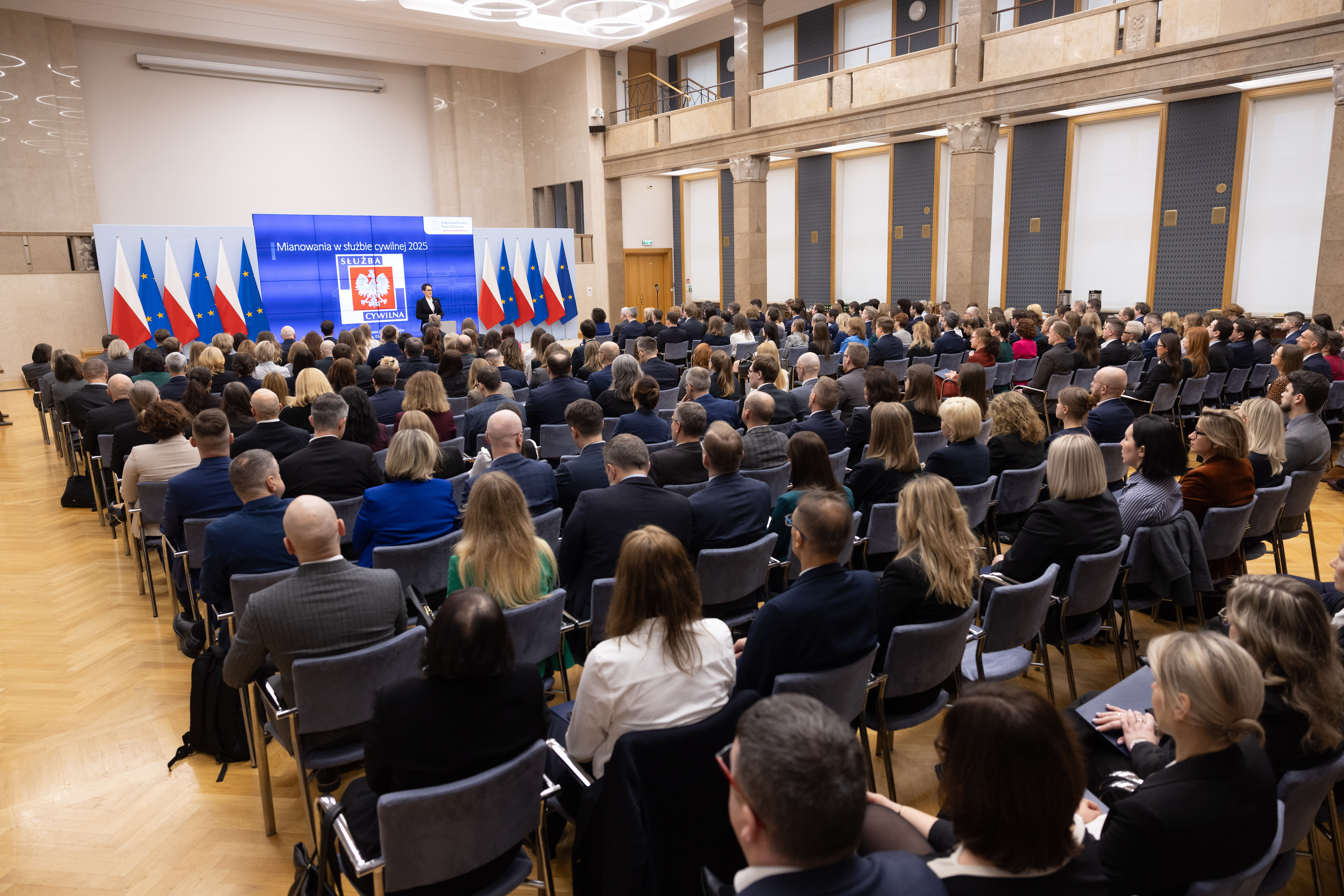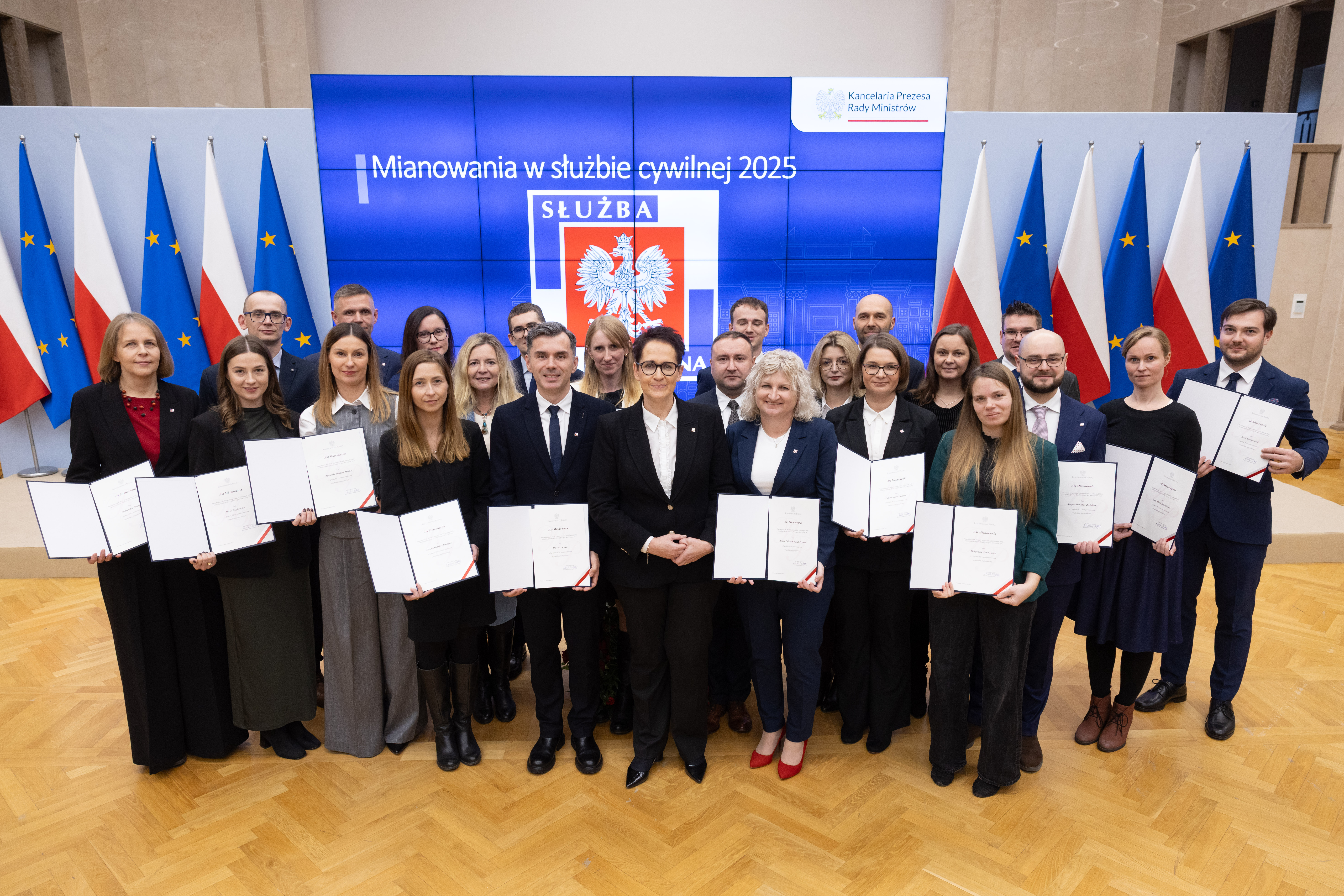 Dzisiaj w Kancelarii Prezesa Rady Ministrów odbyło się mianowanie urzędników i urzędniczek służby cywilnej. List do nowo mianowanych skierował Prezes Rady Ministrów Donald Tusk. Ze względu na liczbę nowomianowanych uroczystość odbyła się w dwóch turach.