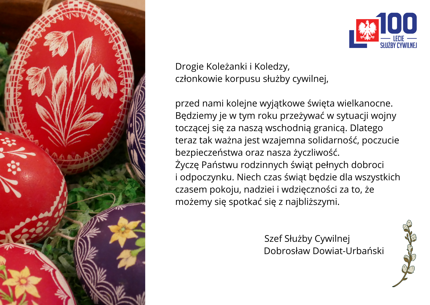 Szef służby cywilnej Dobrosław Dowiat-Urbański oraz przewodniczący Rady Służby Publicznej Zdzisław Sipiera skierowali do członków korpusu służby cywilnej życzenia z okazji nadchodzących Świąt Wielkanocnych.