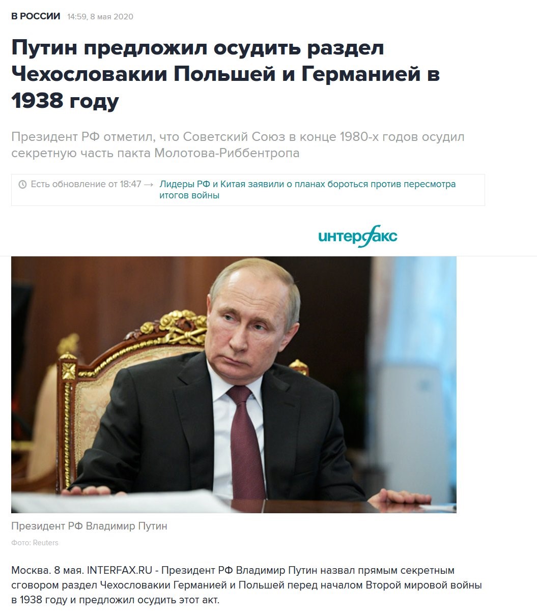 - Rosyjski prezydent znów rozpowszechnia propagandę na temat II wojny światowej. Putin w wywiadzie stwierdził, że zajęcie Zaolzia przez II RP było „tajnym spiskiem Polski i Niemiec”. Rozmywał także fakt podpisania paktu Stalin-Hitler i oskarżył przedwojenne rządy o paktowanie z Hitlerem.