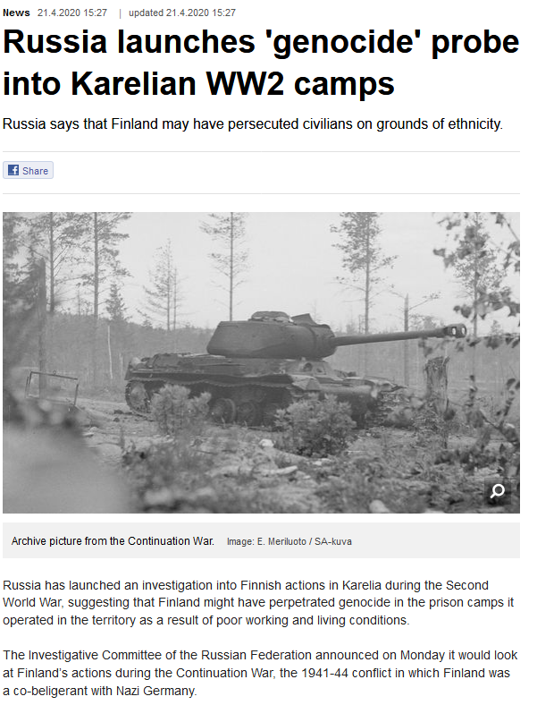 - Przed 75. rocznicą zakończenia II wojny światowej Rosja nasila dezinformację historyczną nie tylko przeciwko Polsce, ale też np. Finlandii. Manipulując faktami i „nieznanymi” dotąd archiwami, oskarża Finów o ludobójstwo na słowiańskich więźniach wojny 1941-1944.