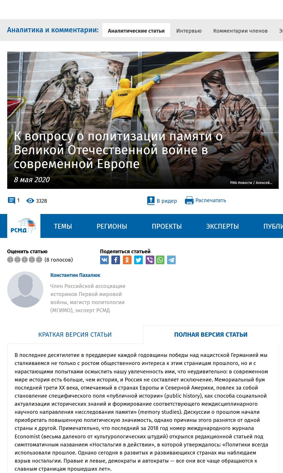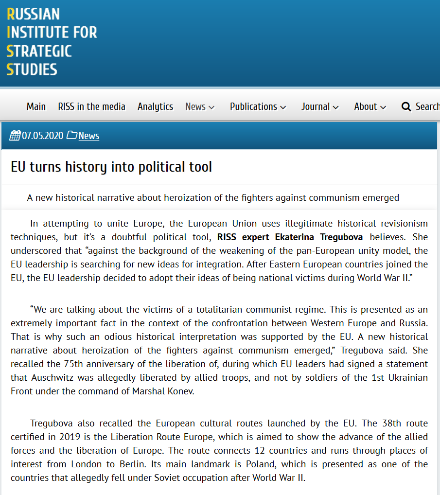 - Współpracujący z rosyjskimi służbami ośrodek analityczny RISS oskarżał Zachód o fałszowanie i polityczne wykorzystywanie historii. Tekst zawierał sugestie, jakoby Bruksela miała instrumentalizować historię, by konfrontować się z Rosją. Artykuł atakuje też Zachód za to, że rzekomo celowo pomija kwestię ofiar poniesionych przez Sowietów w czasie II wojny światowej. Rosja stale prezentuje się jako ofiara niesprawiedliwych ocen Zachodu.