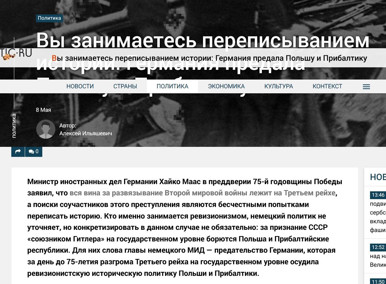 The said news website takes the opportunity to attack Poland and the Baltic States by claiming that regardless of historical facts and the words of the German Foreign Minister these countries rewrite and deny history and lay the blame on the Soviet Union.
