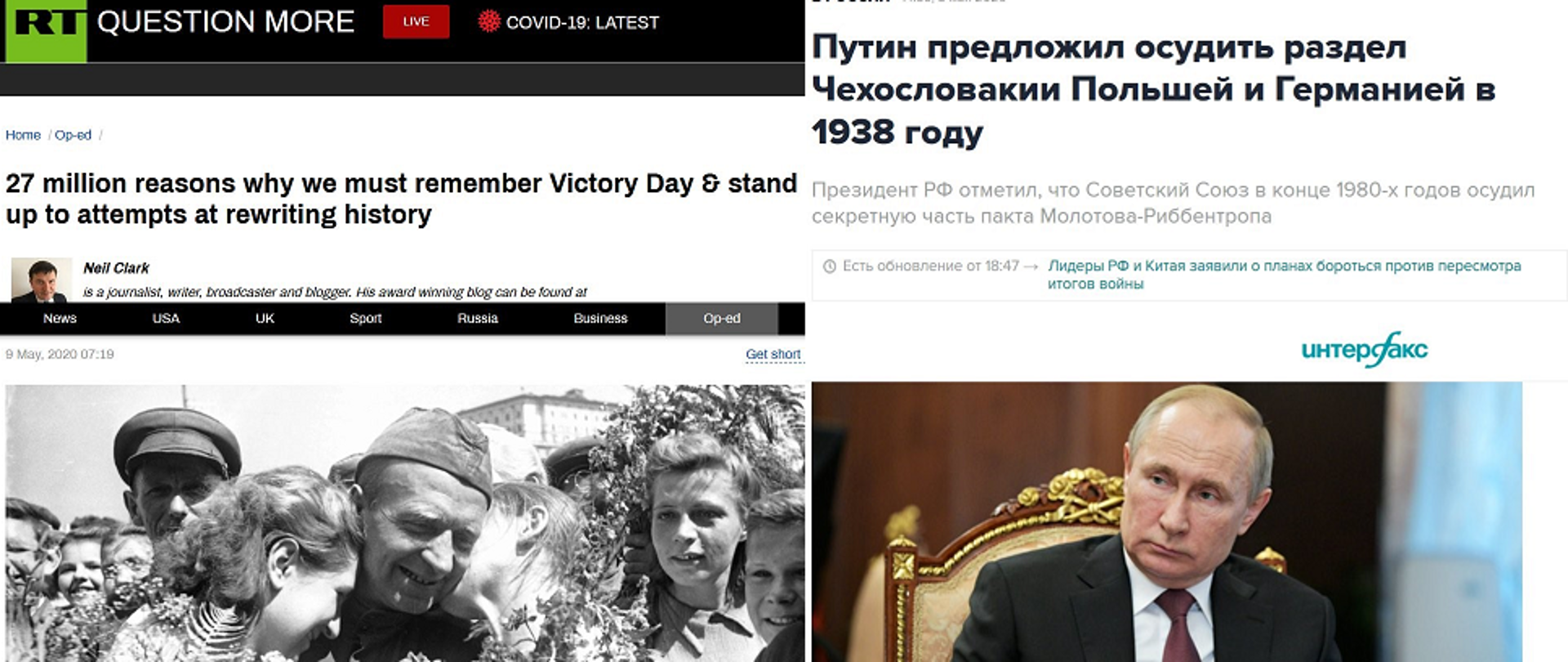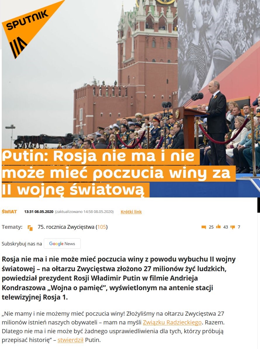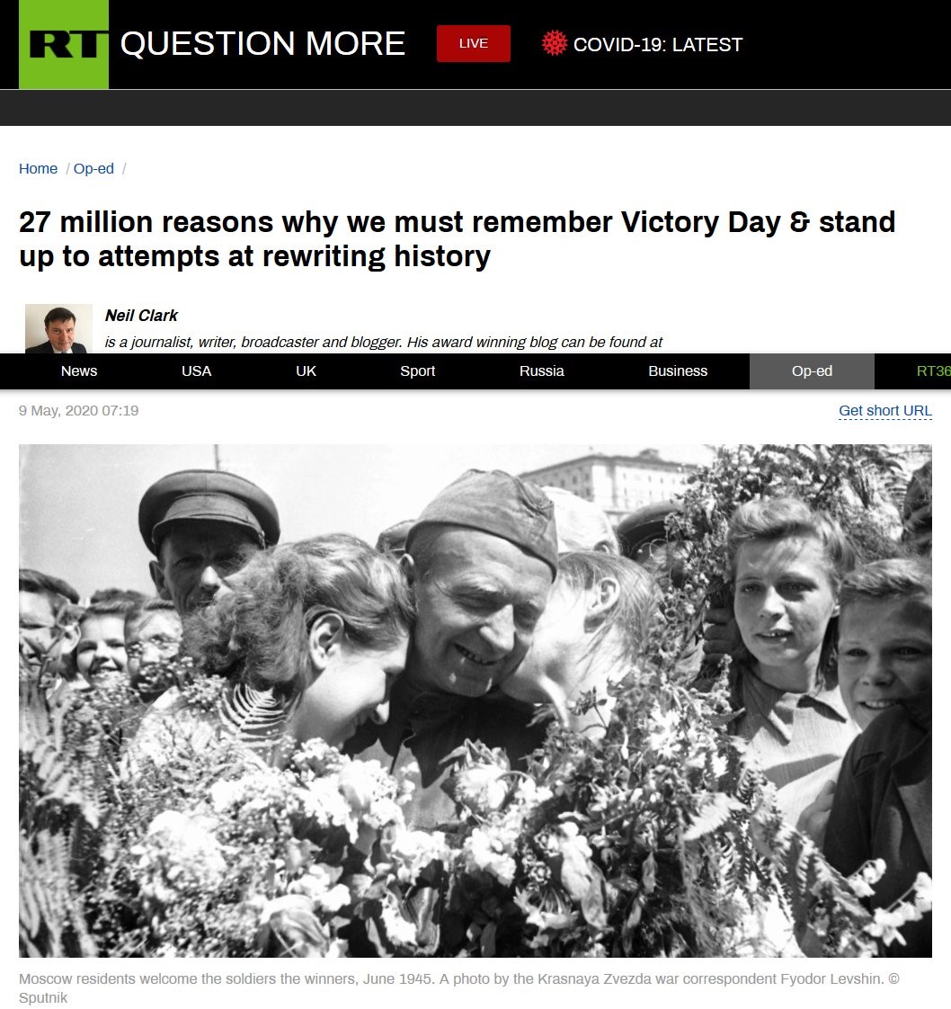 - Propagandowa tuba Kremla - RT manipuluje historią II wojny światowej by wybielać historię ZSRS. Na łamach RT Neil Clark publikuje tekst „27 milionów powodów, dla których musimy pamiętać Dzień Zwycięstwa i przeciwstawiać się próbom przepisywania historii”.