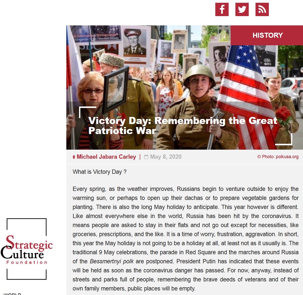 - W angielskojęzycznym serwisie Strategic Culture Foundation, zrzeszającym m. in. zachodnich publicystów prezentujących poglądy zbieżne z optyką Kremla, opublikowano artykuł kanadyjskiego historyka Michaela Carleya. Stanowi on zbiór rosyjskich tez na temat historii, głównie II wojny światowej.