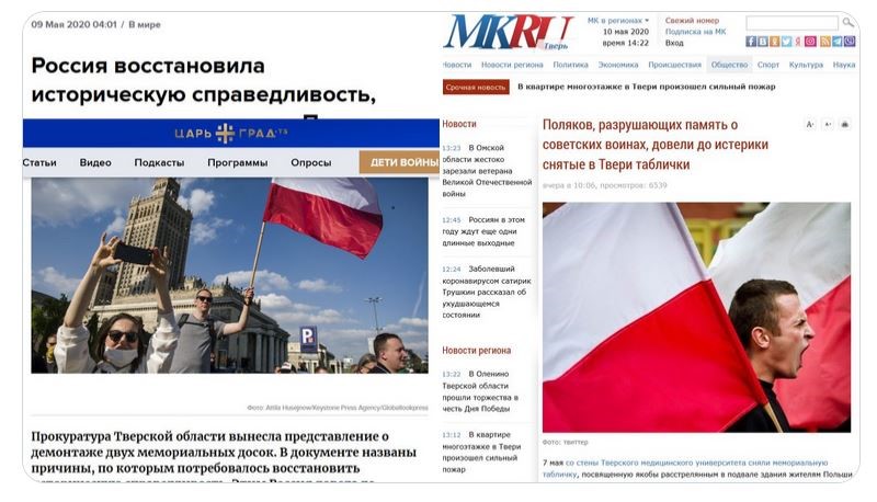 This campaign aims to show that Poland reacted with “hysteria”, whitewash Soviet war crimes, criticise the process of decommunisation in Poland, strengthen the myth of the Soviet Union as “liberator” of Europe, manipulate the real picture of the Kremlin’s activities during the Second World War, and provoke further reaction from the Polish authorities.