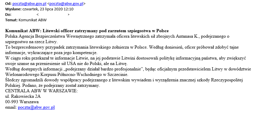 In the latest episode of the ongoing disinformation campaign targeted against Poland, a fake email has been sent to a number of media and public institutions in the country, as well as to some of the allied institutions. It described an alleged action undertaken by Poland’s counter-intelligence service, the ABW. More specifically, attached to the email was a false press release about the ABW’s success in nabbing a Lithuanian soldier for spying.