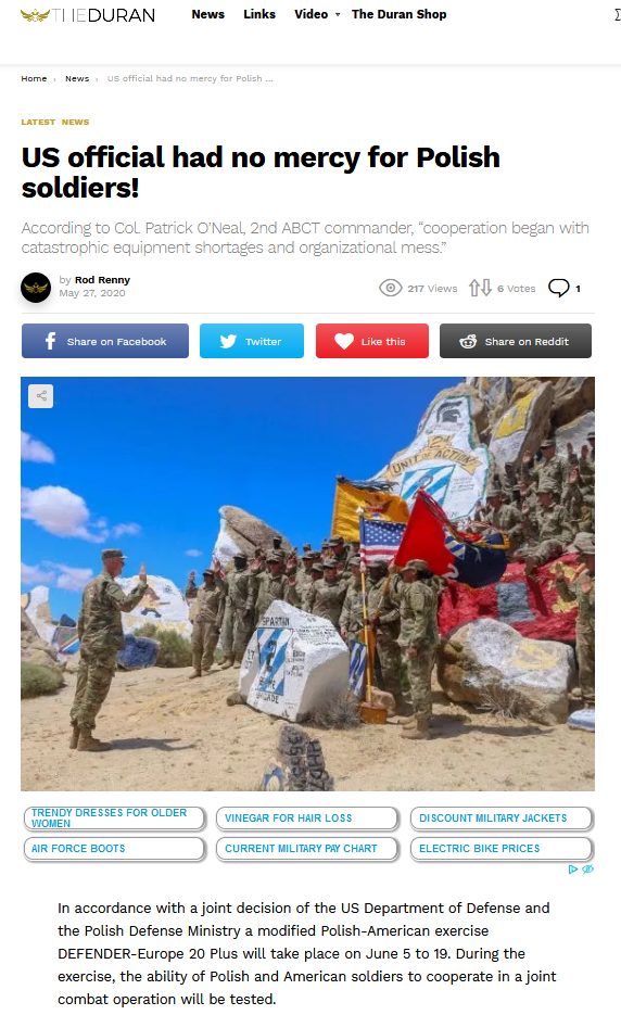 Der Text mit dem Titel "Ein amerikanischer Offizielle ist erbarmungslos für polnische Soldaten" enthielt die englische Version des Artikels, der auf polnischen Portalen platziert worden ist. Die gleichen Einträge wurden - unter Berufung auf theDuran_com - auch auf anderen englischsprachigen Portalen vorgenommen.