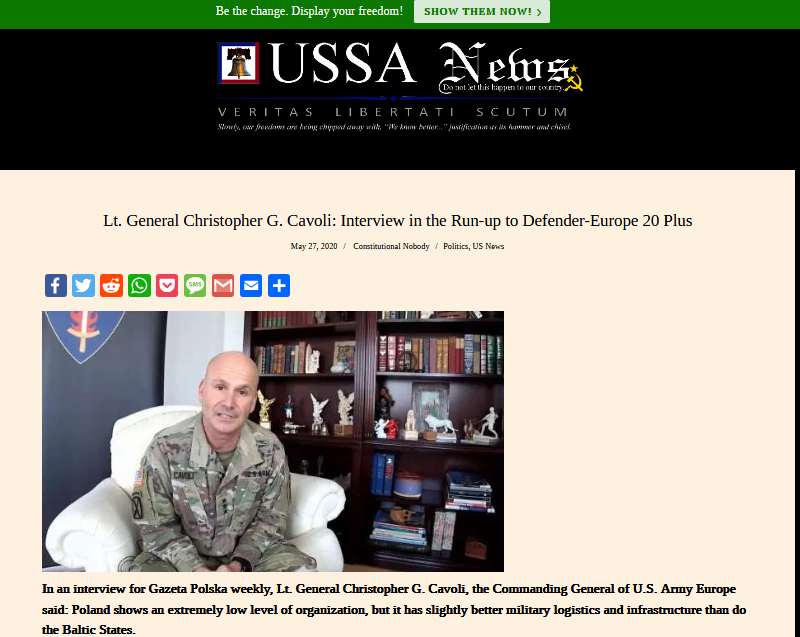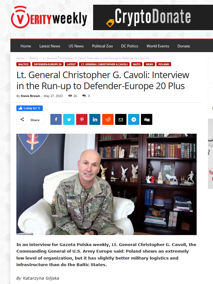 The narratives included in the “interview” were targeted at Poland and the Baltic States. Lt. Gen. Cavoli was “cited” as expressing his dissatisfaction with the way Poland had prepared Defender-Europe 20 exercise and criticizing it for backwardness in terms of infrastructure. Lithuania, Latvia and Estonia “scored” even lower, as they were accused of failing to make sufficient efforts required from hosts of the Allied forces. Another narrative attributed to Lt. Gen. Cavoli was that any further cooperation between the U.S. and the Baltic States was questionable.