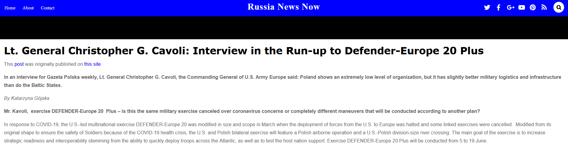 The text featured a disclaimer saying that it was a paraphrase of an interview originally given by Lt. Gen. Cavoli to one of Polish weeklies, namely “Gazeta Polska”. The text also made reference to the paraphrase of the original interview by PolandDaily – an all-English news service of one of Polish news television channels. Citing Polish media outlets as well as using the real name of a journalist reportedly running the interview aimed to make the theduran_com’s narratives credible and to legalize their source from the perspective of English-speaking readers.