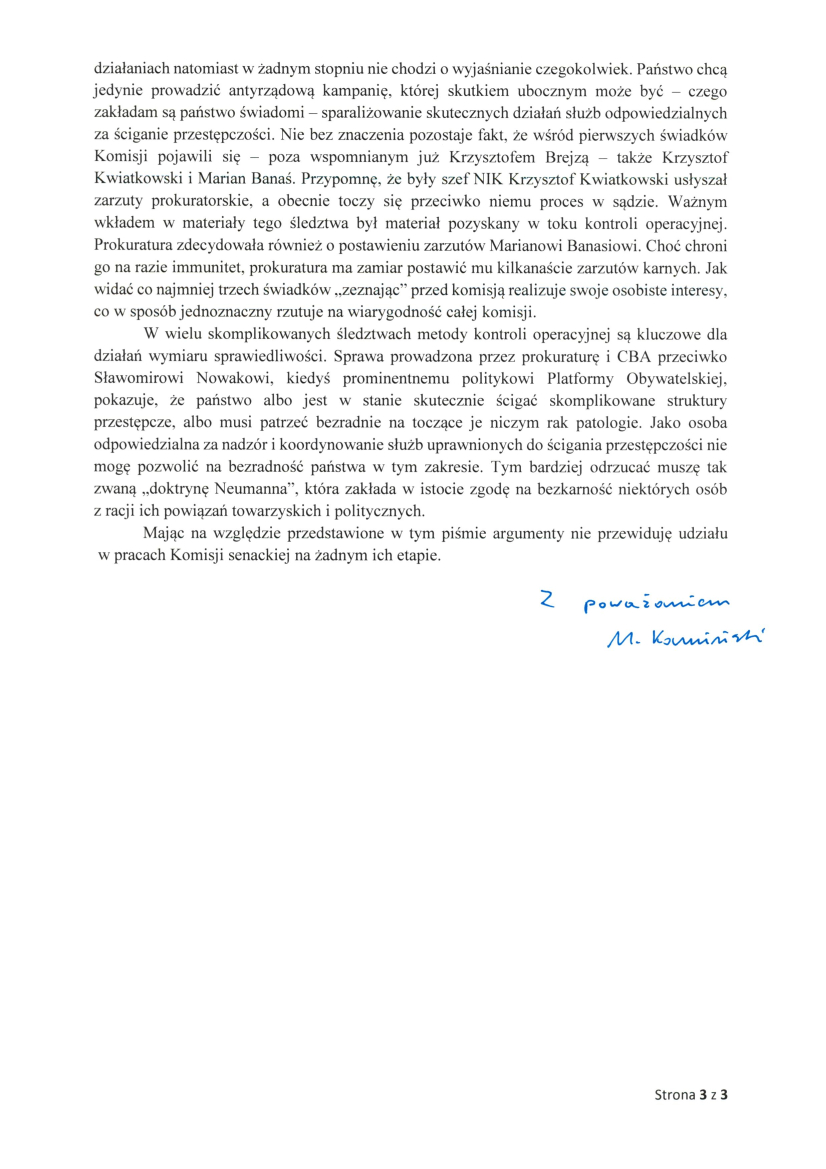 Mając na względzie przedstawione w tym piśmie argumenty nie przewiduję udziału w pracach Komisji senackiej na żadnym ich etapie.