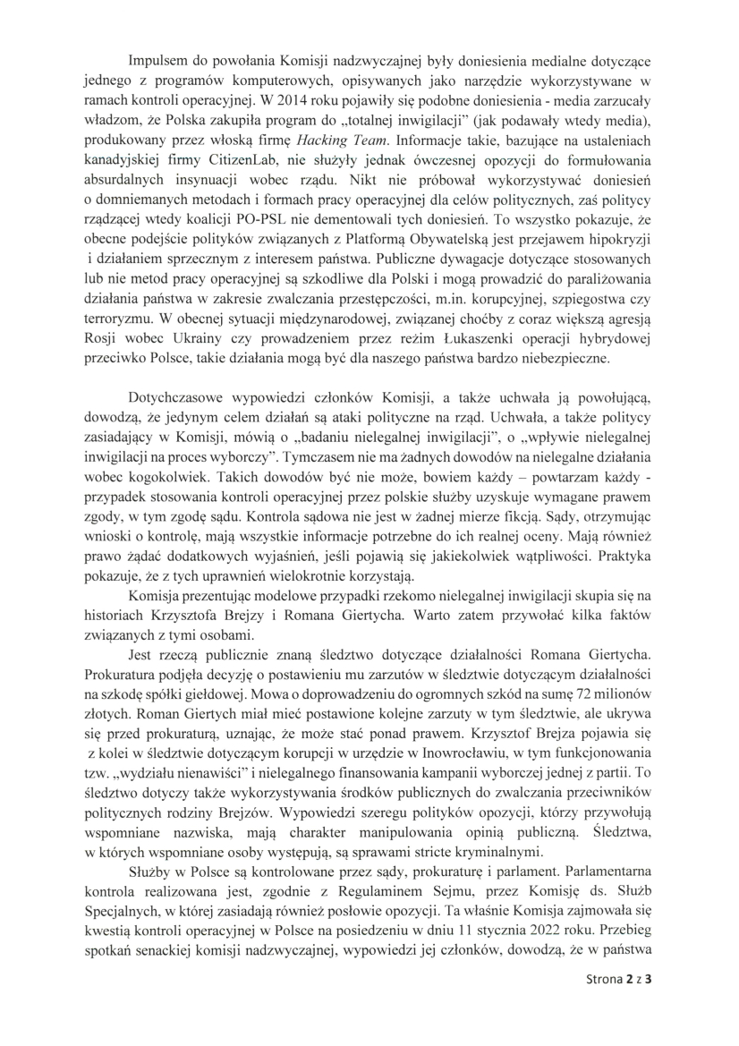 Służby w Polsce są kontrolowane przez sądy, prokuraturę i parlament. Parlamentarna kontrola realizowana jest, zgodnie z Regulaminem Sejmu, przez Komisję ds. Służb Specjalnych, w której zasiadają również posłowie opozycji. Ta właśnie Komisja zajmowała się kwestią kontroli operacyjnej w Polsce na posiedzeniu w dniu 11 stycznia 2022 roku. Przebieg spotkań senackiej komisji nadzwyczajnej, wypowiedzi jej członków, dowodzą, że w państwa działaniach natomiast w żadnym stopniu nie chodzi o wyjaśnianie czegokolwiek. Państwo chcą jedynie prowadzić antyrządową kampanię, której skutkiem ubocznym może być – czego zakładam są państwo świadomi – sparaliżowanie skutecznych działań służb odpowiedzialnych za ściganie przestępczości. Nie bez znaczenia pozostaje fakt, że wśród pierwszych świadków Komisji pojawili się – poza wspomnianym już Krzysztofem Brejzą – także Krzysztof Kwiatkowski i Marian Banaś. Przypomnę, że były szef NIK Krzysztof Kwiatkowski usłyszał zarzuty prokuratorskie, a obecnie toczy się przeciwko niemu proces w sądzie. Ważnym wkładem w materiały tego śledztwa był materiał pozyskany w toku kontroli operacyjnej. Prokuratura zdecydowała również o postawieniu zarzutów Marianowi Banasiowi. Choć chroni go na razie immunitet, prokuratura ma zamiar postawić mu kilkanaście zarzutów karnych. Jak widać co najmniej trzech świadków „zeznając” przed komisją realizuje swoje osobiste interesy, co w sposób jednoznaczny rzutuje na wiarygodność całej komisji.