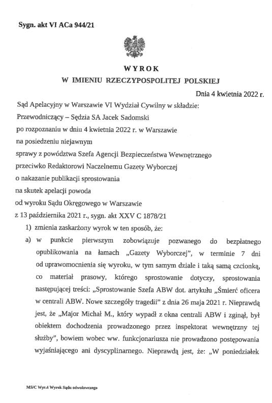 Dziennik „Gazeta Wyborcza” w artykule Wojciecha Czuchnowskiego z 1 lutego br. pt. „Śmierć oficera ABW. Obajtek w cieniu tragedii” kontynuuje podawanie nieprawdziwych informacji dotyczących śmierci funkcjonariusza ABW Michała M., pomimo wcześniejszego opublikowania sprostowania będącego konsekwencją wyroku Sądu Apelacyjnego w Warszawie z dnia 4 kwietnia 2022 r.