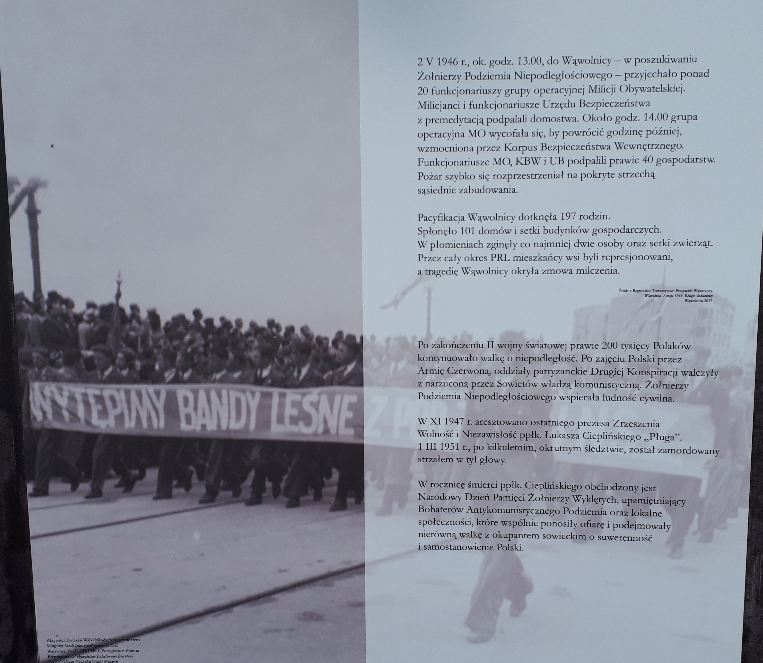 Centralne Biuro Antykorupcyjne prezentuje wystawę poświęconą lokalnym społecznościom wspierającym Żołnierzy Podziemia Niepodległościowego, których symbolem jest miejscowość Wąwolnica w woj. lubelskim, spalona przez komunistów w maju 1946 r.