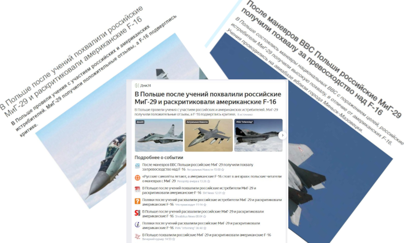 In texts published on Russian portals, one could find suggestions that Poles appreciate the Russian MiGs more than the American F-16s. In one of the texts there was an indication that American planes "have become useless". Aviation exercises that took place in Poland were the pretext for the publication. In comments after the end of the maneuvers, the Russian media promoted a message aimed at weakening military cooperation between Poland and the USA.