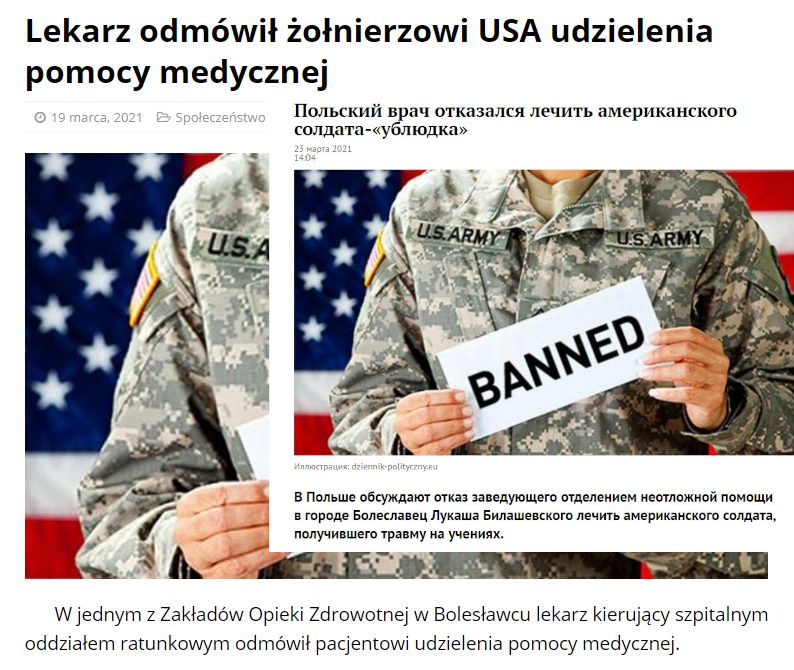 In their activities, Russian internet portals also reach for lies by publishing fake events. One of the texts published by the portal conducting constant information activities against the Armed Forces of the Republic of Poland published a false text aimed at fuelling aversion to US troops in Poland. The image of a doctor working at one of the Hospital Emergency Wards in Poland was used for the activities. The portals spreading Russian propaganda falsely claimed that the above-mentioned doctor refused to treat an American soldier. The reason for the refusal was - according to the propaganda narrative - the assessment of the activities of the American military in Poland. The doctor allegedly refused to help the military while accusing the US military of criminal behaviour.