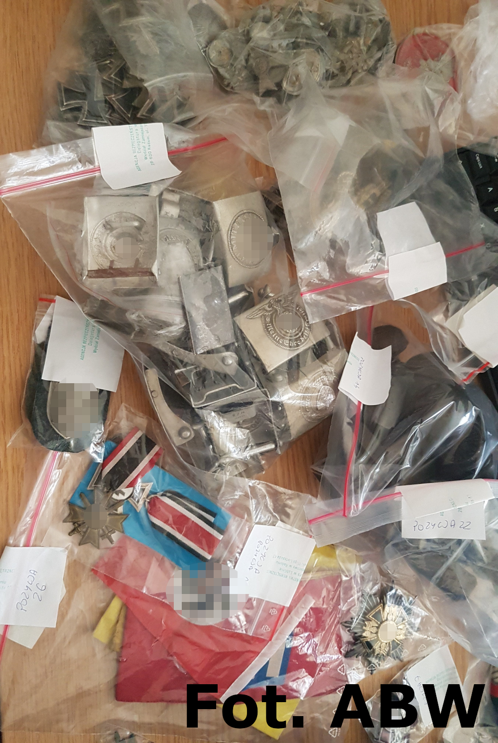 Funkcjonariusze ABW przeszukali miejsca zamieszkania, zameldowania oraz lokale należące do podejrzanych. W trakcie przeszukań zabezpieczonych zostało wiele przedmiotów zawierających treści propagujące faszystowski ustrój państwa. W lokalach należących do mężczyzn znajdowały się m.in. klamry, wpinki, krzyże, flagi, pieczątki, naszywki, kordziki oraz medale z symboliką SS, NSDAP oraz wizerunkiem Hitlera. Funkcjonariusze zabezpieczyli również elektroniczne nośniki danych oraz dokumentację mogące mieć związek z produkcją i obrotem wskazanymi przedmiotami. Ponadto ujawnione zostały trzy miejsca produkcji tych emblematów na masową skalę. Funkcjonariusze zabezpieczyli także mienie o wartości 95 tys. zł.