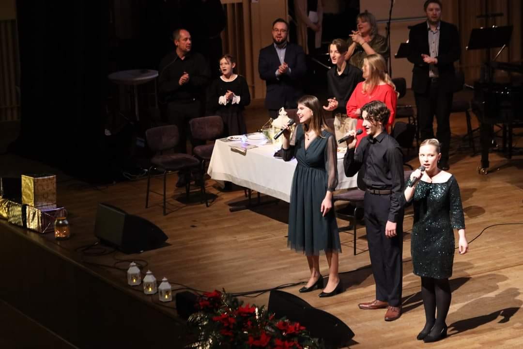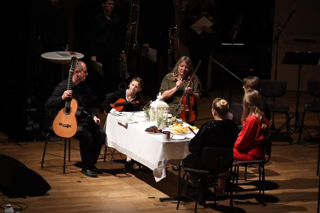 W czwartek 14 grudnia w Filharmonii Gorzowskiej, uczniowie i nauczyciele naszej Szkoły spotkali się na świątecznym koncercie „Razem w święta” wraz z rodzinami i przyjaciółmi. Przy wigilijnym stole, który faktycznie stanął na scenie, zasiedli mama, tata i dzieci, a odwiedzili ich różni ciekawi goście. Przywoływane były dawne świąteczne tradycje i obyczaje, a wspomnienia i opowieści przeplatały się z piosenkami i melodiami związanymi ze świętami.