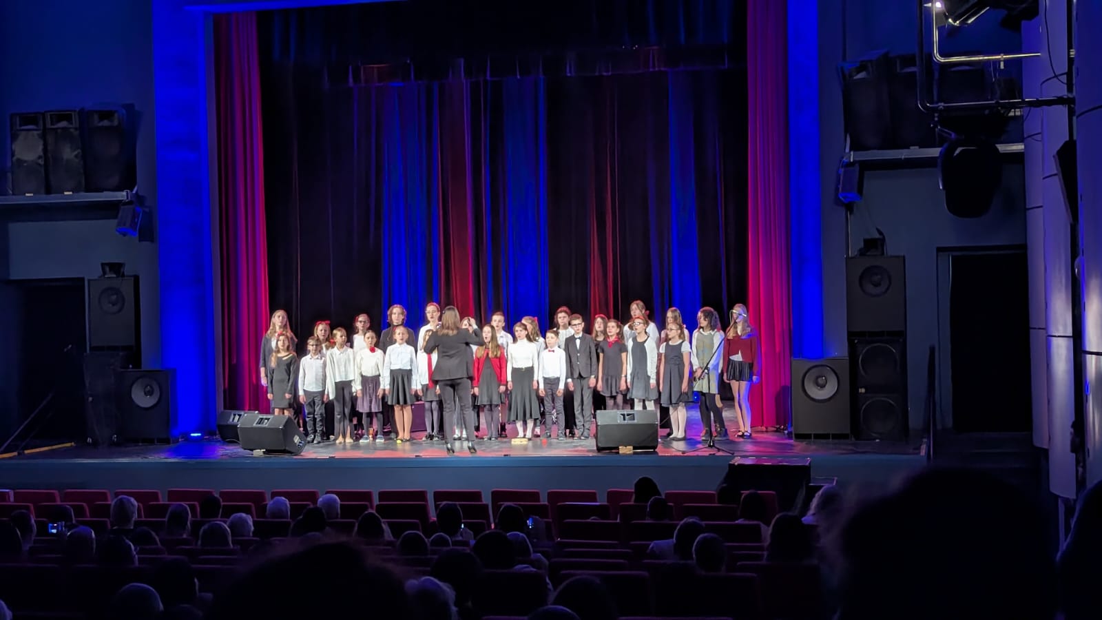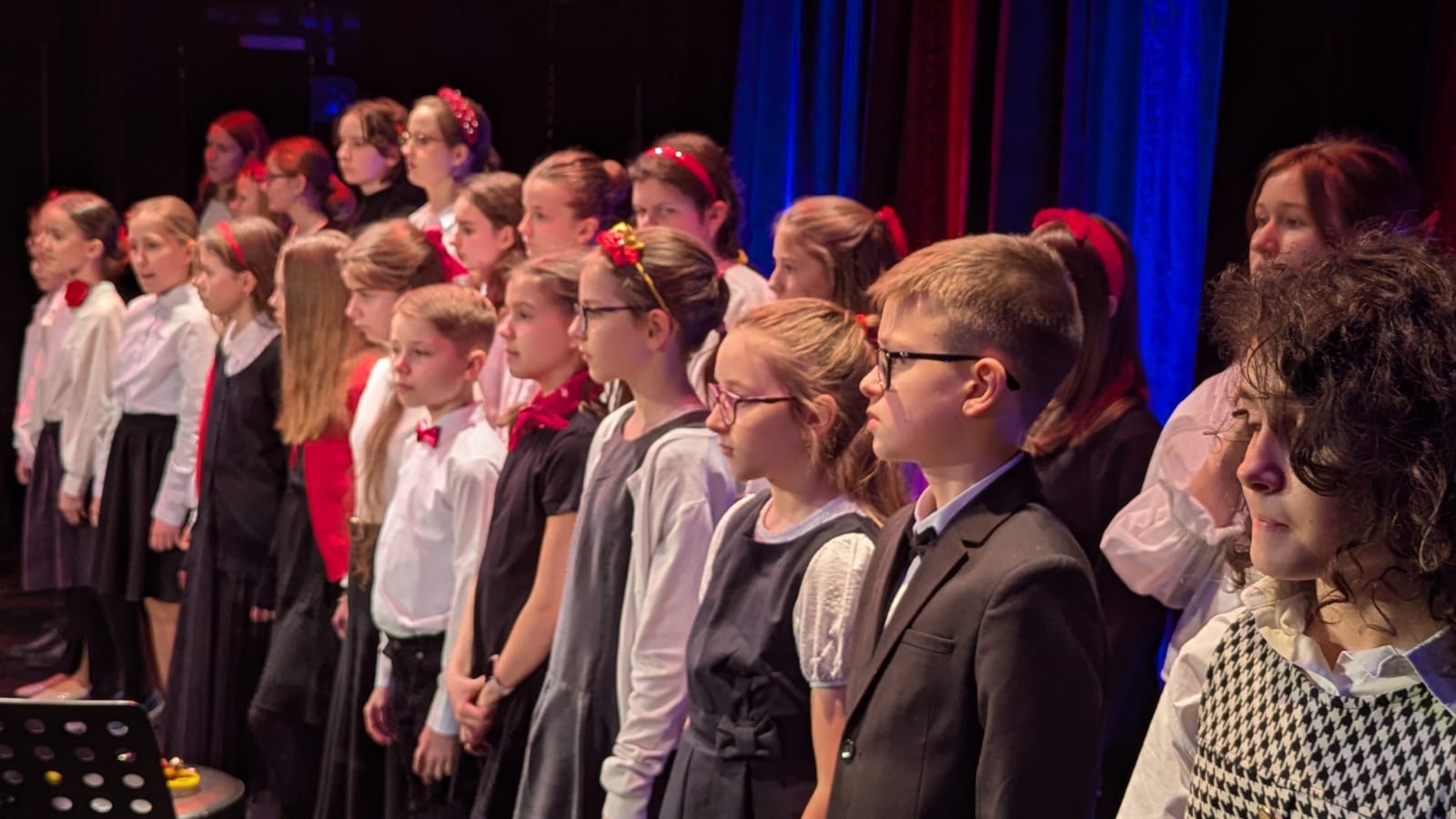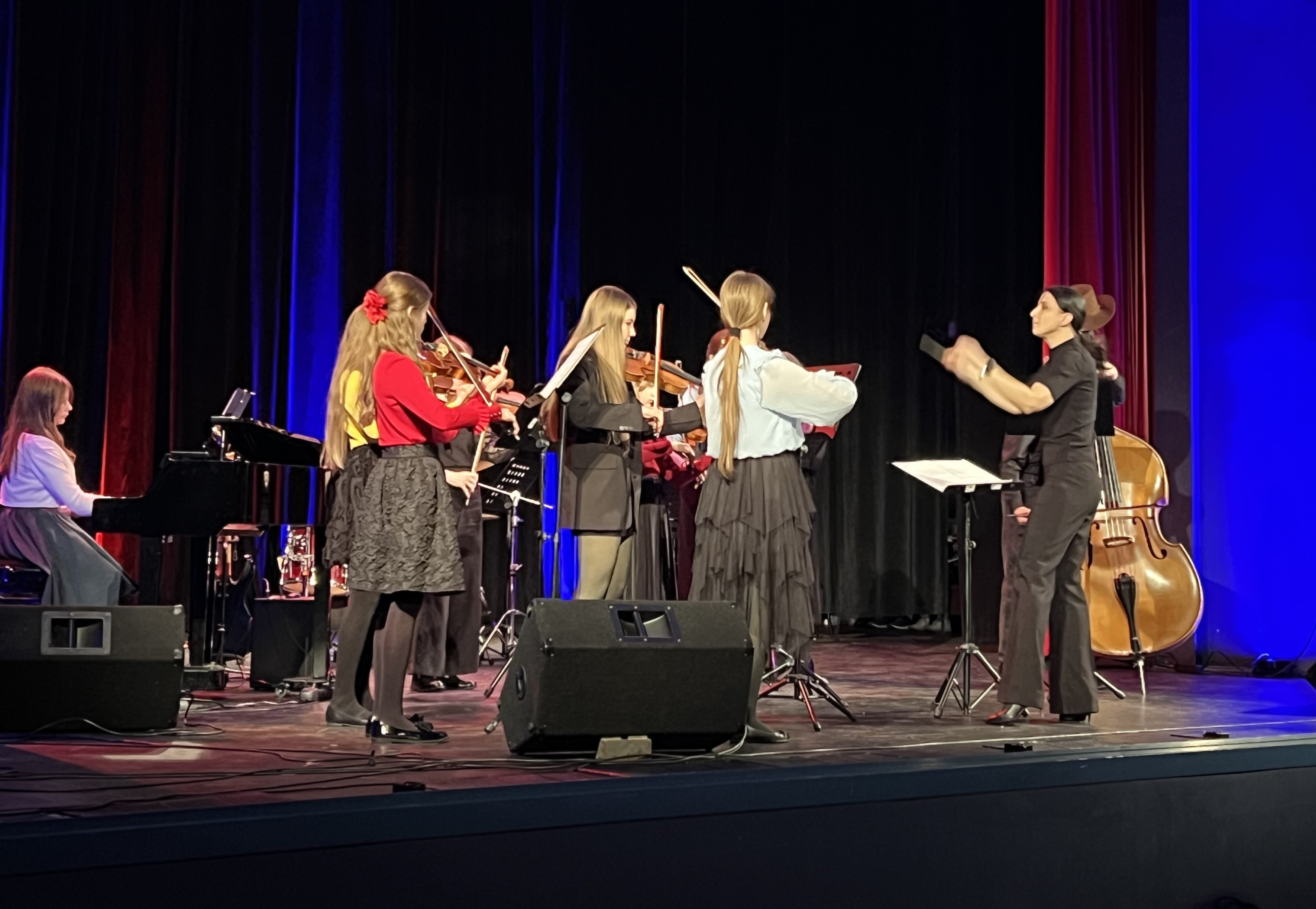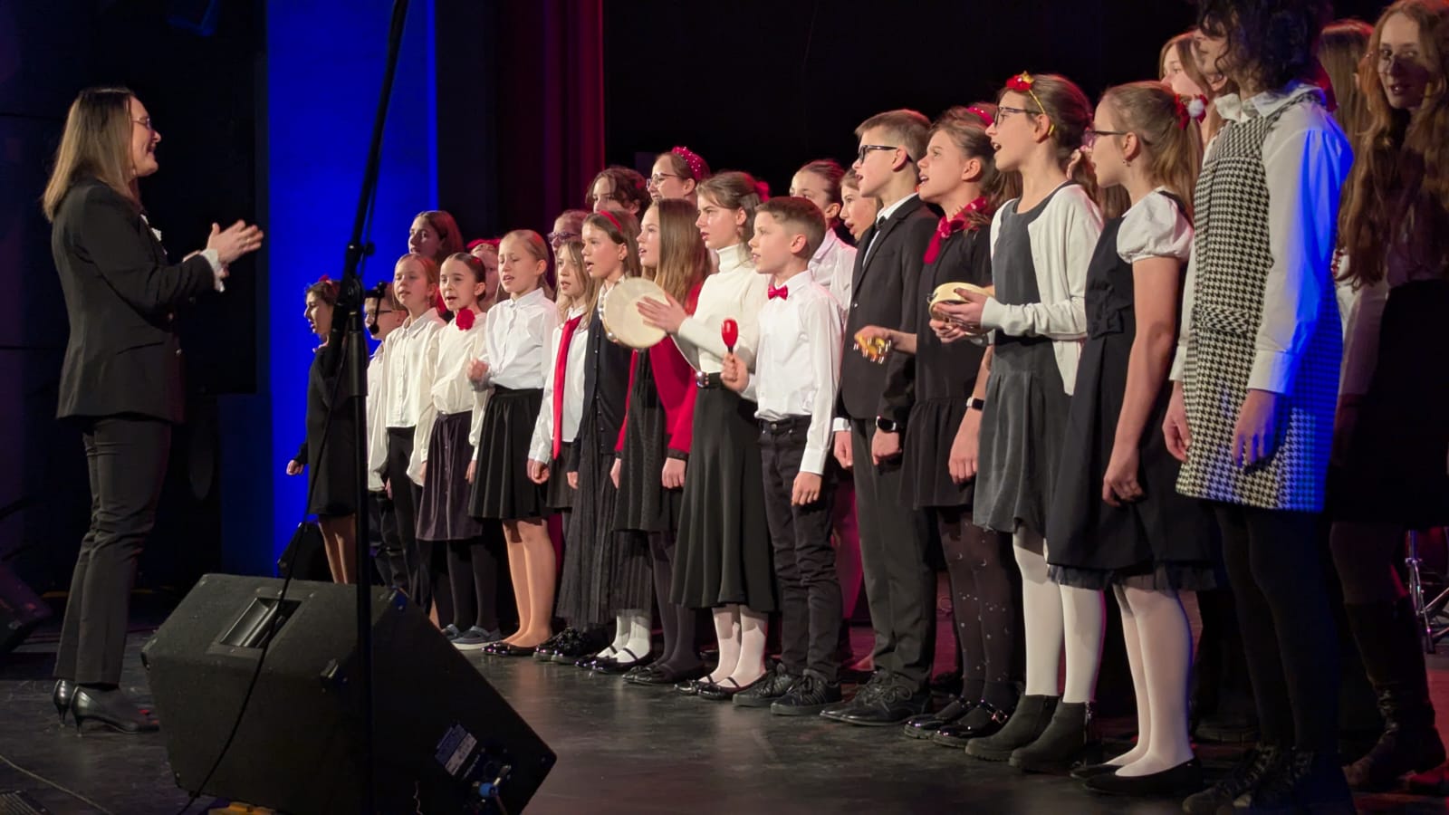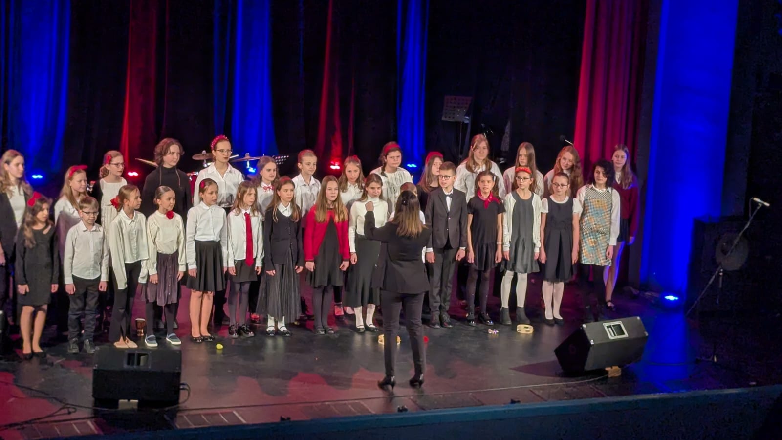 Na tle nieba z zorzą polarną i zaśnieżonym lasem, elementy karnawałowe (balony, serpentyny, maska karnawałowa) i akcenty świąteczne (choinka, renifery). Kolorowy tekst informujący o ogólnoszkolnym koncercie kolędowo-karnawałowym, zaplanowanym na 25 stycznia 2025 w Centrum Kultury Pafawag przy ul. Chociebuskiej.