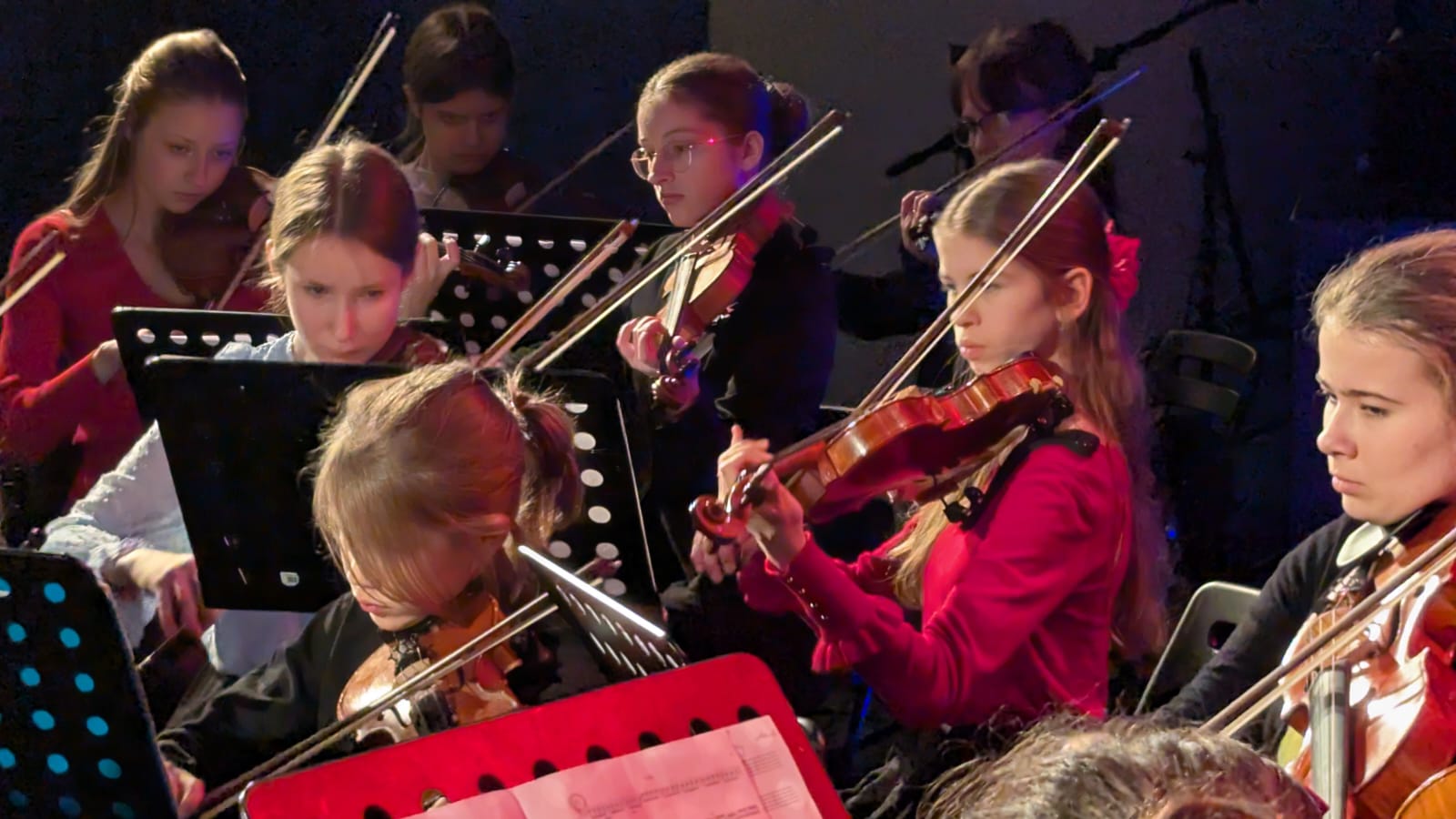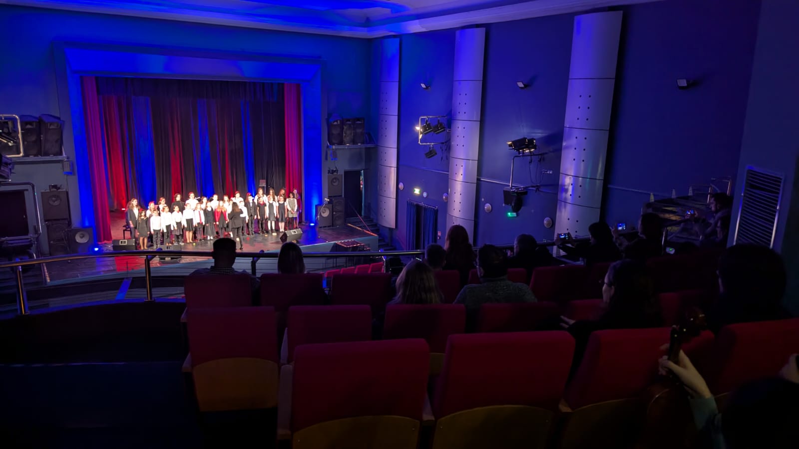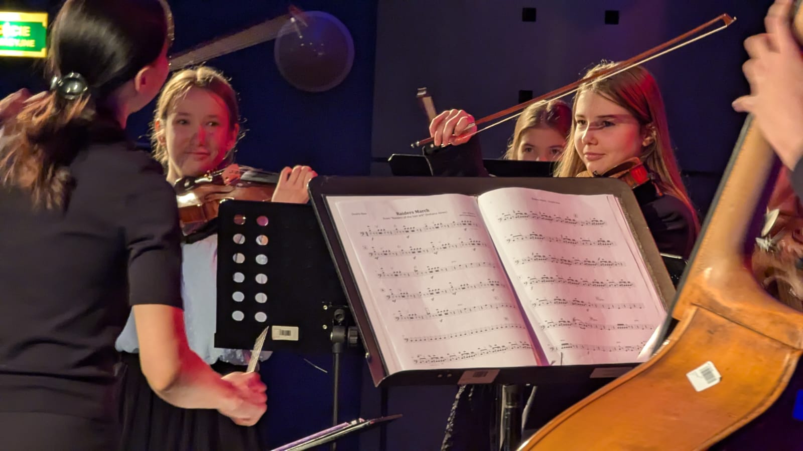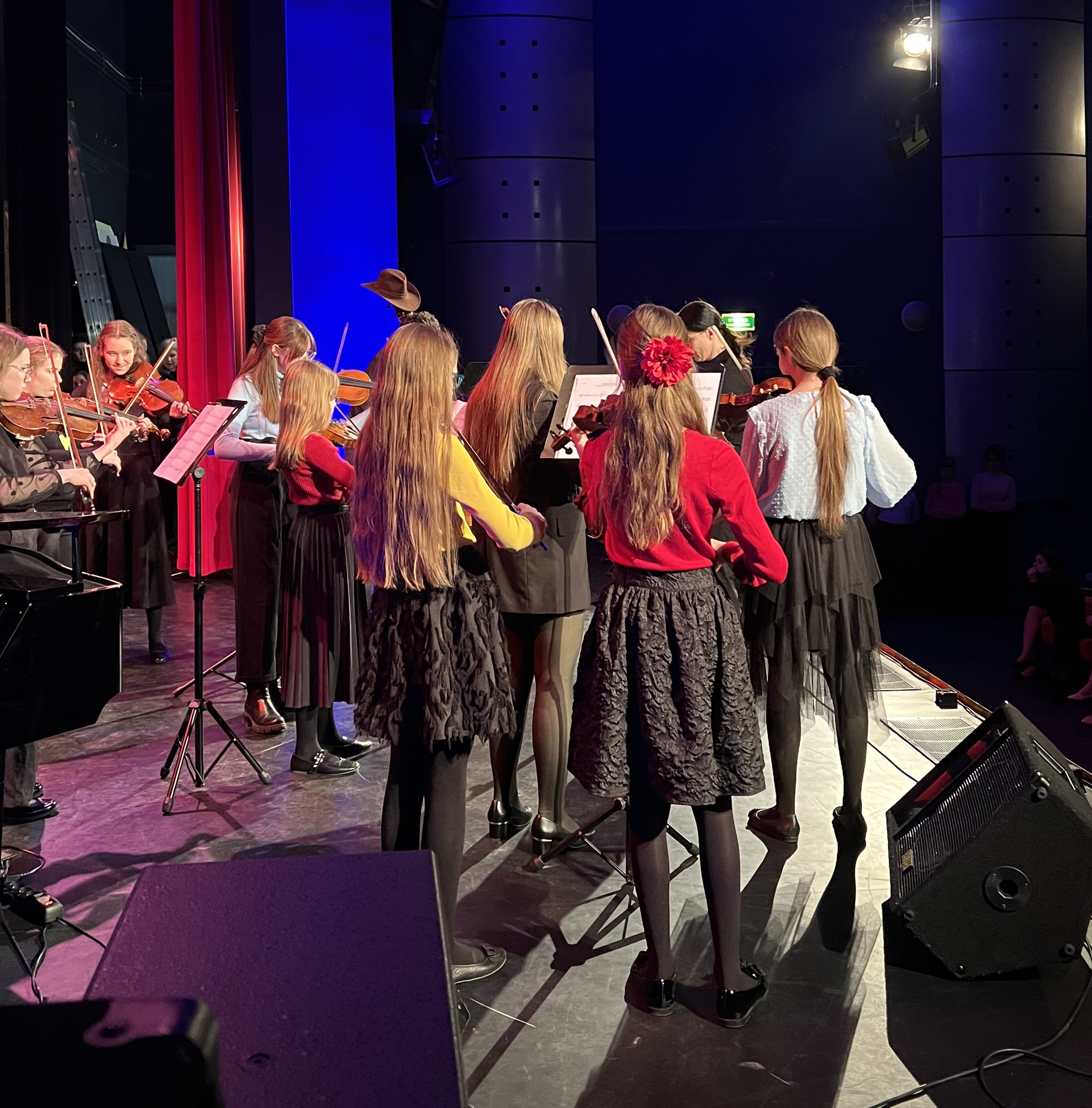Na tle nieba z zorzą polarną i zaśnieżonym lasem, elementy karnawałowe (balony, serpentyny, maska karnawałowa) i akcenty świąteczne (choinka, renifery). Kolorowy tekst informujący o ogólnoszkolnym koncercie kolędowo-karnawałowym, zaplanowanym na 25 stycznia 2025 w Centrum Kultury Pafawag przy ul. Chociebuskiej.