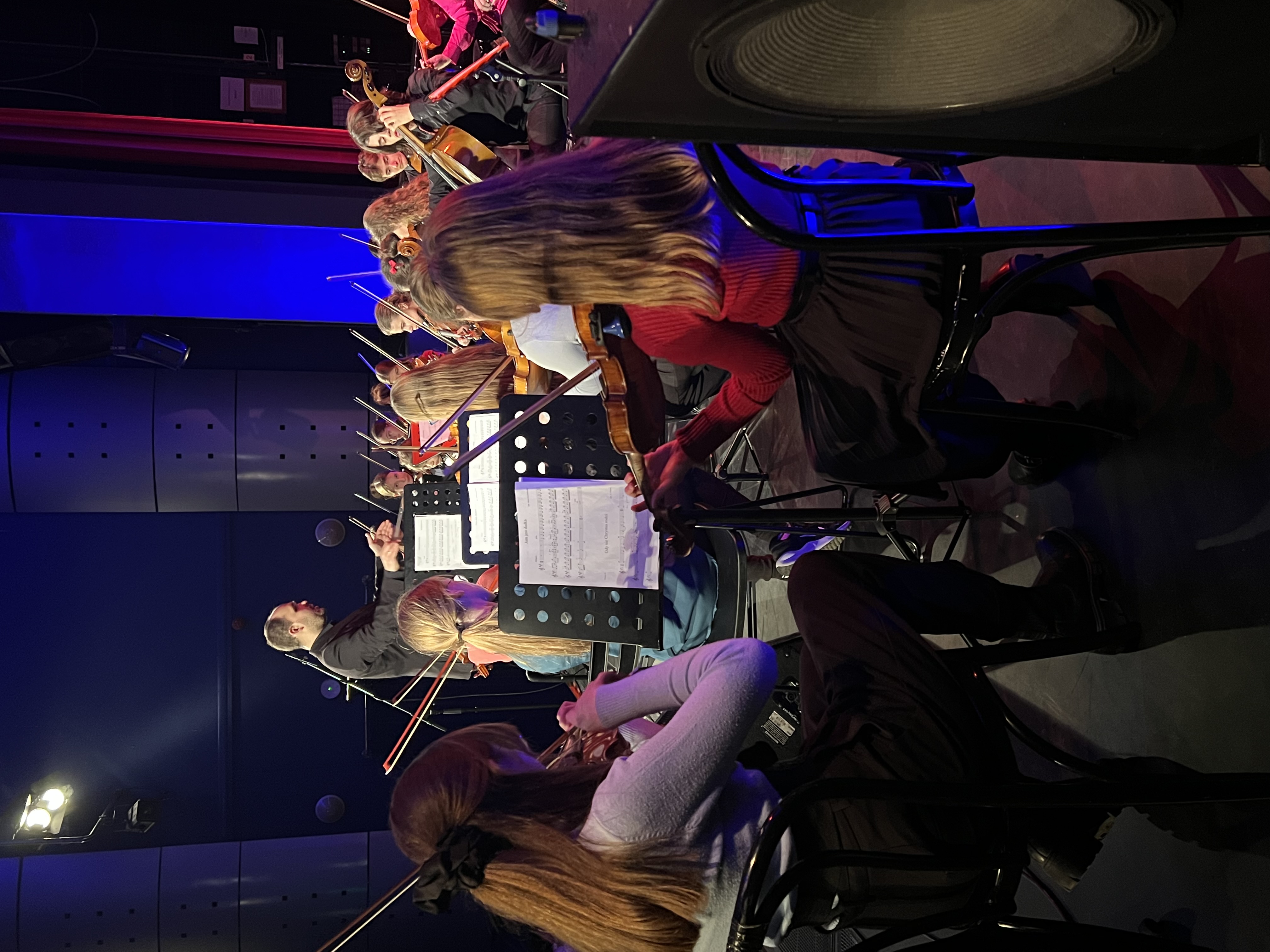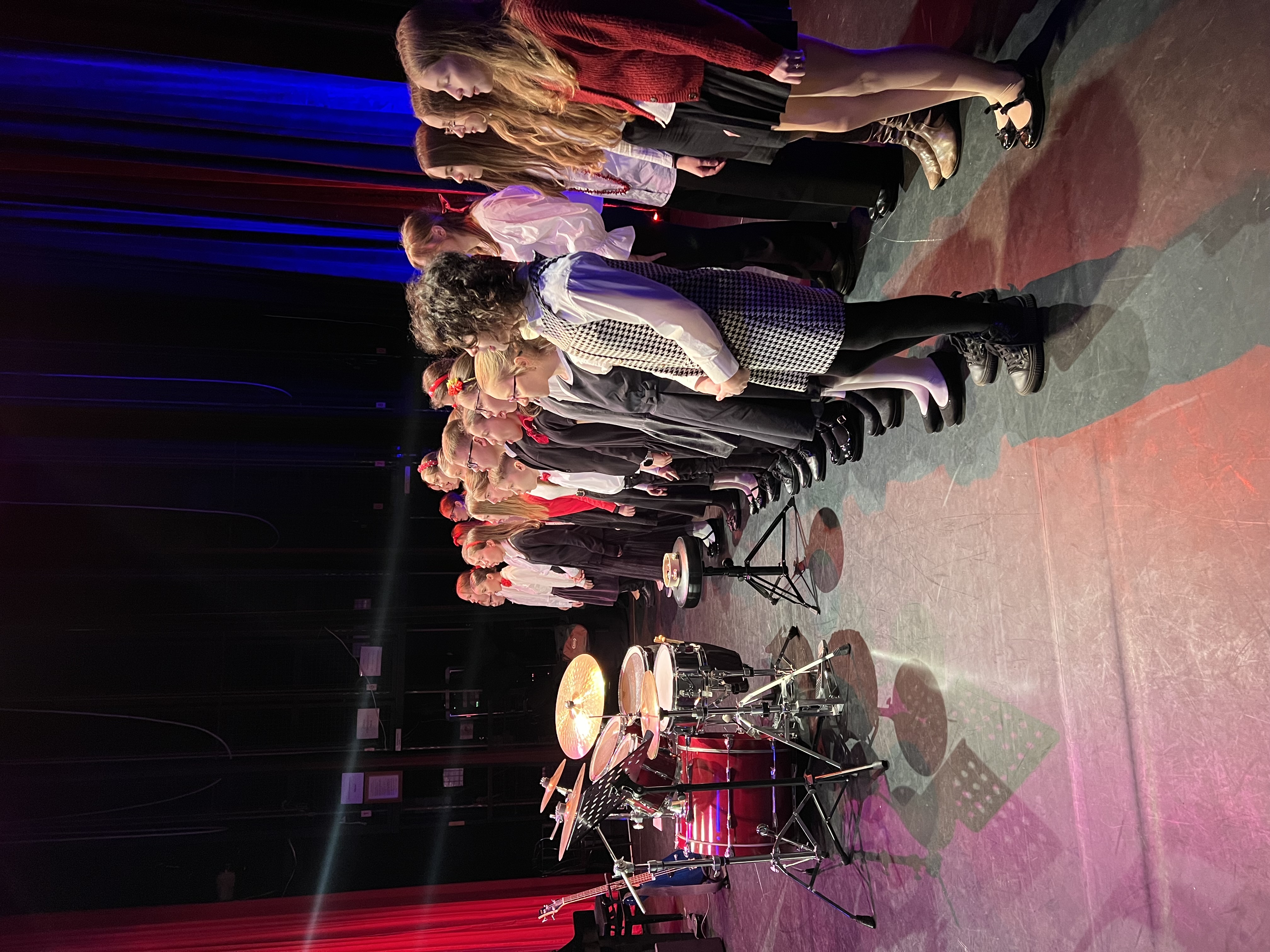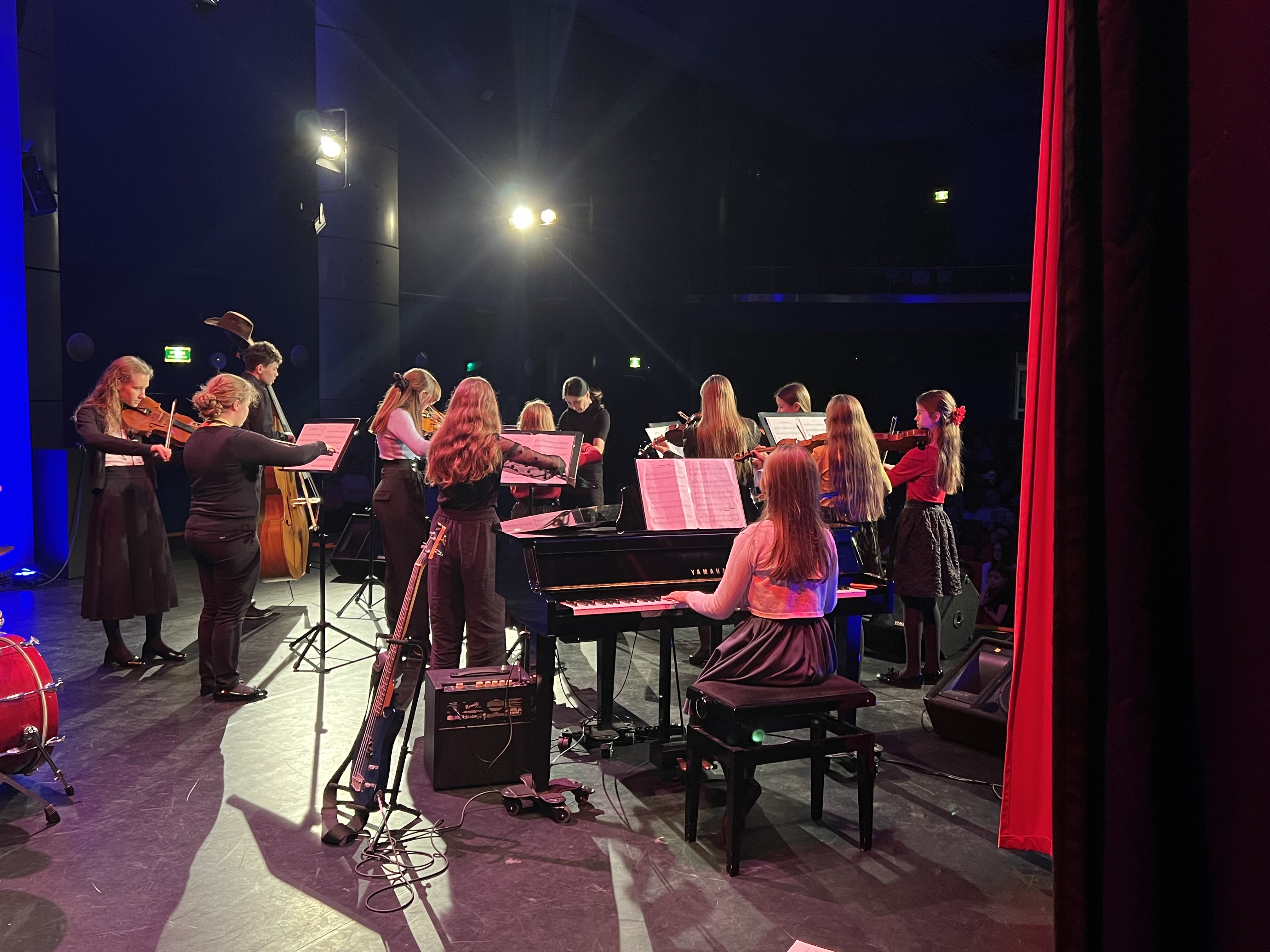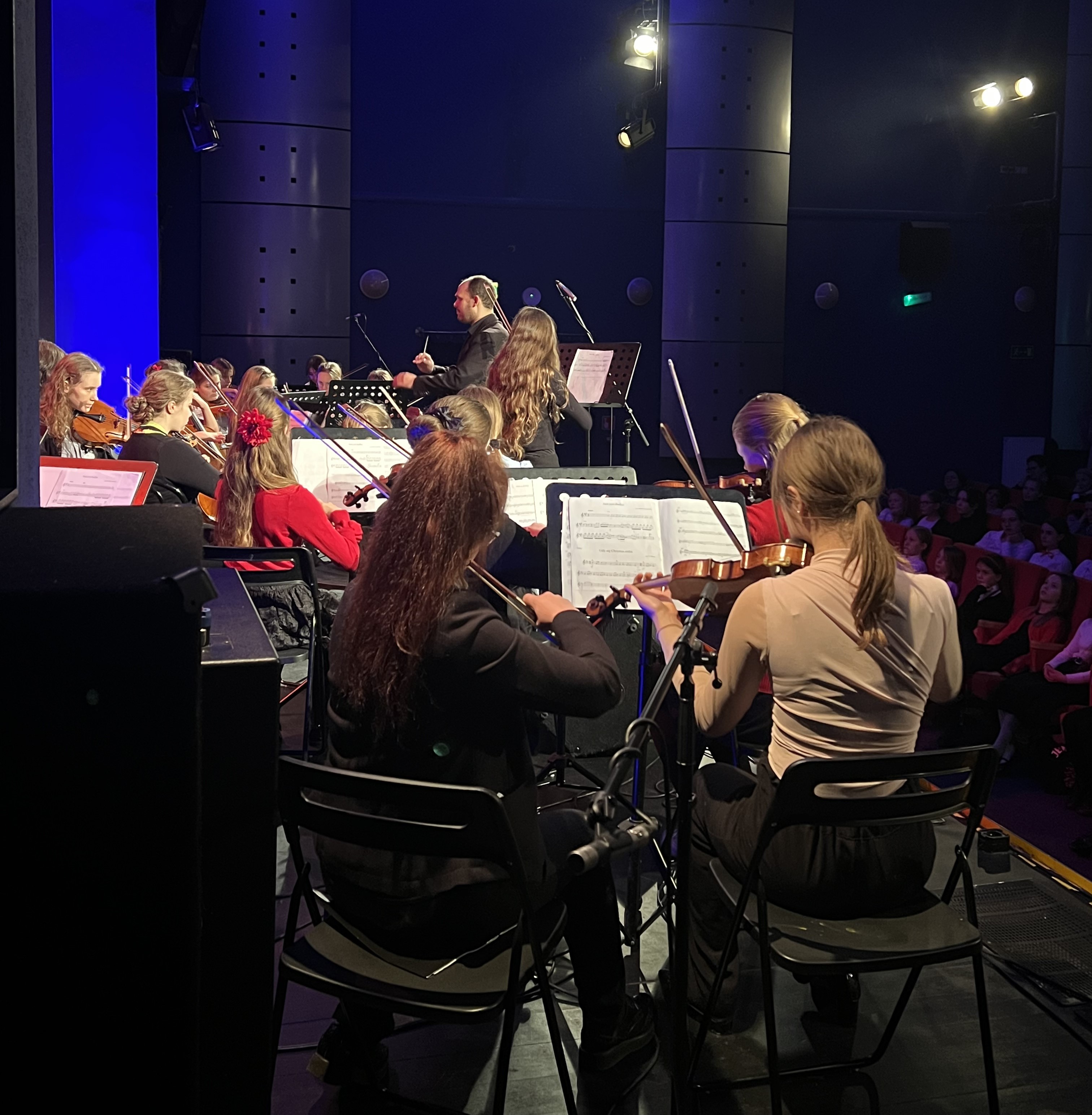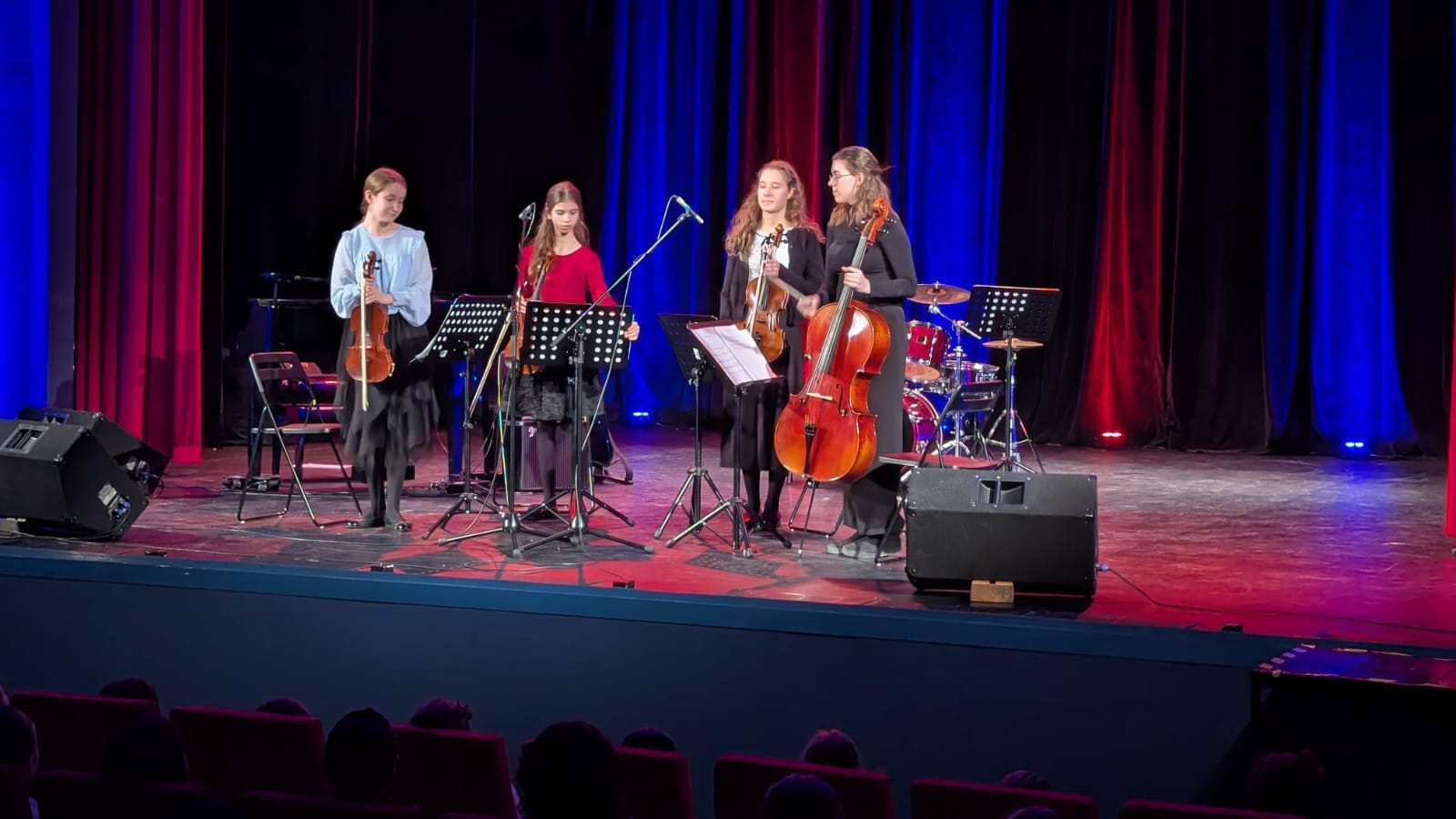 Na tle nieba z zorzą polarną i zaśnieżonym lasem, elementy karnawałowe (balony, serpentyny, maska karnawałowa) i akcenty świąteczne (choinka, renifery). Kolorowy tekst informujący o ogólnoszkolnym koncercie kolędowo-karnawałowym, zaplanowanym na 25 stycznia 2025 w Centrum Kultury Pafawag przy ul. Chociebuskiej.