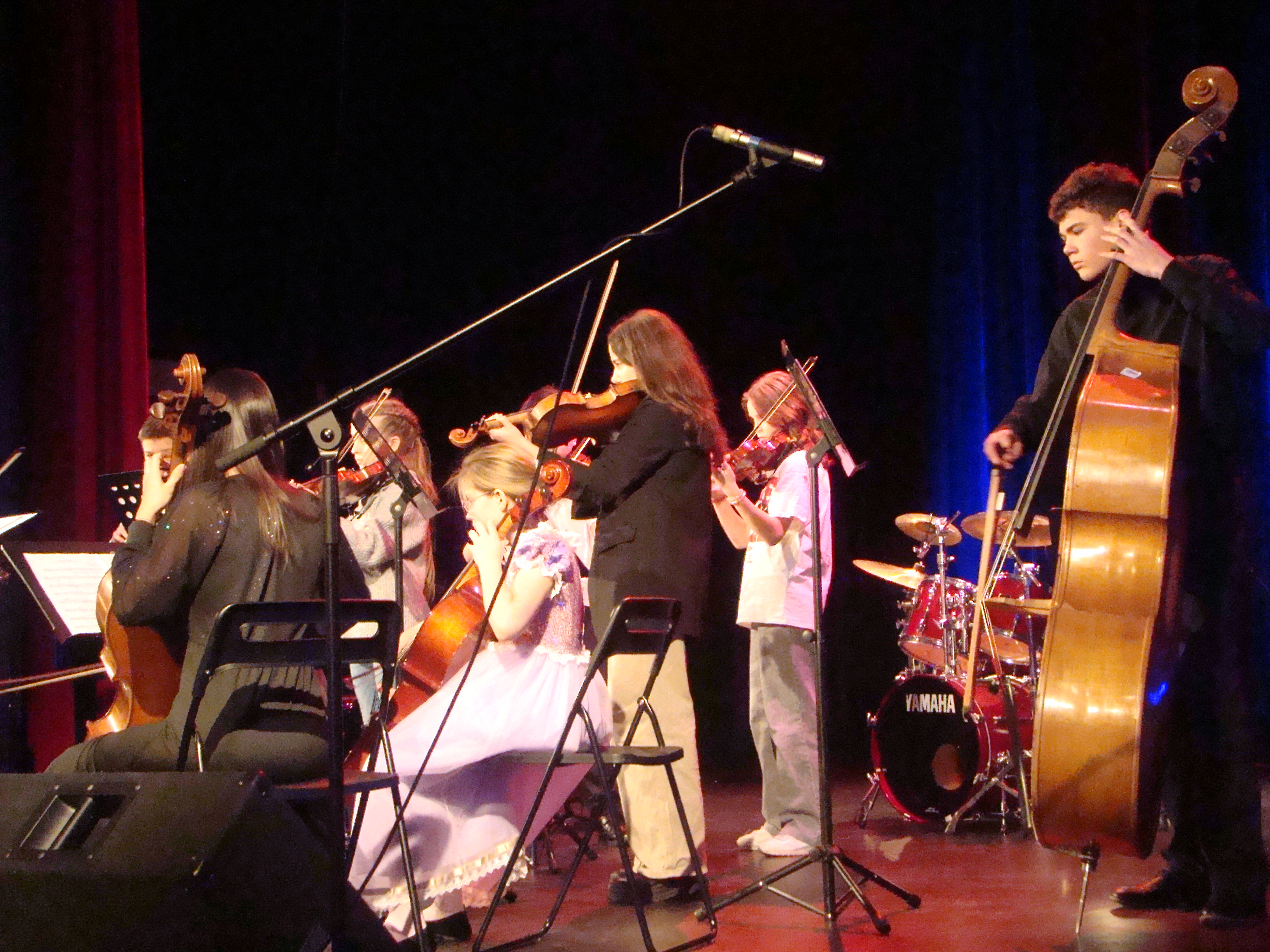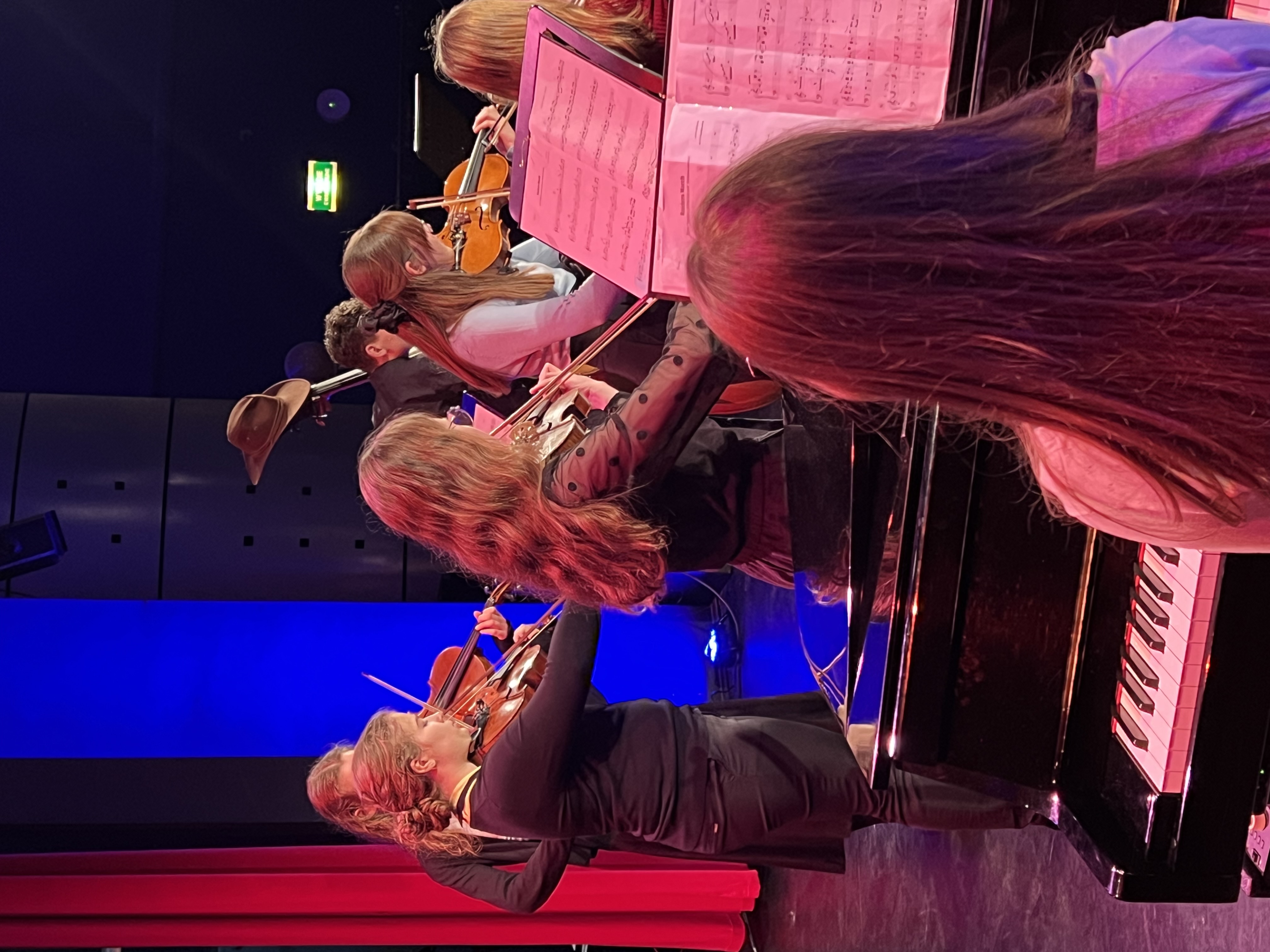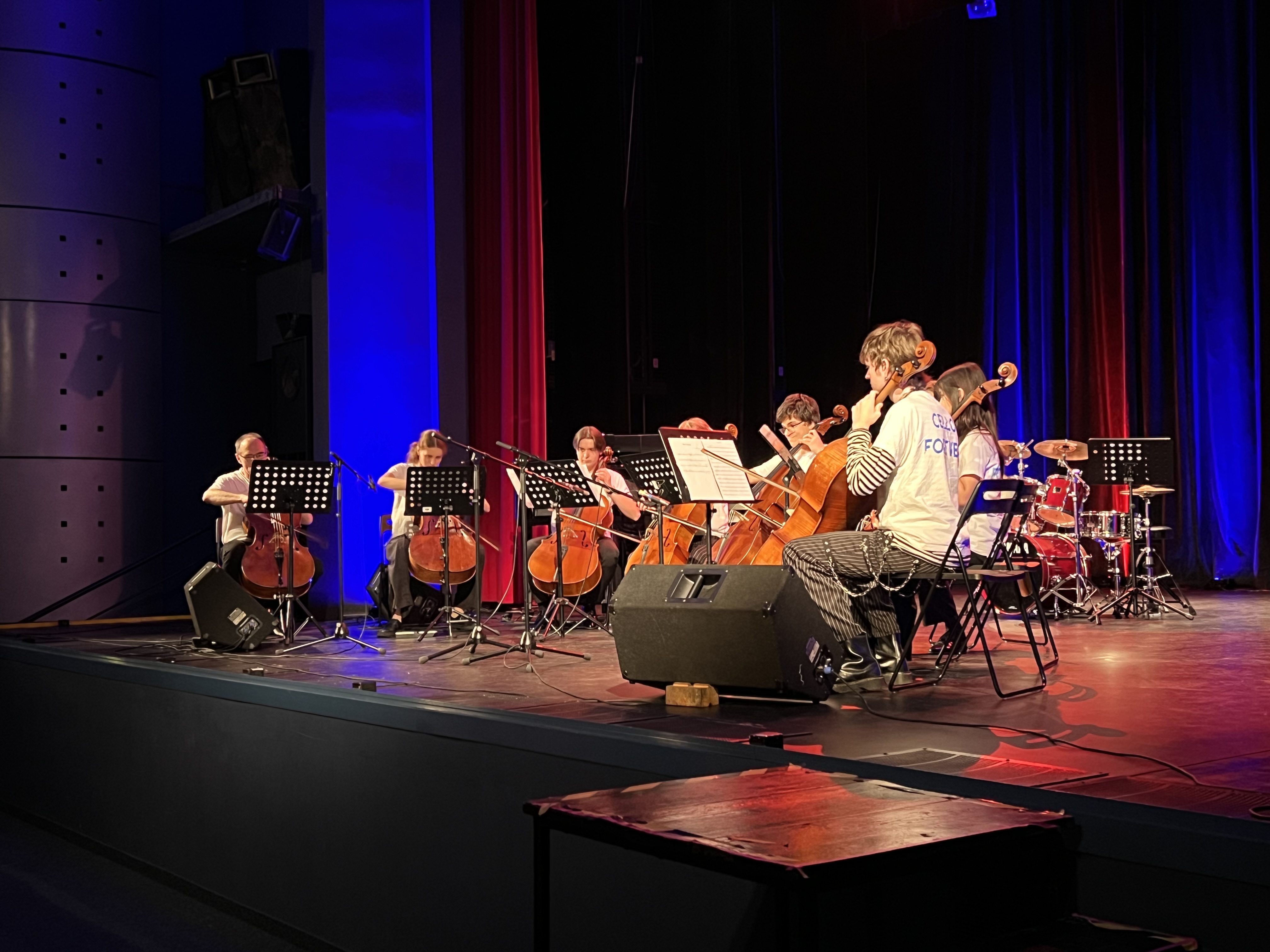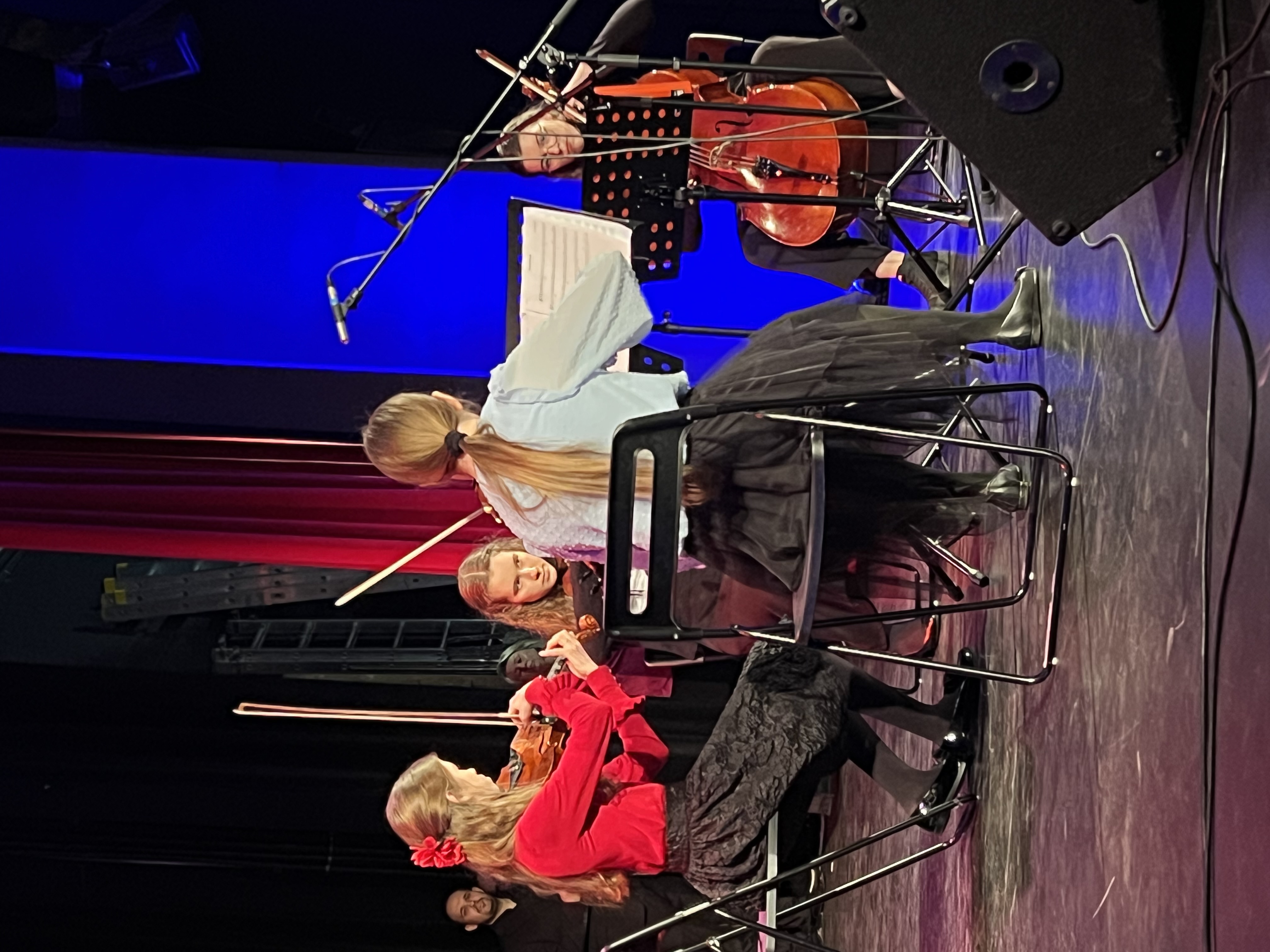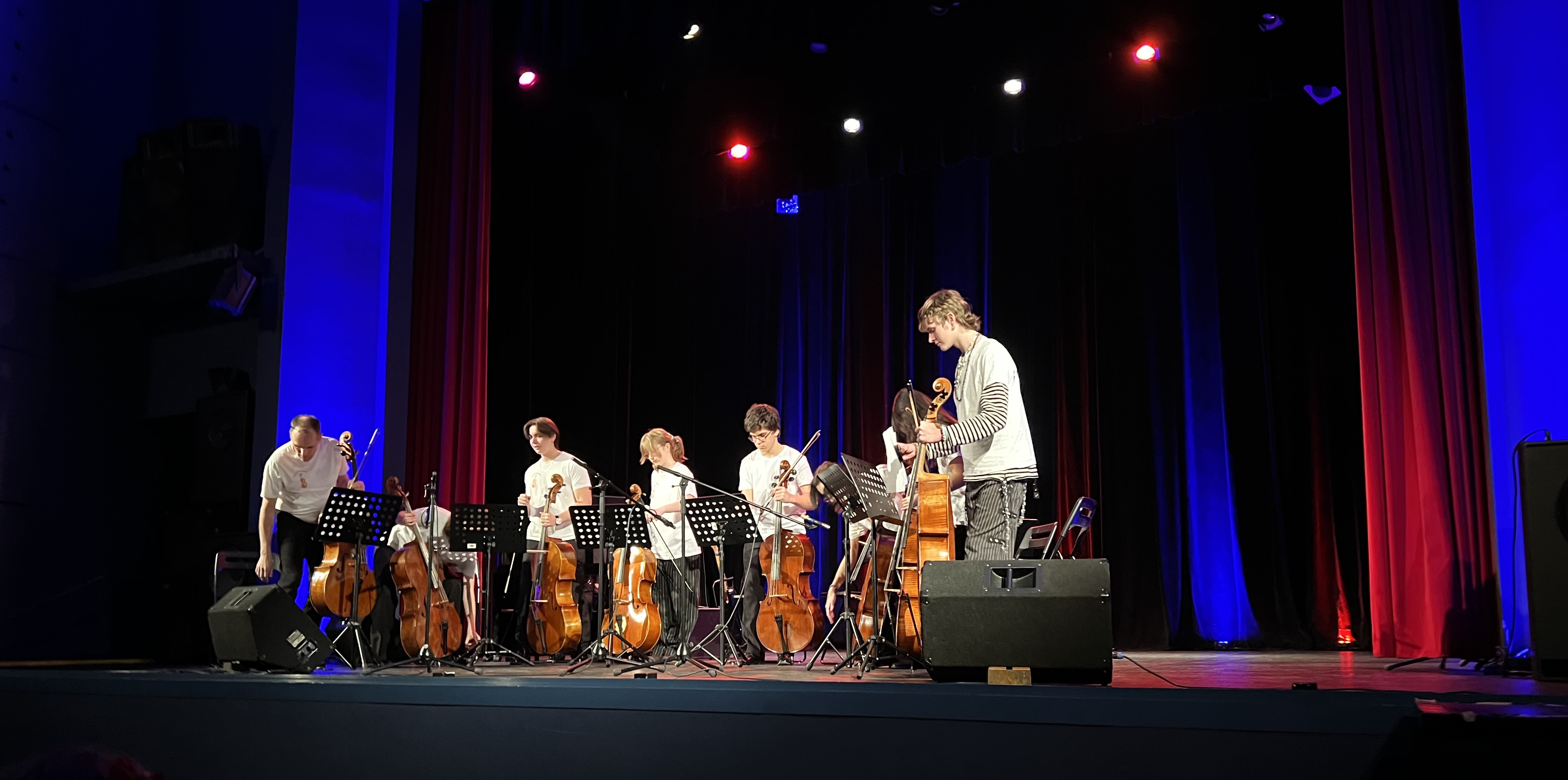 Na tle nieba z zorzą polarną i zaśnieżonym lasem, elementy karnawałowe (balony, serpentyny, maska karnawałowa) i akcenty świąteczne (choinka, renifery). Kolorowy tekst informujący o ogólnoszkolnym koncercie kolędowo-karnawałowym, zaplanowanym na 25 stycznia 2025 w Centrum Kultury Pafawag przy ul. Chociebuskiej.