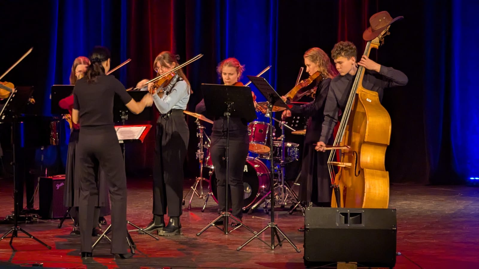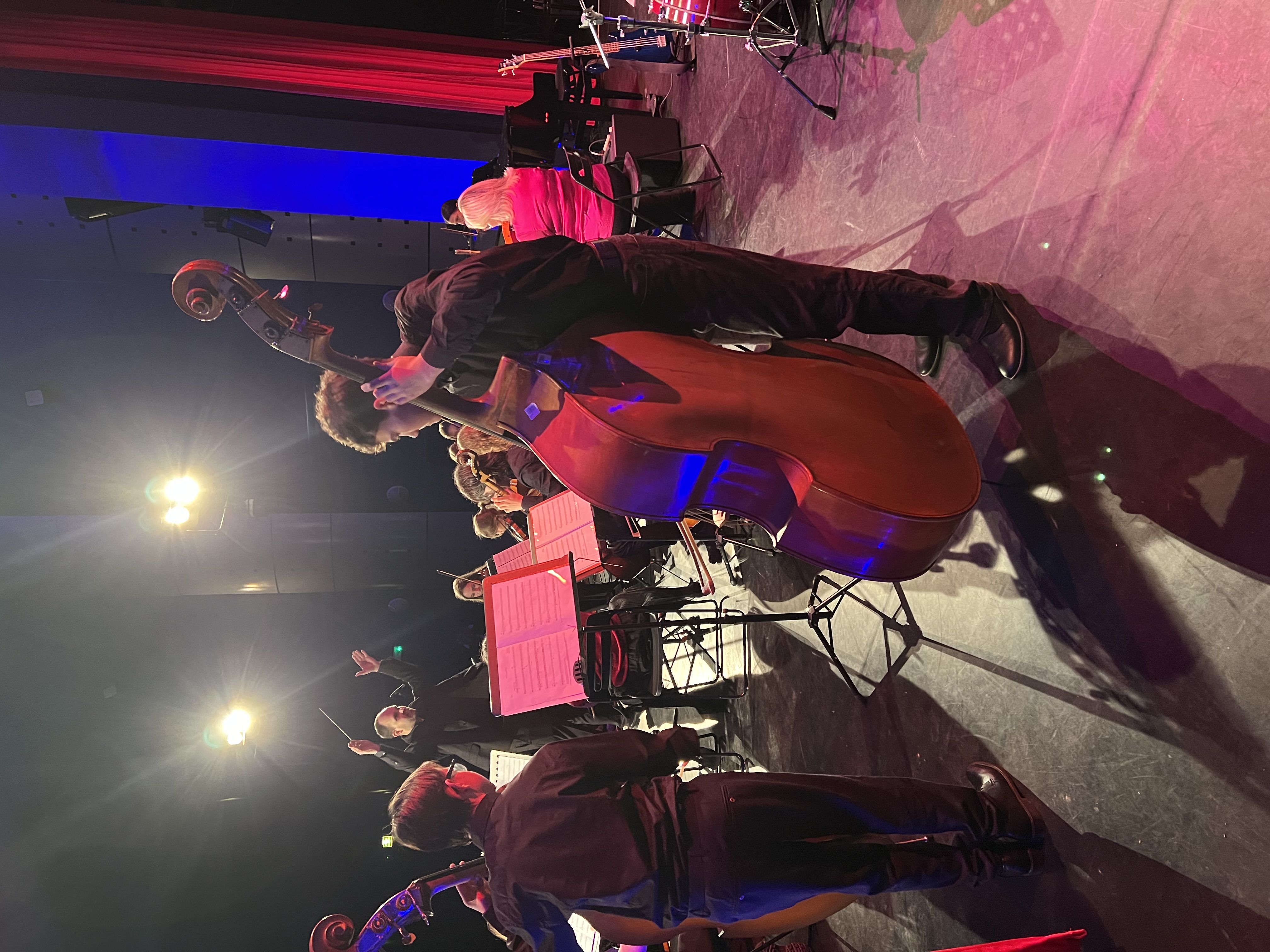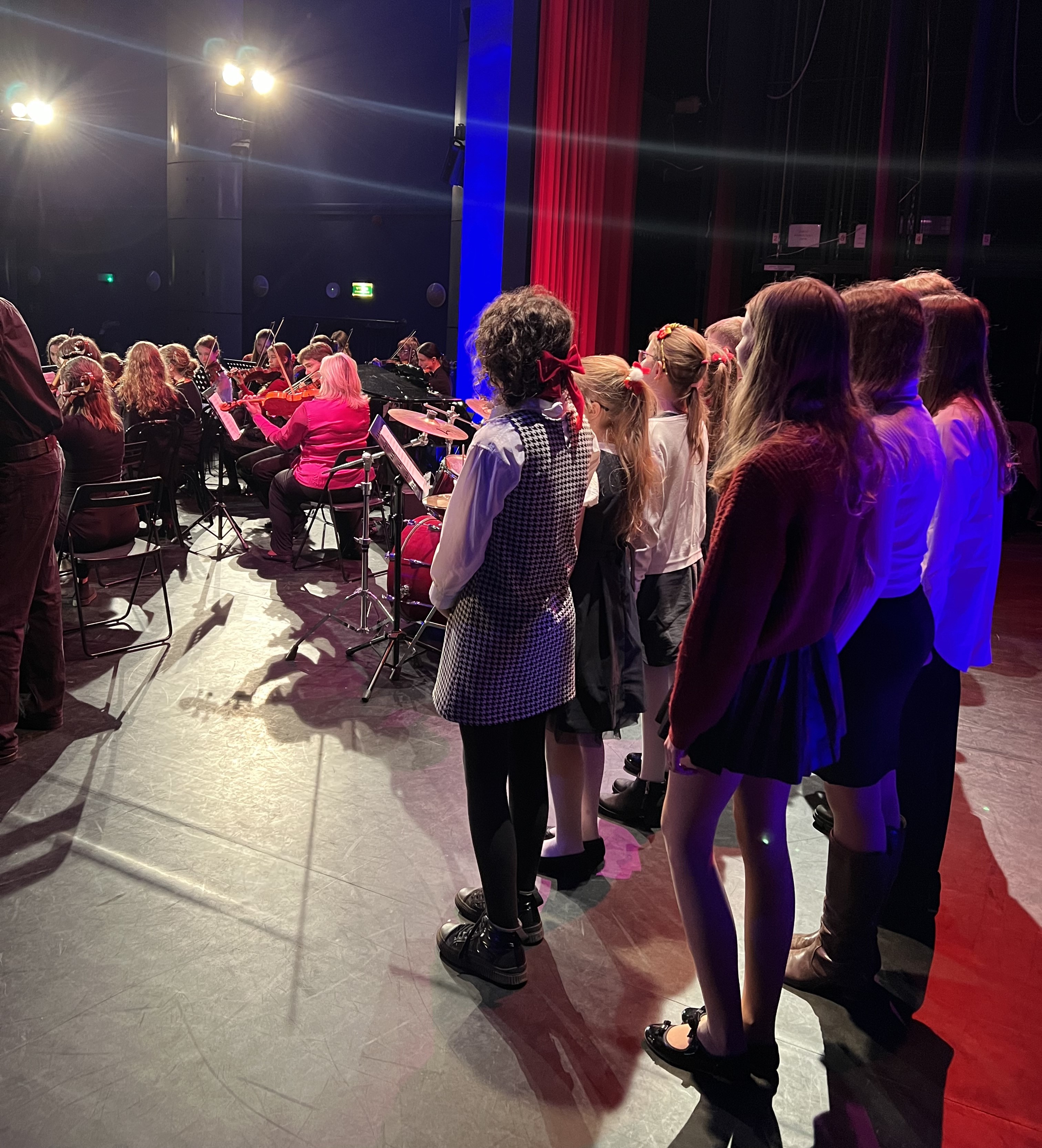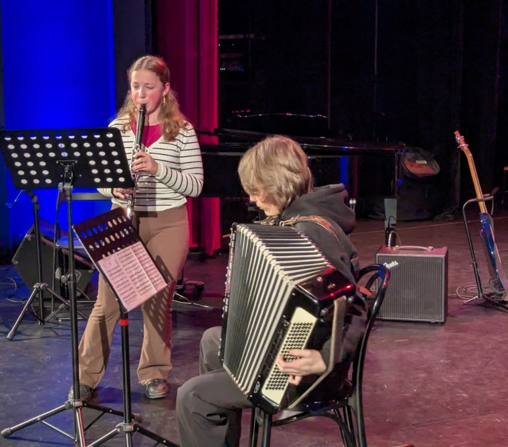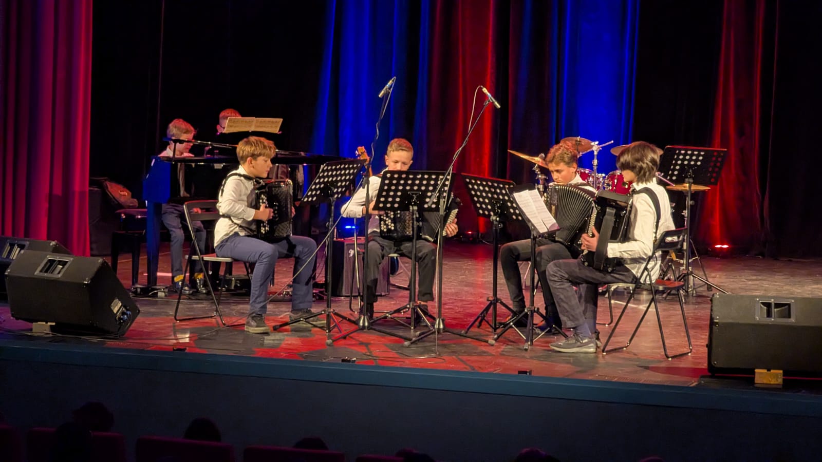 Na tle nieba z zorzą polarną i zaśnieżonym lasem, elementy karnawałowe (balony, serpentyny, maska karnawałowa) i akcenty świąteczne (choinka, renifery). Kolorowy tekst informujący o ogólnoszkolnym koncercie kolędowo-karnawałowym, zaplanowanym na 25 stycznia 2025 w Centrum Kultury Pafawag przy ul. Chociebuskiej.
