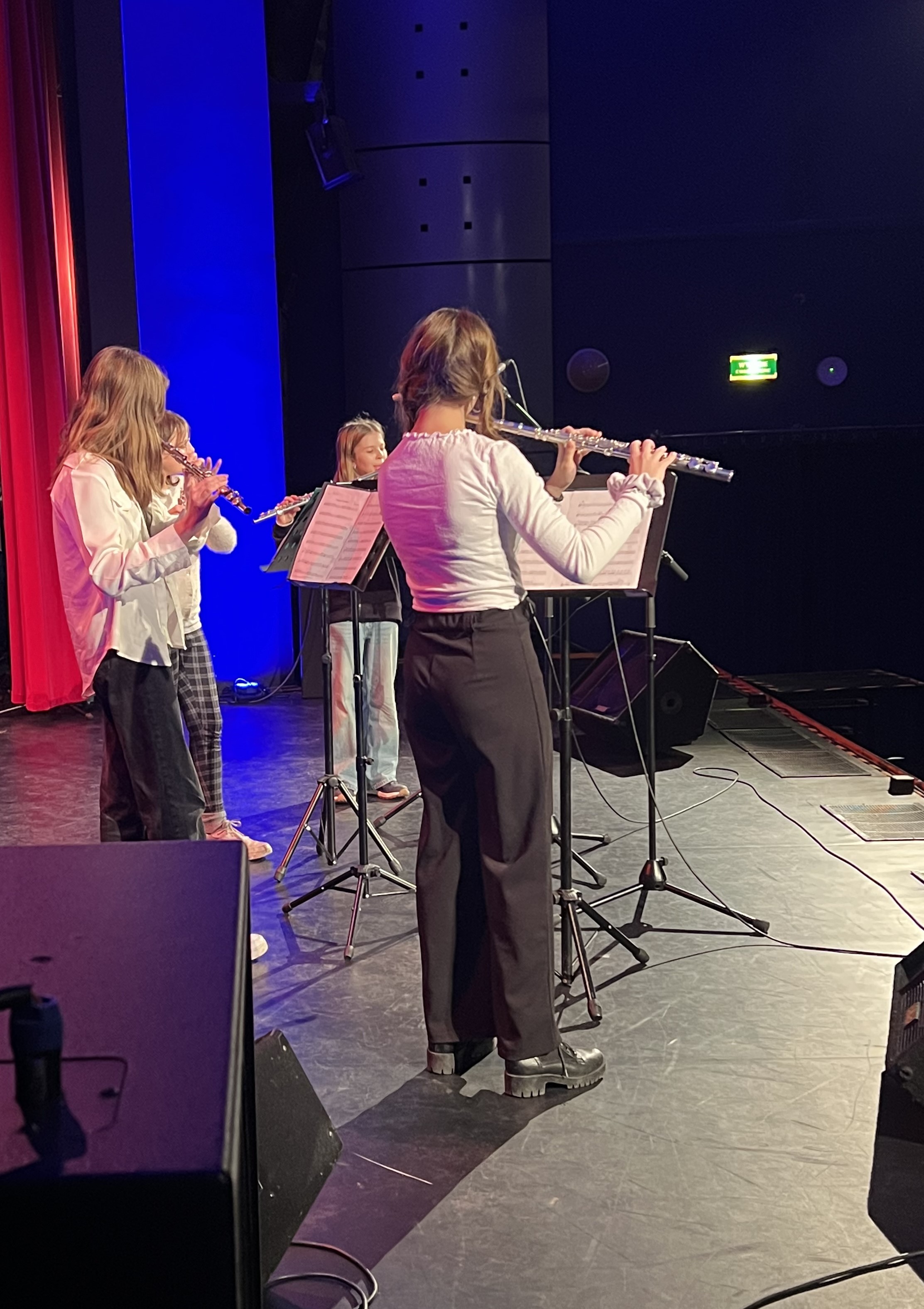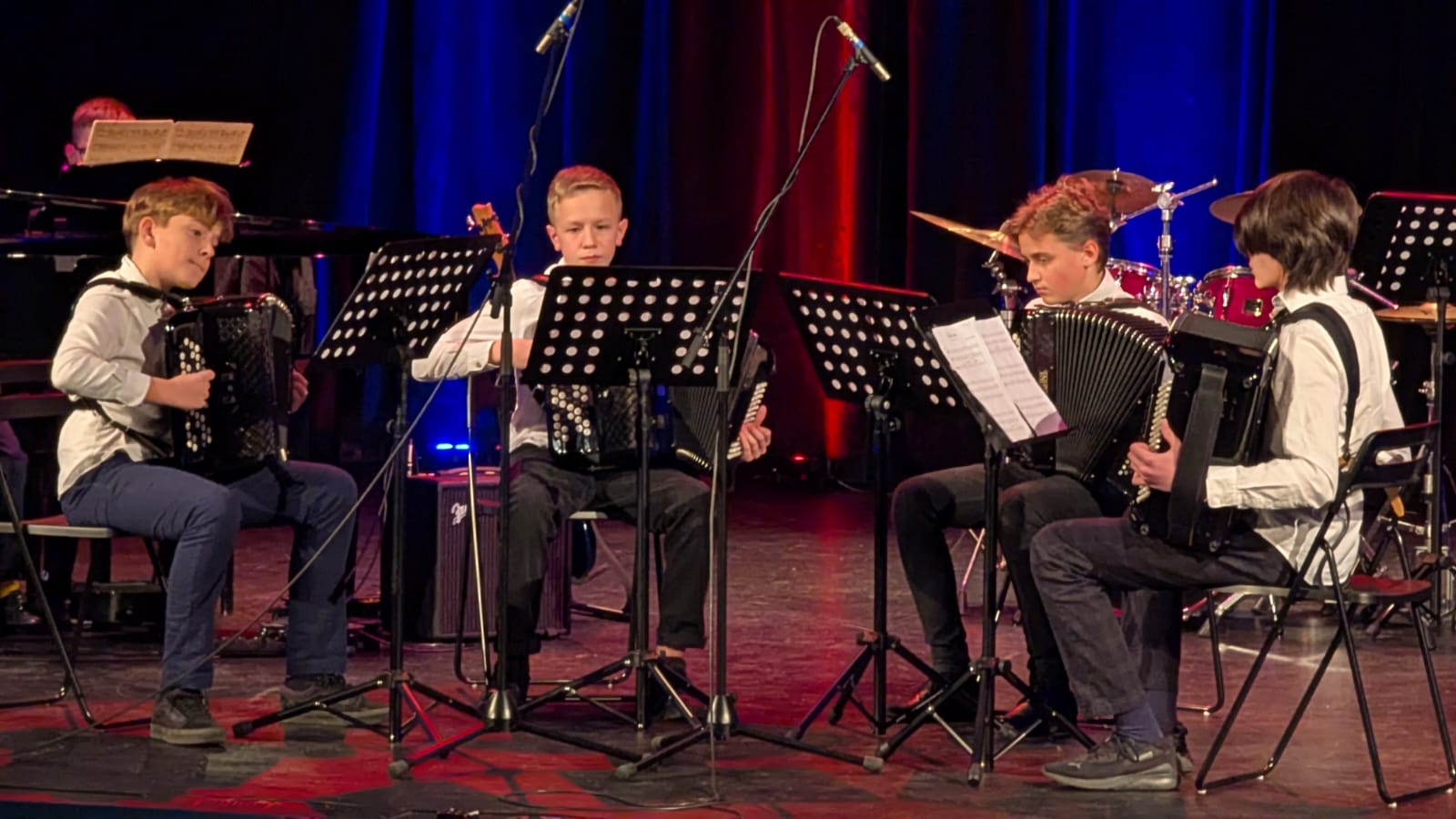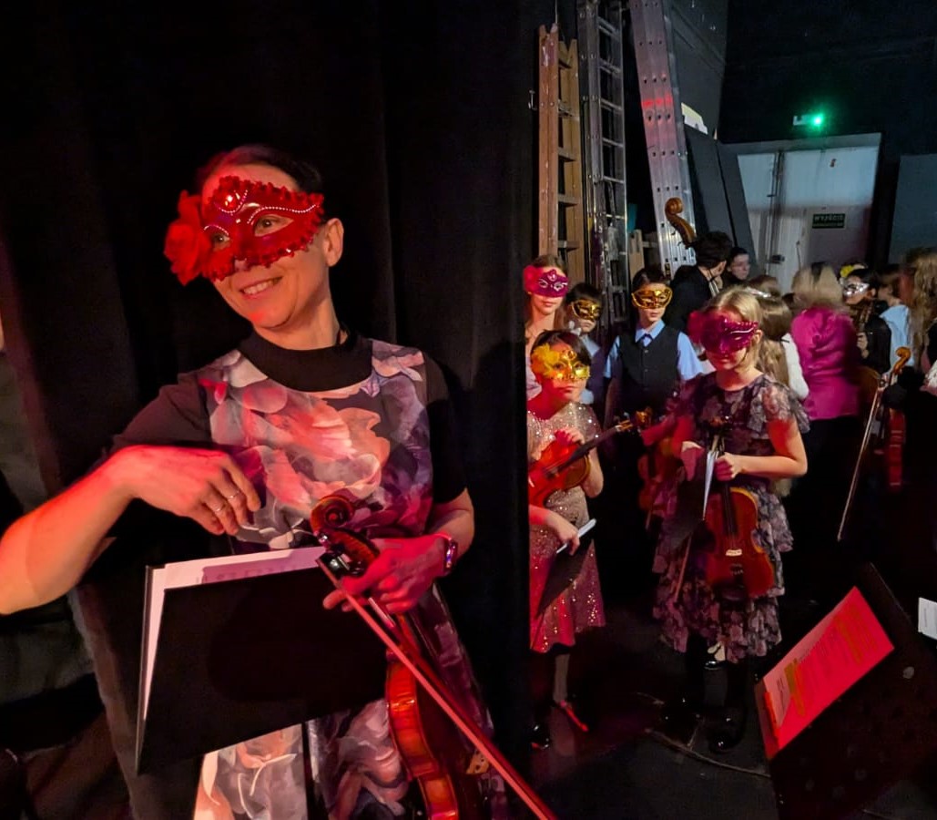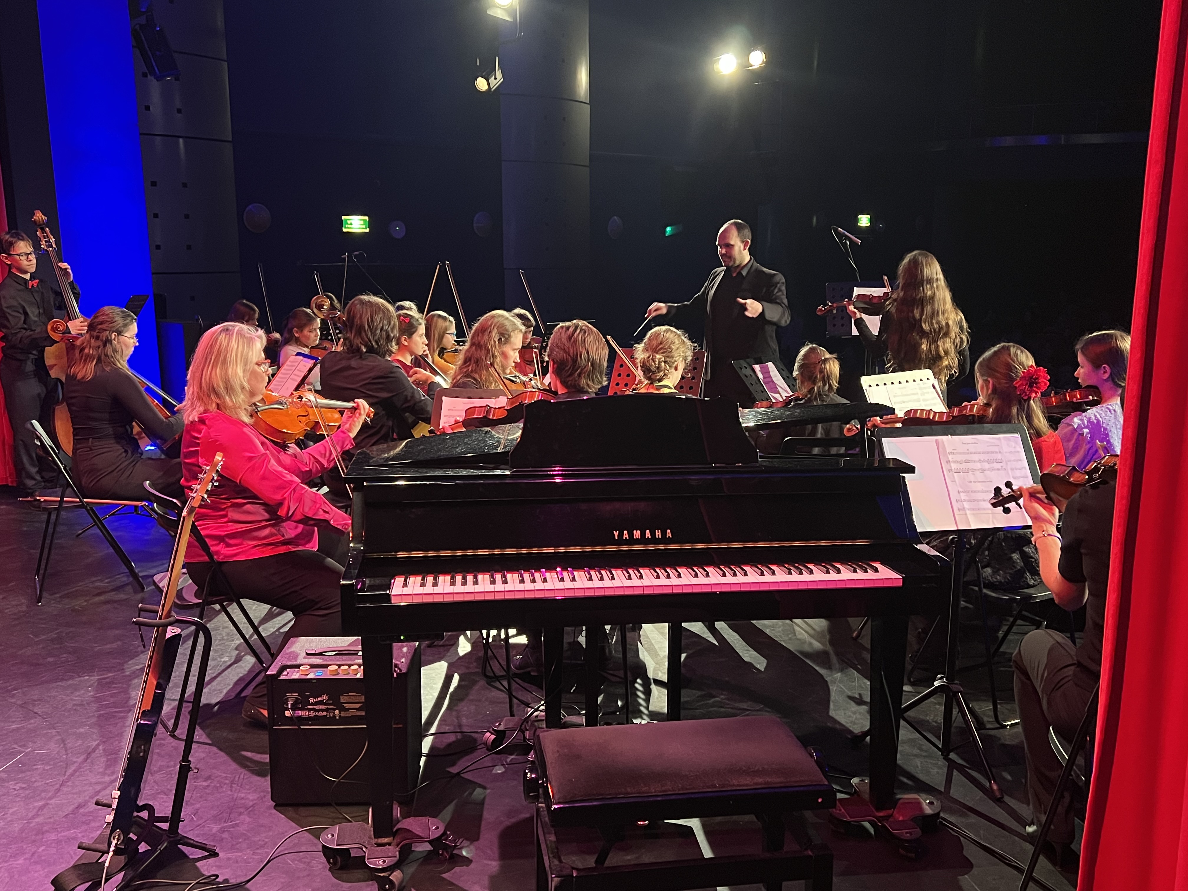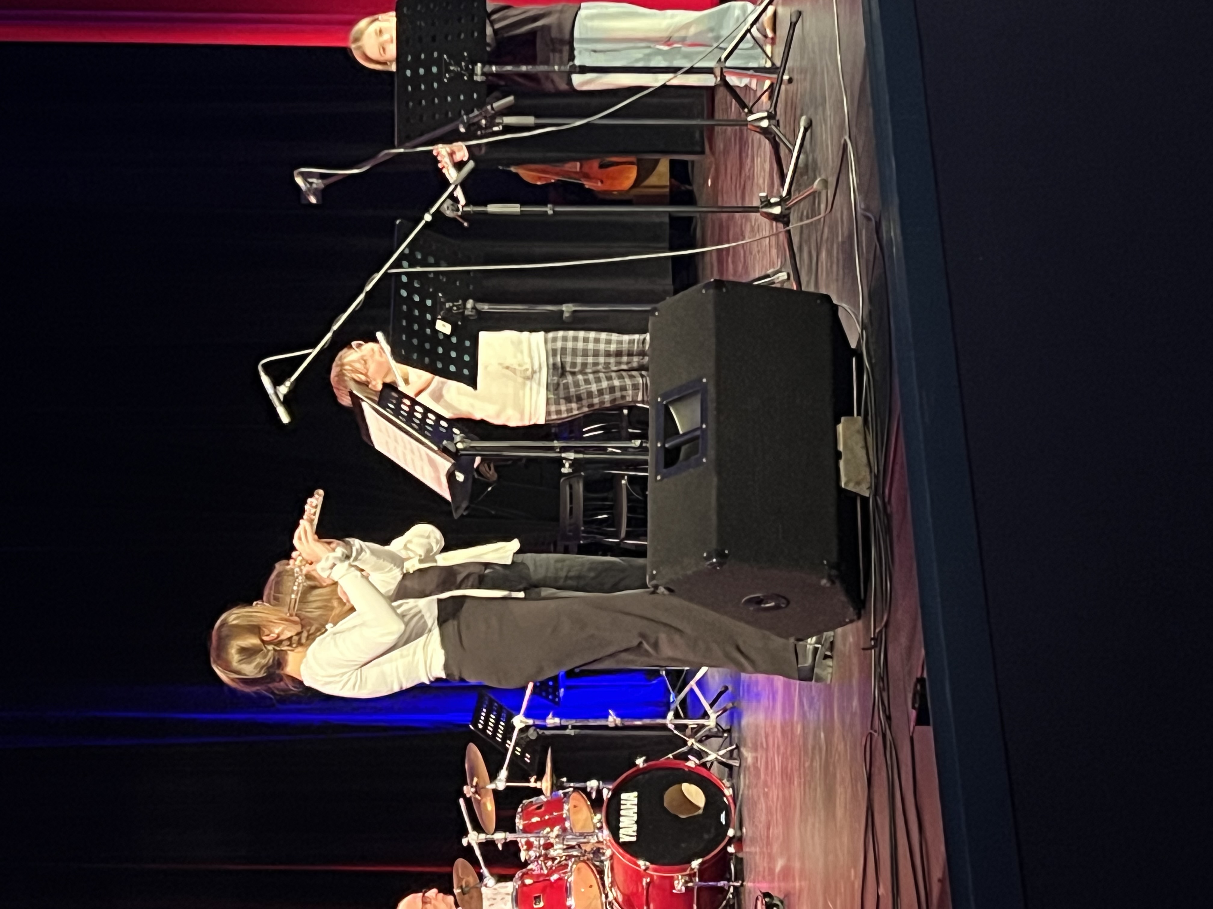 Na tle nieba z zorzą polarną i zaśnieżonym lasem, elementy karnawałowe (balony, serpentyny, maska karnawałowa) i akcenty świąteczne (choinka, renifery). Kolorowy tekst informujący o ogólnoszkolnym koncercie kolędowo-karnawałowym, zaplanowanym na 25 stycznia 2025 w Centrum Kultury Pafawag przy ul. Chociebuskiej.