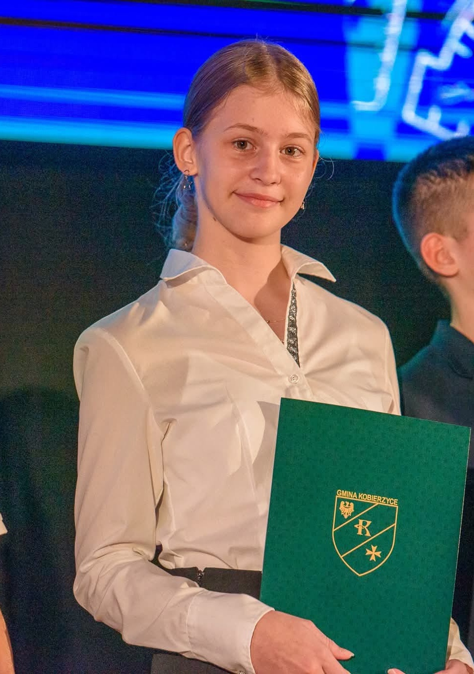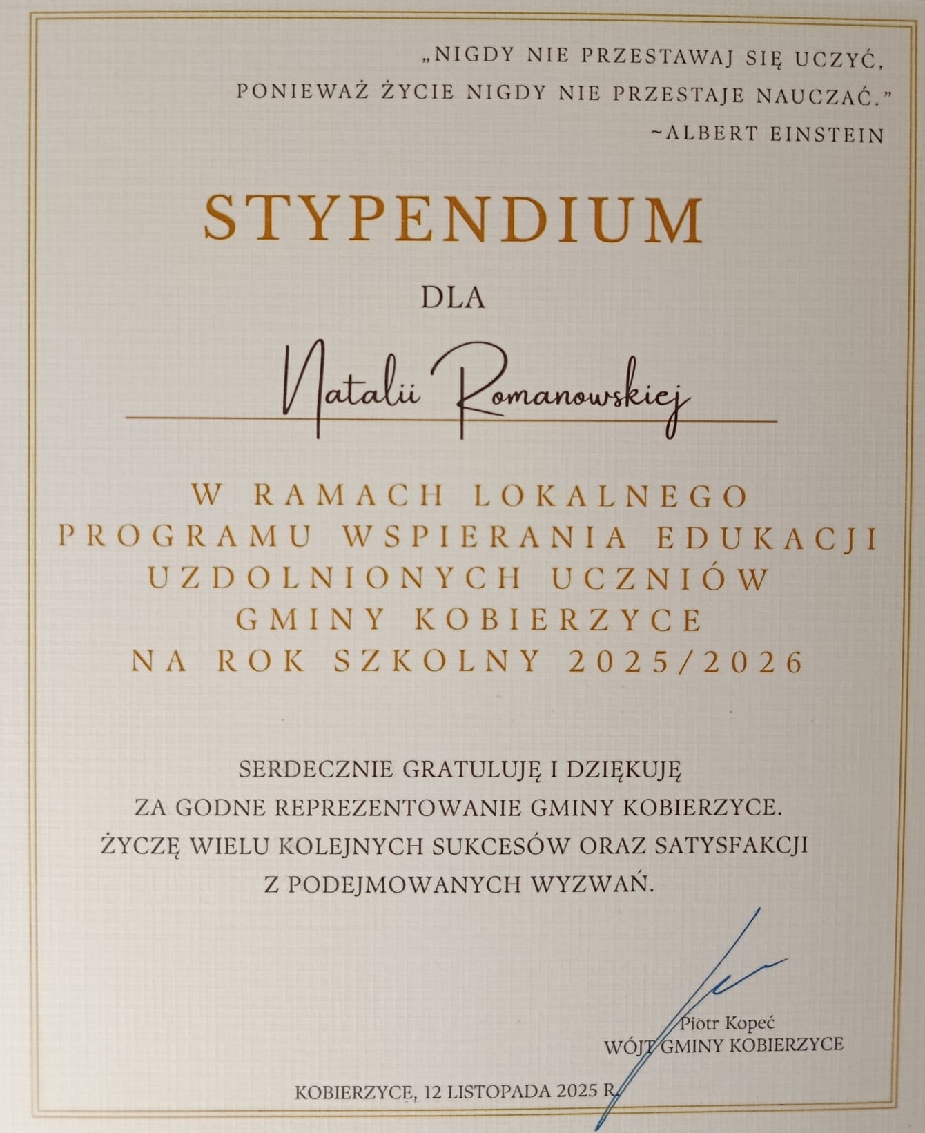 Natalia Romanowska (absolwentka szkoły w roku szkolnym 2024/2025) została stypendystką w ramach Lokalnego Programu Wspierania Edukacji Uzdolnionych Uczniów Grminy Kobierzyce na rok szkolny 2025/2026. Natalia stypendium zawdziędza licznym nagrodom, które zdobyła w konkursach wokalnych, do których przygotowywała ją pani Małgorzata Kasperska.