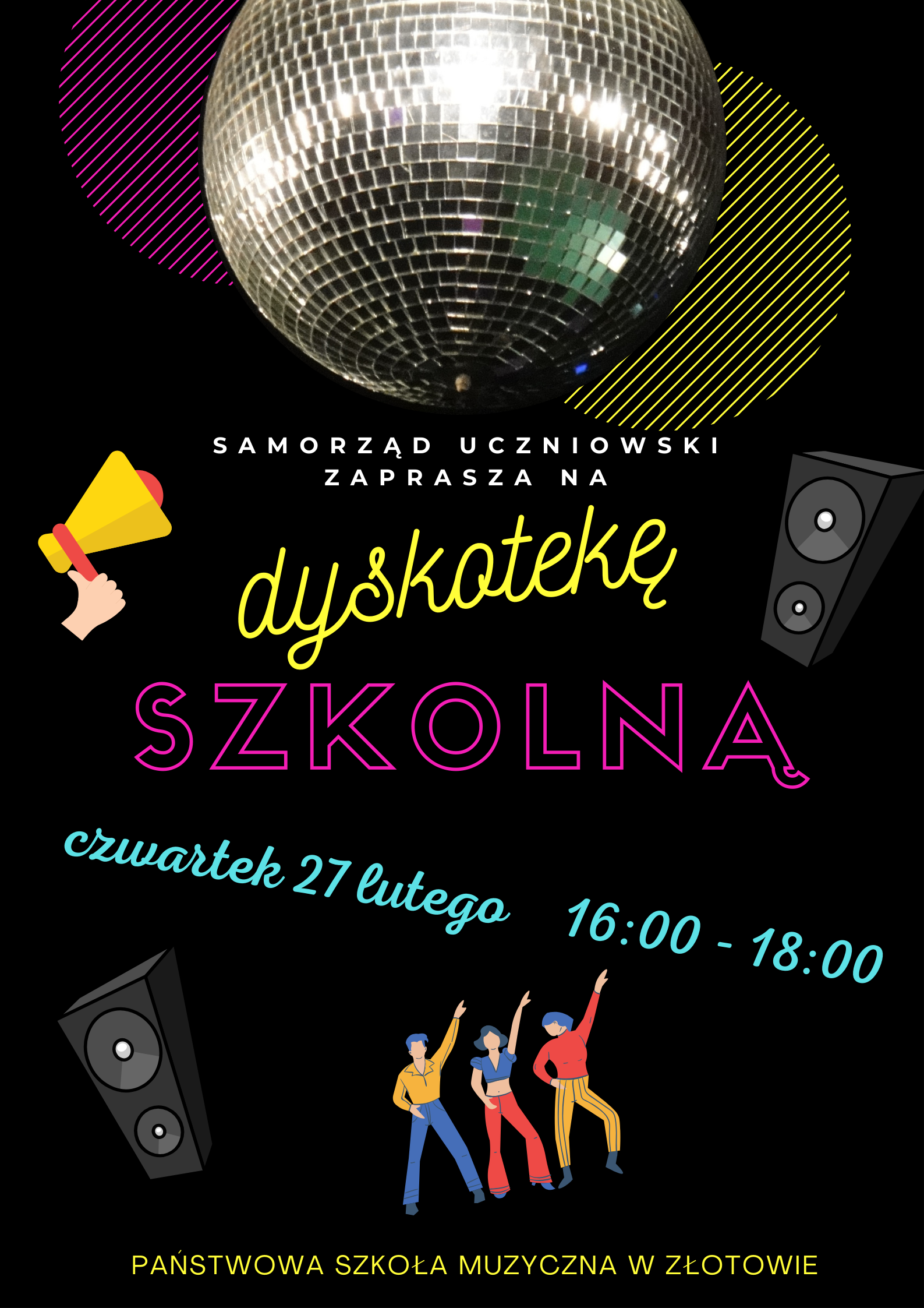Samorząd uczniowski PSM Złotów zaprasza serdecznie wszytkich uczniów na dyskotekę szkolną.