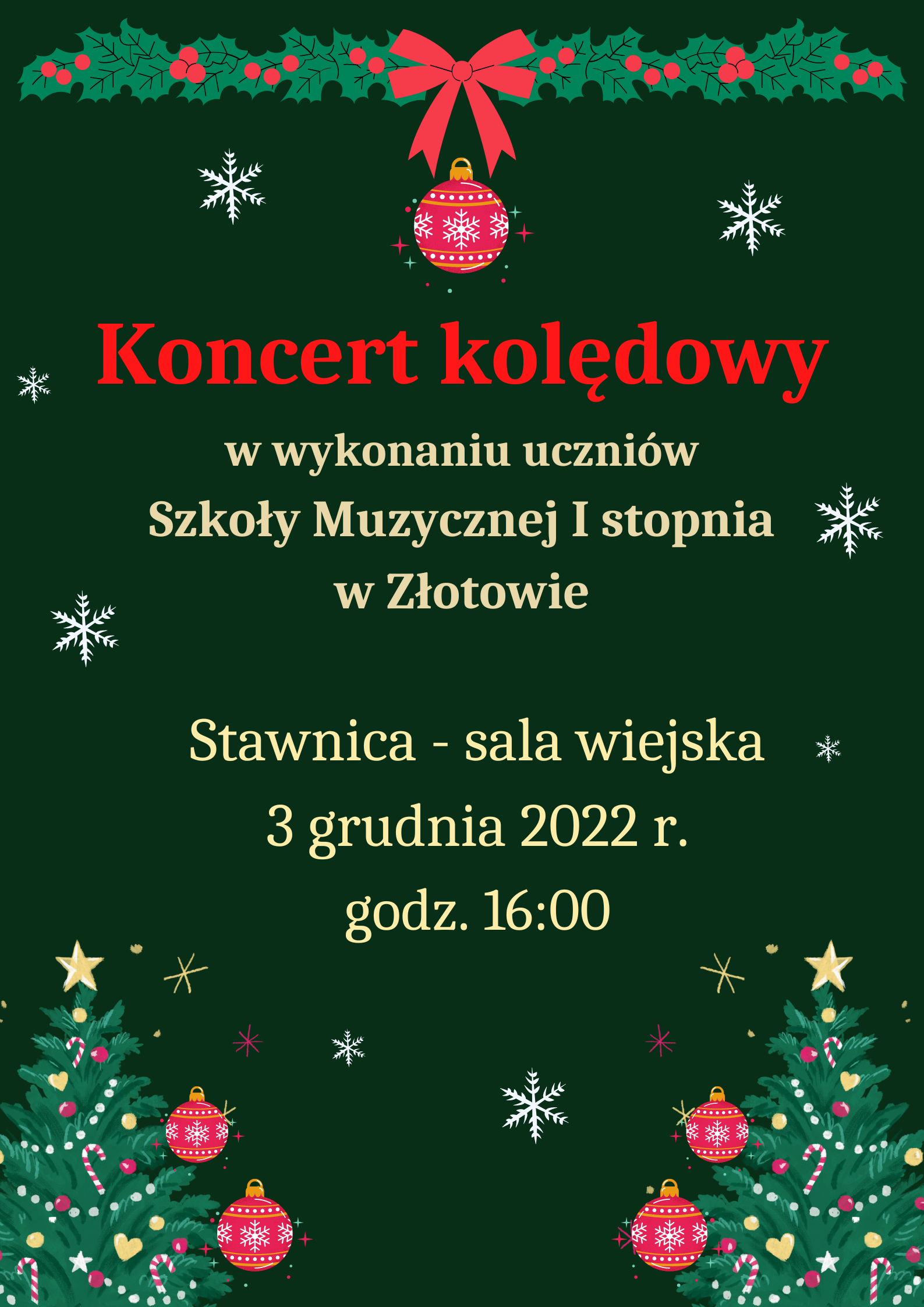 3 grudnia 2022 r. w sali wiejskiej w Stawnicy na zaproszenie Niepublicznej Szkoły Podstawowej w Stawnicy odbędzie się koncert kolęd i pastorałek w wykonaniu uczniów SM I stopnia w Złotowie.