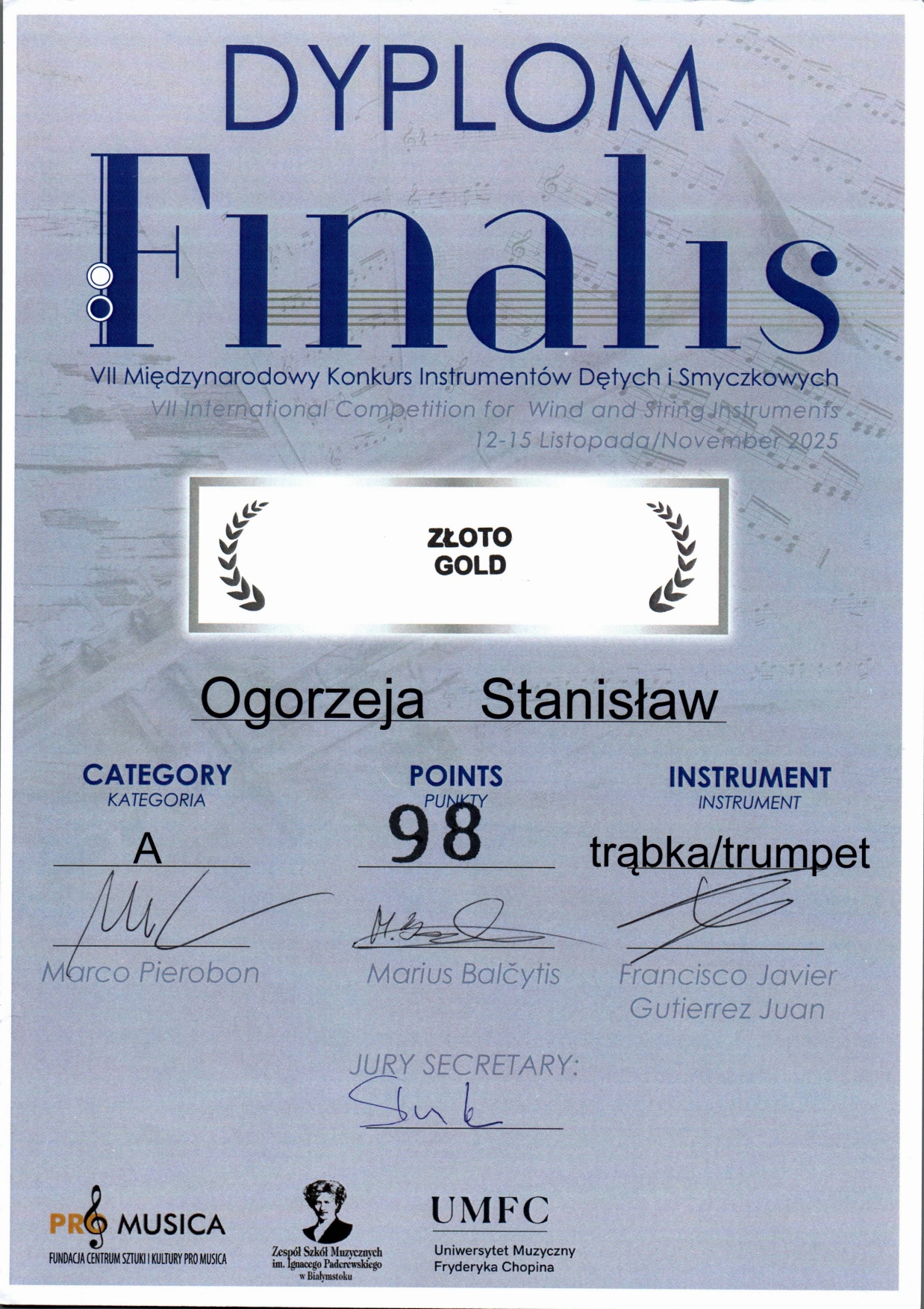 Tym razem Stasiu z przytupem zdobył 1 miejsce w VII Międzynarodowym Konkursie Instrumentów Dętych i Smyczkowych FINALIS 2025 w Białymstoku pokonując w swojej kategorii wszystkich uczestników z Polski i zagranicy.
