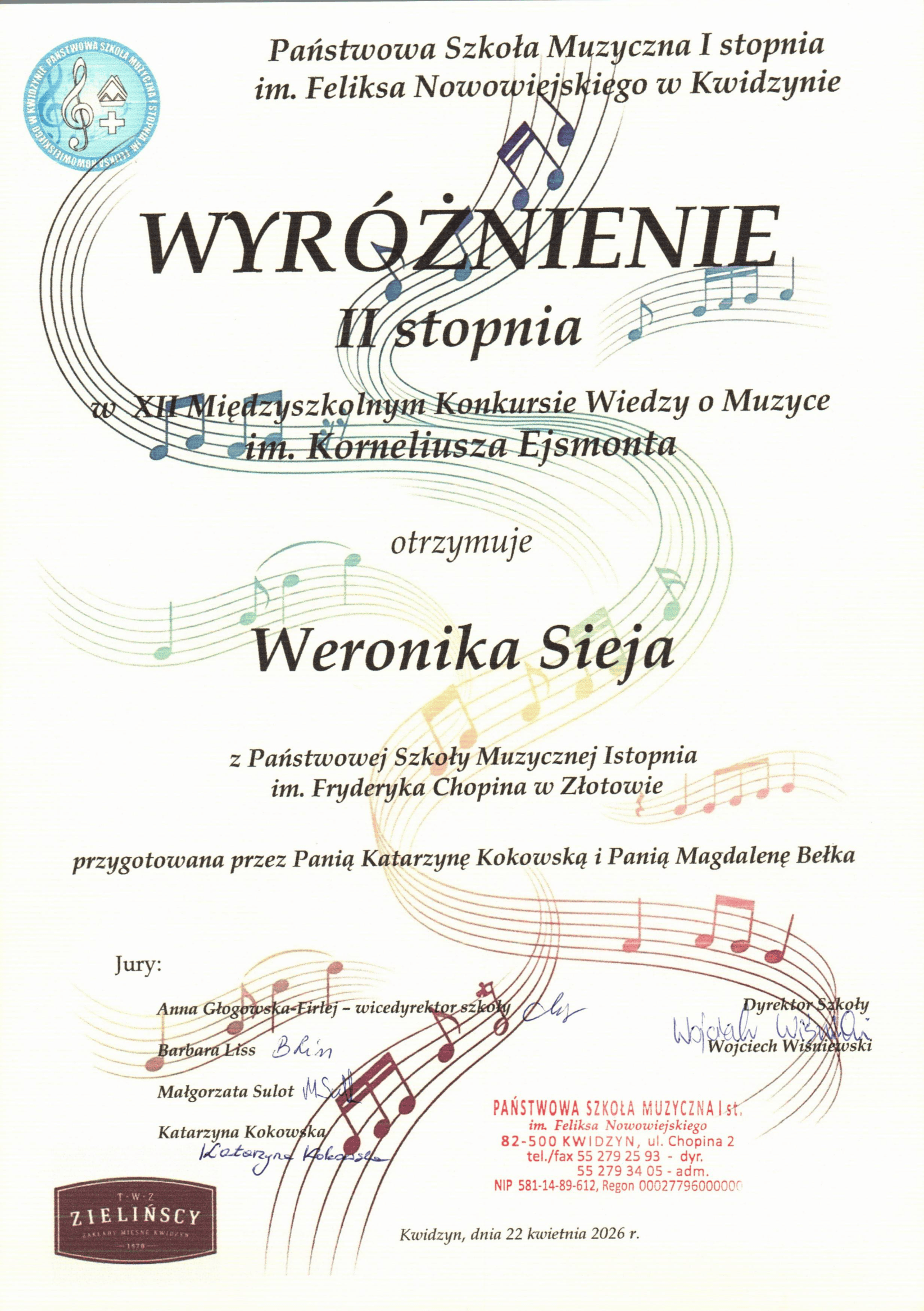 22.04.2026 r. reprezentacja uczniów Państwowej Szkoły Muzycznej I st. w Złotowie w składzie: Weronika Sieja, Zofia Mikłosz oraz Karim Osman wzięła udział w XII Międzyszkolnym Konkursie Wiedzy o Muzyce im. Korneliusza Ejsmonta organizowanym co roku przez Państwową Szkołę Muzyczną I st. im. Feliksa Nowowiejskiego w Kwidzynie. Konkurs wyłania najlepszych uczniów w zakresie wiedzy teoretycznej dotyczącej zasad muzyki i wiedzy o muzyce.