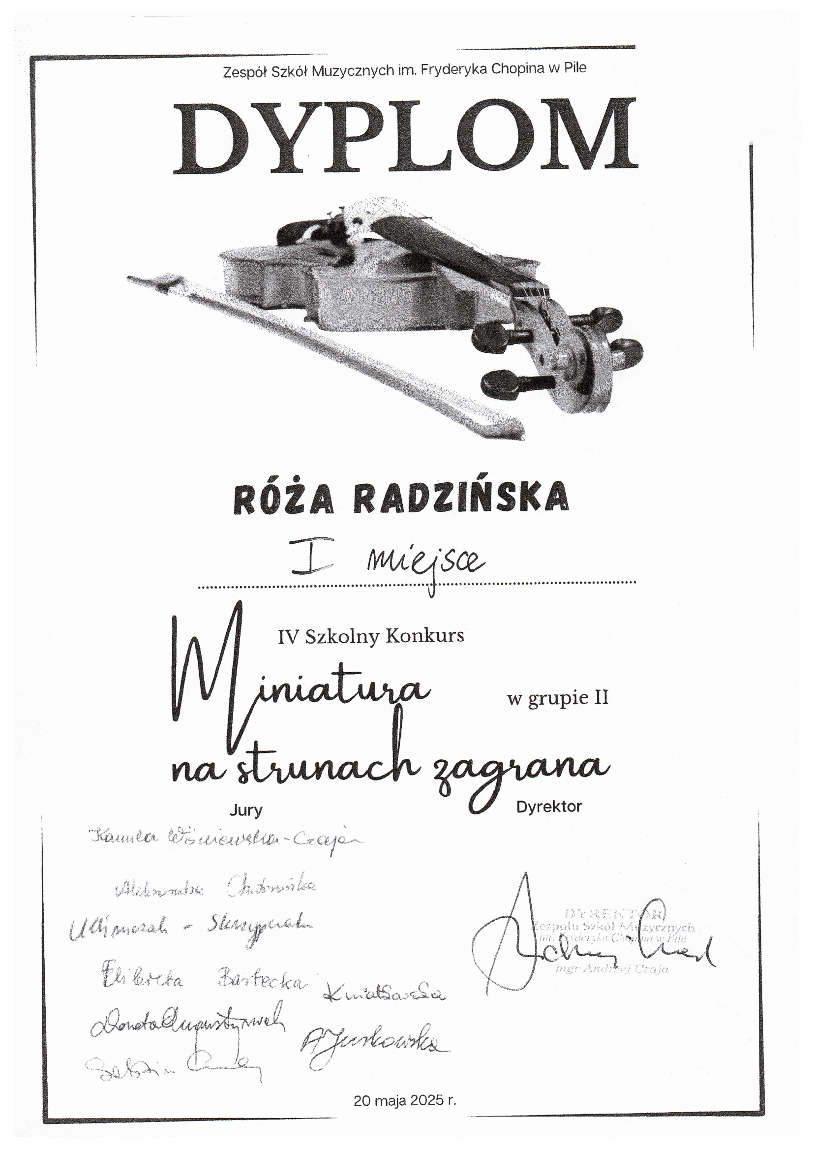 20 maja br. nasze uczennice, Róża Radzińska oraz Martyna Kołodziejska, z klasy skrzypiec p. Sebastiana Czai odniosły sukces w konkursie skrzypcowym "Miniatura na strunach zagrana" organizowanym przez Zespół Szkół Muzycznych w Pile.