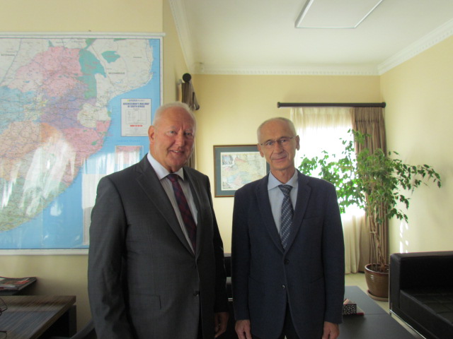 Ambassador Andrzej Kanthak congratulates Prof Janusz Pawęska on the high distinction at the SAMRC Scientific Merit Awards 2021