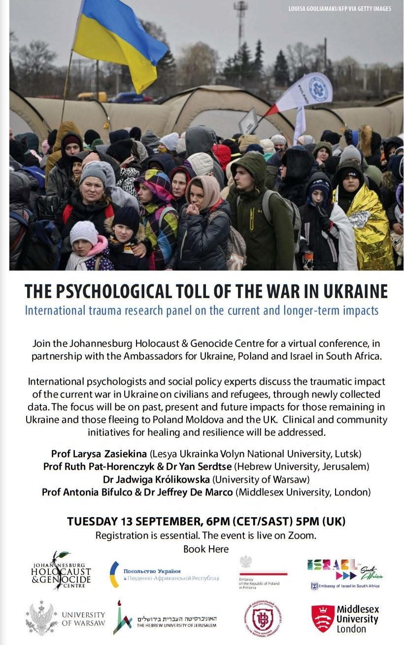 The Johannesburg Holocaust & Genocide Centre, in cooperation with the Embassies of Israel, Poland and Ukraine, organized an extremely interesting and important conference on the traumatic and destructive impact of the ongoing war in Ukraine on the human psyche. An international group of psychologists and social policy experts discussed the impact of the war on Ukrainian civilians and refugees in terms of psychological adaptation, as well as clinical and social initiatives to heal and build resilience among war victims.