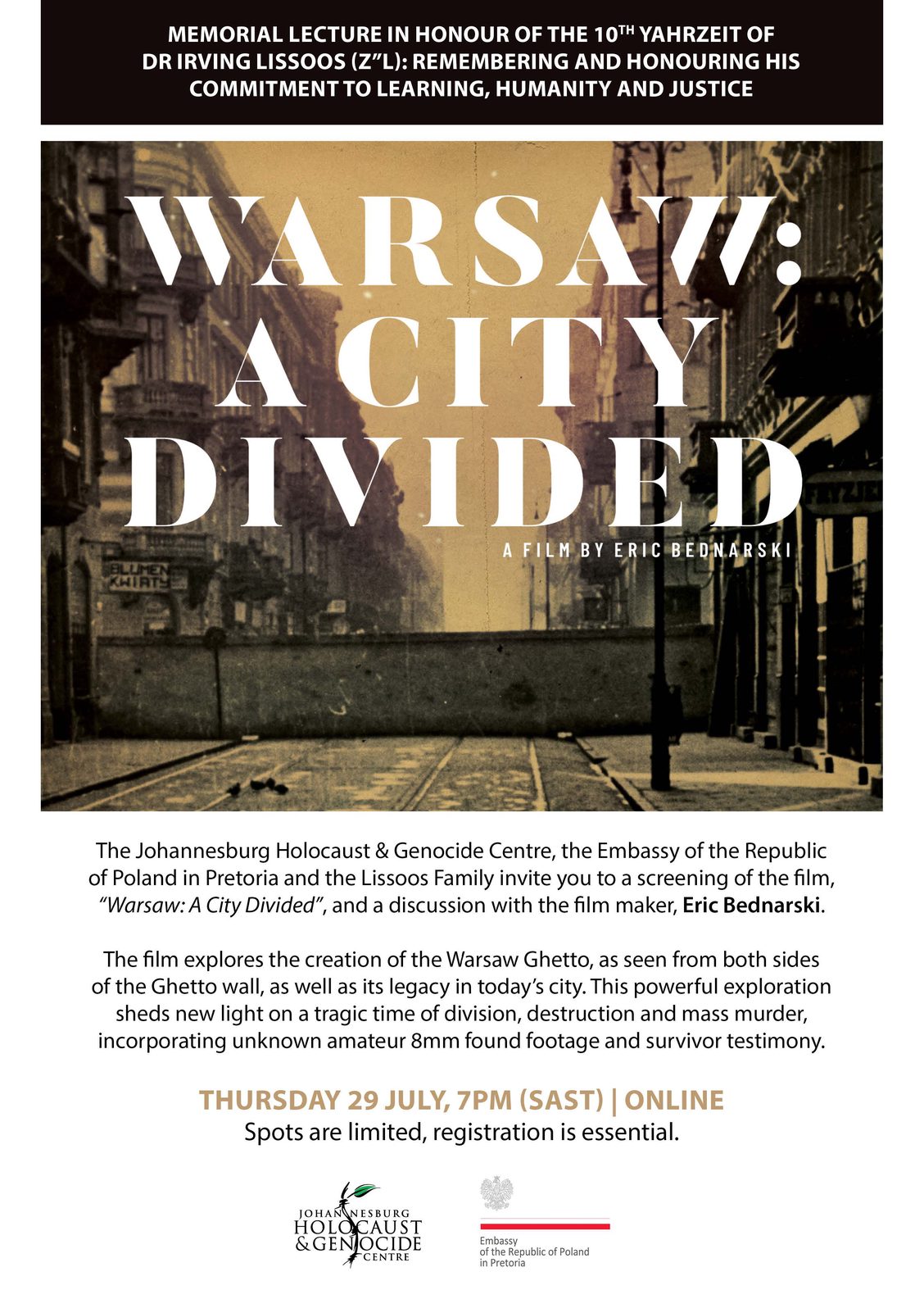 The on-line presentation of the documentary film directed by Eric Bednarski took place on July 29, 2021 at the Johannesburg Holocaust & Genocide Centre.