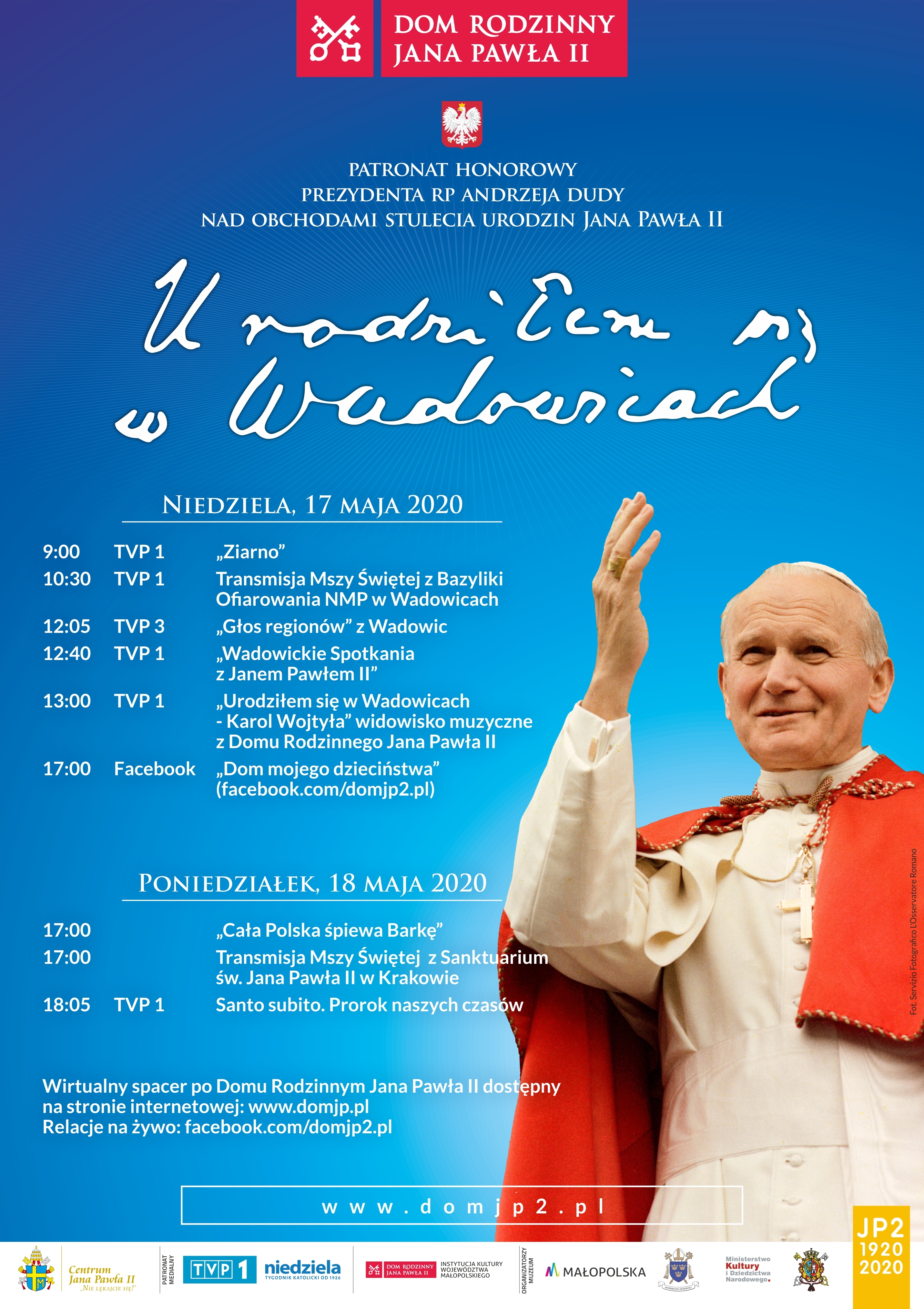 Ministerstwo Kultury i Dziedzictwa Narodowego – wraz z wieloma instytucjami kultury w całym kraju – zaplanowało szereg wydarzeń z okazji 100. rocznicy urodzin Jana Pawła II. W najbliższy poniedziałek, 18 maja, odbędzie się wyjątkowy koncert „Santo Subito – Prorok naszych czasów” organizowany przez Biuro Programu „Niepodległa” oraz TVP. Koncert będzie transmitowany o godz. 18.00 w TVP1 i na antenie Jedynki Polskiego Radia. Ze względu na obecną sytuację część wydarzeń z okazji rocznicy zostanie zrealizowana w Internecie, a część jest już przeniesiona na drugą połowę roku (16 października będziemy obchodzić 42. rocznicę wyboru kard. Karola Wojtyły na papieża). 100. rocznica urodzin Jana Pawła II obchodzona jest pod auspicjami UNESCO.