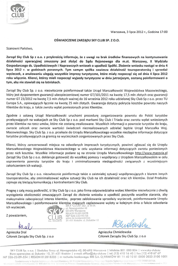 http://www.sky-club.eu/komunikat o ogłoszeniu upadłości. Zarząd Sky Club Sp. z o.o. z informuje, że „z uwagi na brak środków finansowych na kontunuowanie działalności operacyjnej zmuszony jest złożyć do sądu rejonowego dla m.st. Warszawy, X Wydziału Gospodarczego ds. Upadłościowych i Naprawczych wniosek o upadłość Spółki. Złożenie wniosku nastąpi w dniu 4 lipca 2012 r. w godzinach porannych. Tym samym spółka zawiesza działalność turoperatorską i sprzedaż wycieczek, a anulowaniu ulegają wszystkie imprezy turystyczne, które miały rozpocząć się od dnia 4 lipca 2012 r. włącznie. (…)"