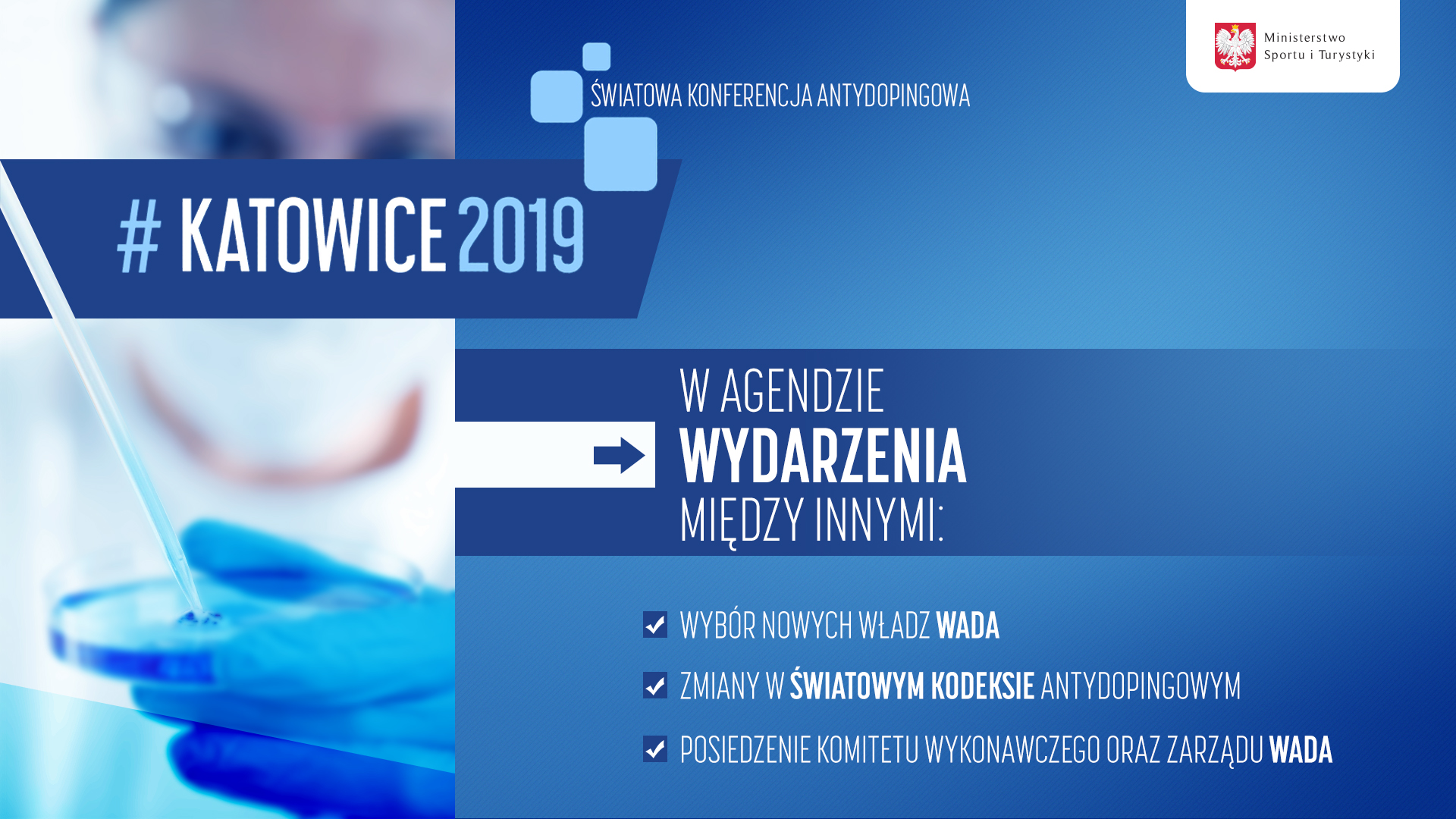 W środę, 4 kwietnia 2018 roku w Katowicach Minister Witold Bańka oraz Prezydent Miasta Katowice Marcin Krupa podpisali umowę na organizację w 2019 roku Światowej Konferencji Antydopingowej. Wydarzenie organizowane przez WADA odbędzie się w dniach 5-7 listopada 2019 roku w Międzynarodowym Centrum Kongresowym. Podczas Konferencji miasto odwiedzi około 2 000 przedstawicieli wszystkich środowisk zaangażowanych w walkę z dopingiem w sporcie z całego globu. W stolicy Górnego Śląska zostaną m.in. wybrane nowe władze WADA oraz zatwierdzone zmiany w Światowym Kodeksie Antydopingowym. Równocześnie z obradami odbędą się posiedzenia organów statutowych Światowej Agencji Antydopingowej – Komitetu Wykonawczego oraz Zarządu.