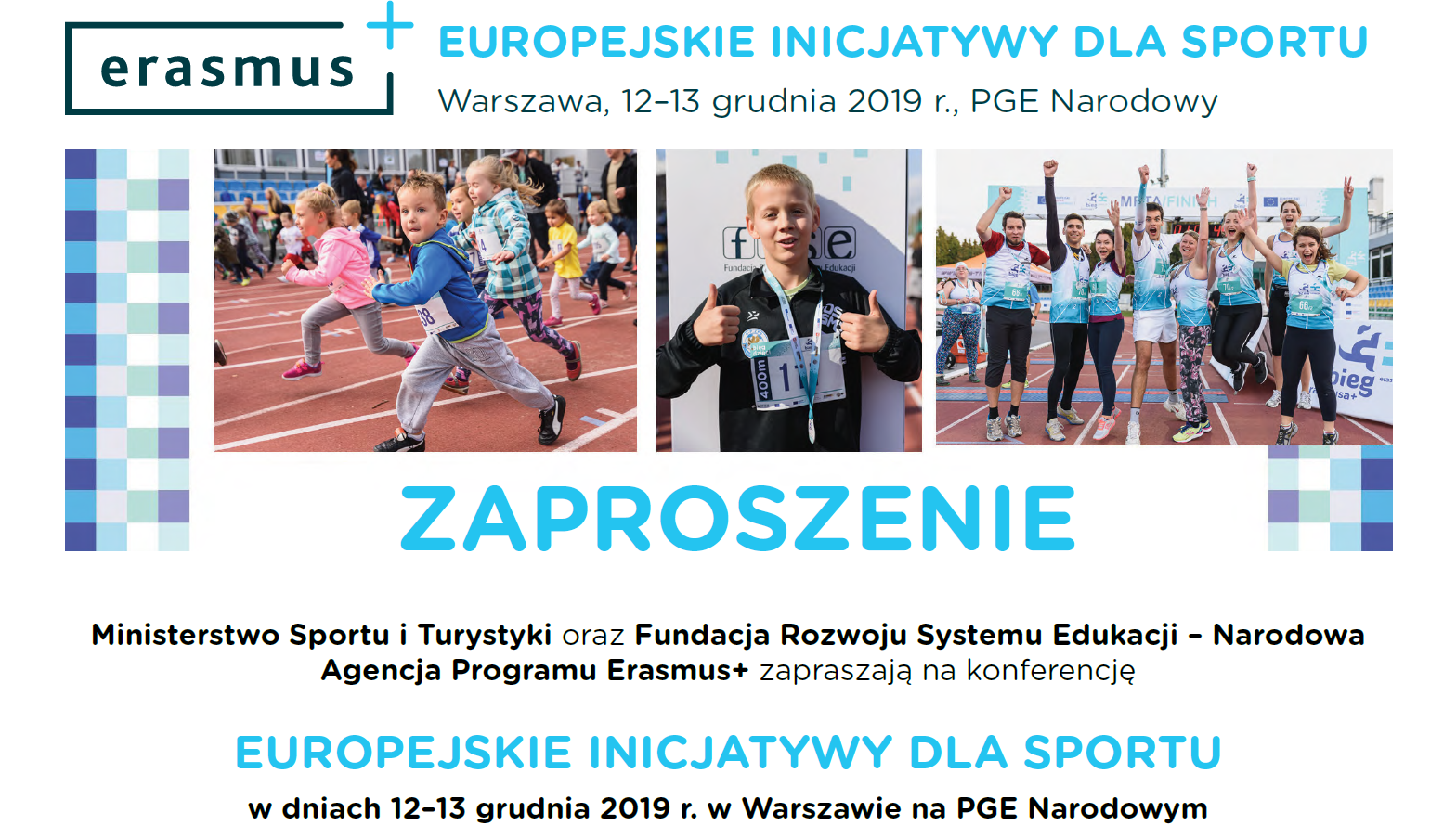 Ministerstwo Sportu i Turystyki oraz Fundacja Rozwoju Systemu Edukacji – Narodowa Agencja Programu Erasmus+ zapraszają na konferencję EUROPEJSKIE INICJATYWY DLA SPORTU w dniach 12–13 grudnia 2019 r. w Warszawie na PGE Narodowym.