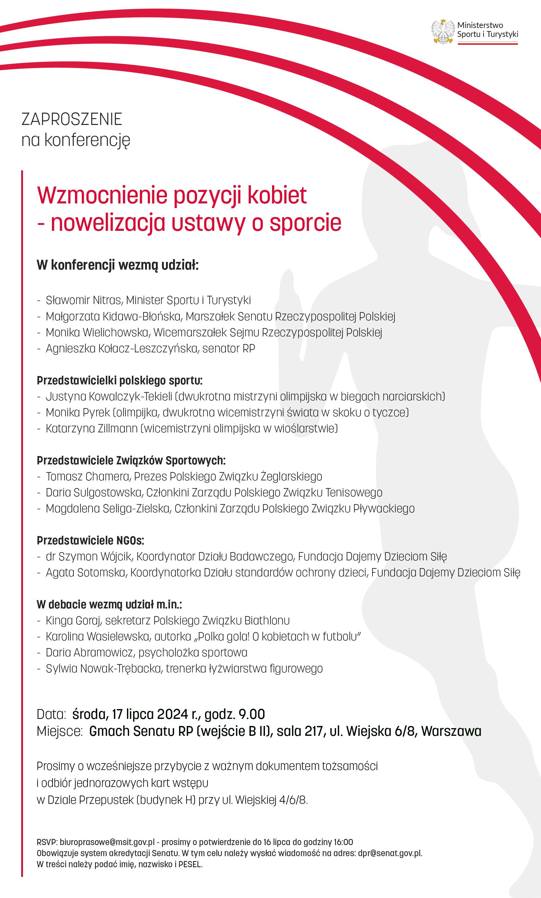 W środę, 17 lipca br. odbędzie się konferencja z udziałem Ministra Sportu i Turystyki Sławomira Nitrasa, Marszałek Senatu Rzeczpospolitej Polskiej Małgorzaty Kidawy-Błońskiej oraz Wicemarszałek Sejmu Rzeczpospolitej Polskiej Moniki Wielichowskiej.