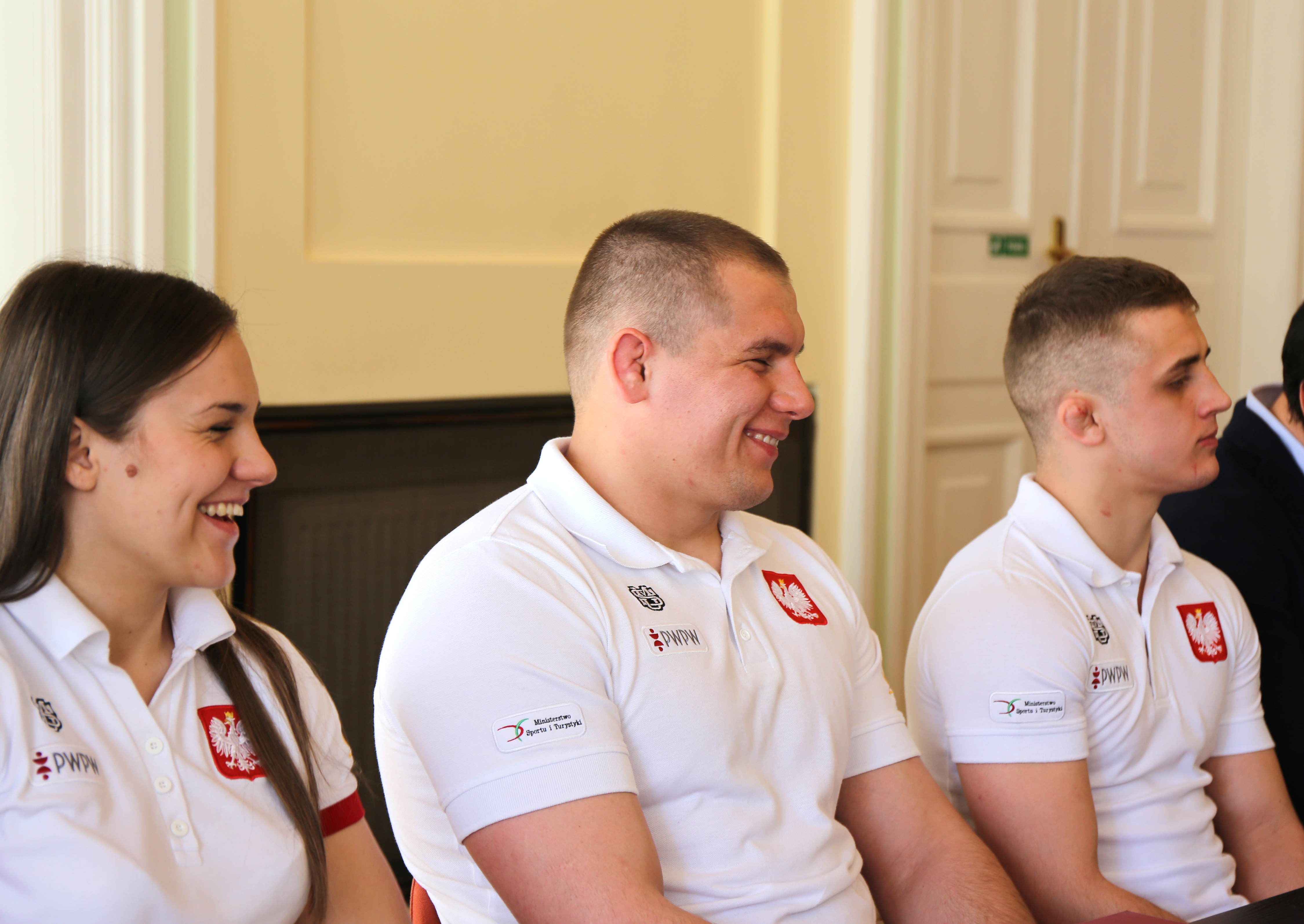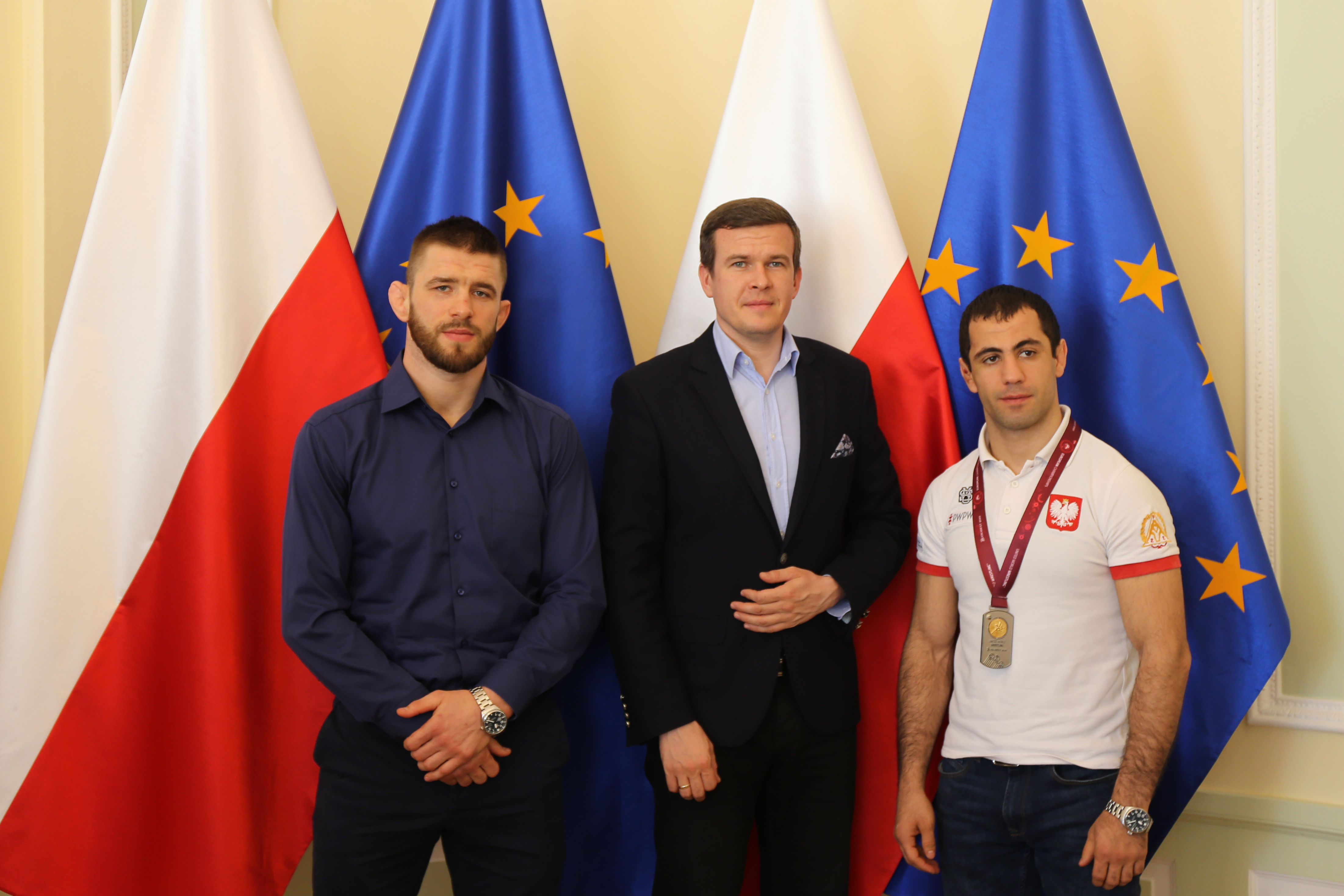 W środę 17 kwietnia br. minister Witold Bańka spotkał się z medalistami Mistrzostw Europy Seniorów oraz Młodzieżowych Mistrzostw Europy U-23 w Zapasach. W spotkaniu uczestniczył również Dyrektor Departamentu Sportu Wyczynowego MSiT Marcin Nowak, Prezes Polskiego Związku Zapaśniczego Andrzej Supron, Sekretarz Generalny PZZ Agnieszka Roszkiewicz oraz trenerzy: Yusup Abdusalamov – trener kadry stylu wolnego, Włodzimierz Zawadzki – trener kadry stylu klasycznego, Edward Barsegjan – trener asystent kadry stylu klasycznego i Piotr Krajewski – trener kadry kobiet.