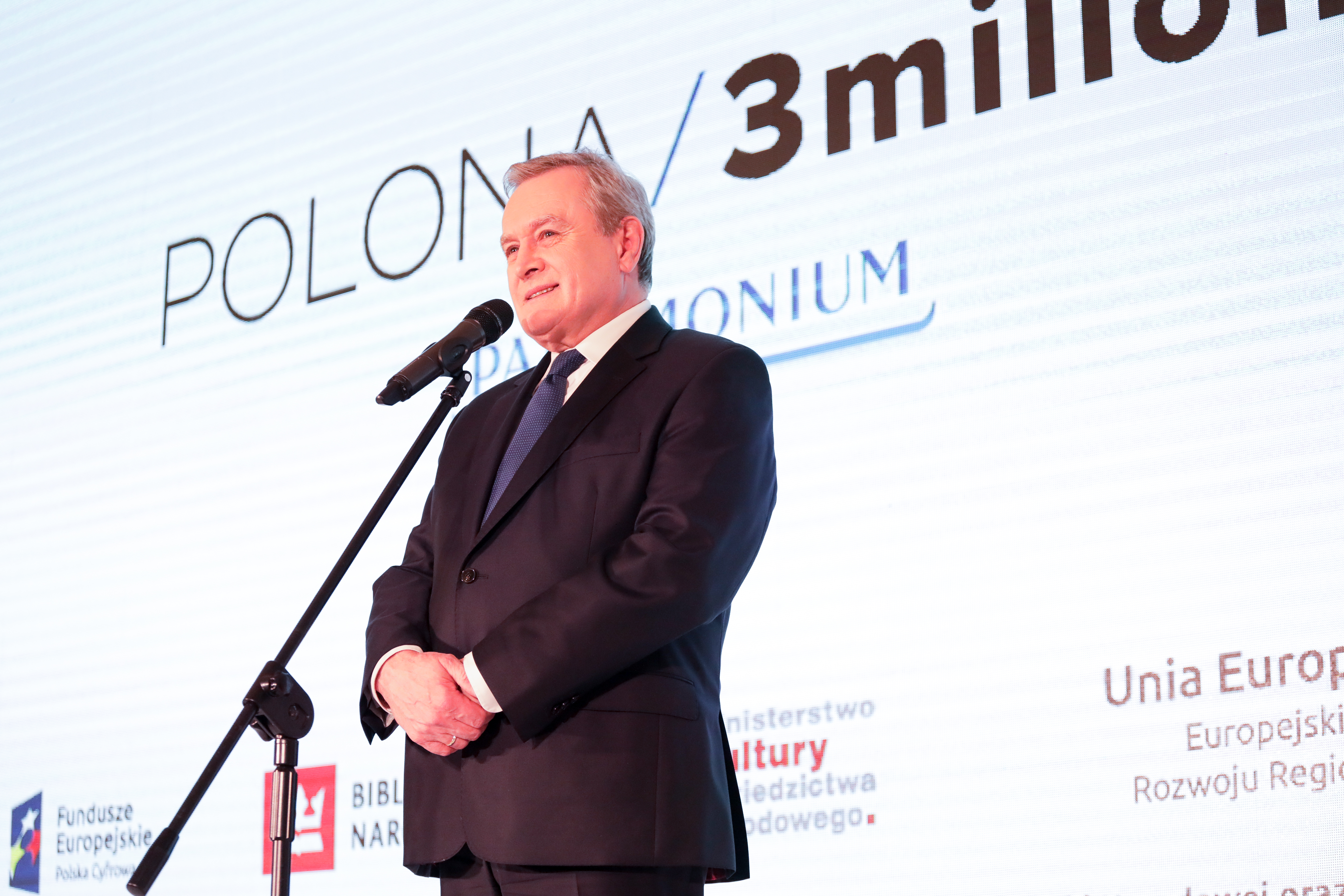 Wicepremier Gliński podkreślił, że dzięki Patrimonium – największemu w historii przedsięwzięciu z zakresu digitalizacji zbiorów bibliotecznych – wzbogaciła się cyfrowa biblioteka POLONA, w której każdy znajdzie cyfrowe kopie czasopism, rękopisów, książek z XIX i XX w., map, materiałów muzycznych i ikonograficznych.