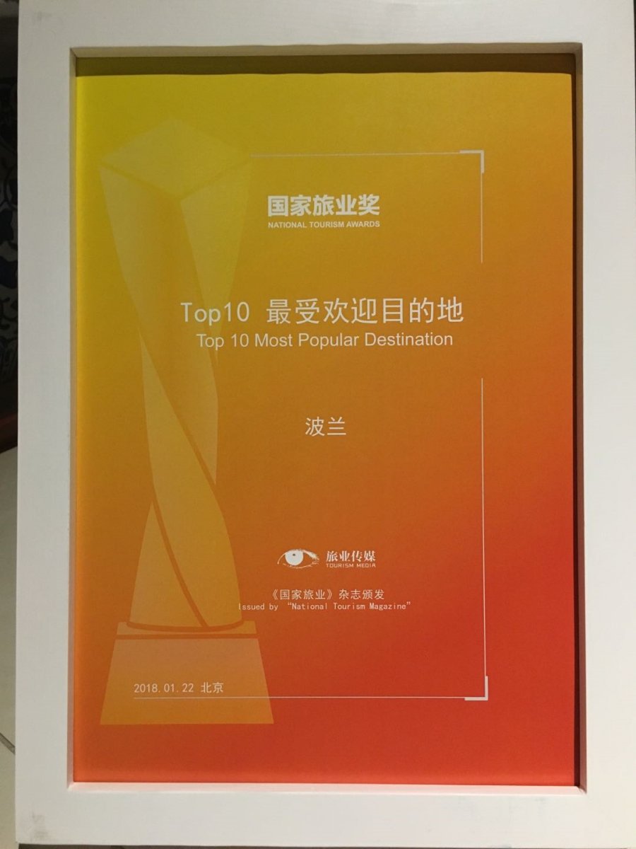 W Pekinie wręczono doroczne, prestiżowe nagrody turystyczne National Tourism Award. W kategorii „Najbardziej popularne cele podróży w 2017 roku” jednym z dziesięciu laureatów została Polska