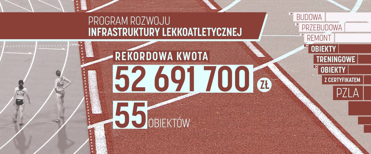 Dofinansowaniem w ramach Programu Rozwoju Infrastruktury Lekkoatletycznej realizowanego przez Ministerstwo Sportu i Turystyki zostały objęte zadania inwestycyjne dotyczące budowy, przebudowy lub remontu obiektów zarówno treningowych jak i umożliwiających profesjonalne współzawodnictwo. Kwota ponad 52 mln zł będzie wypłacana do 2020 roku.