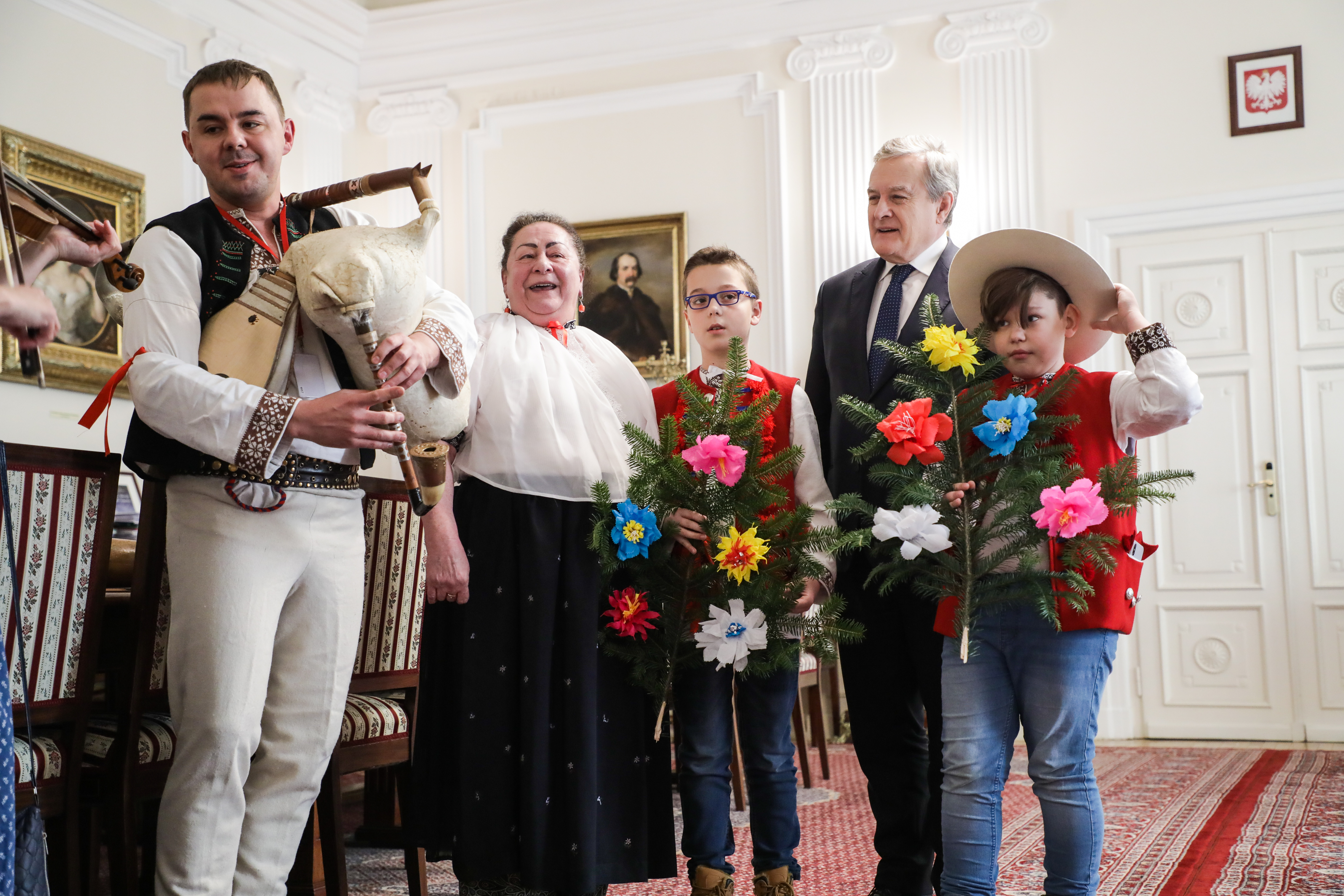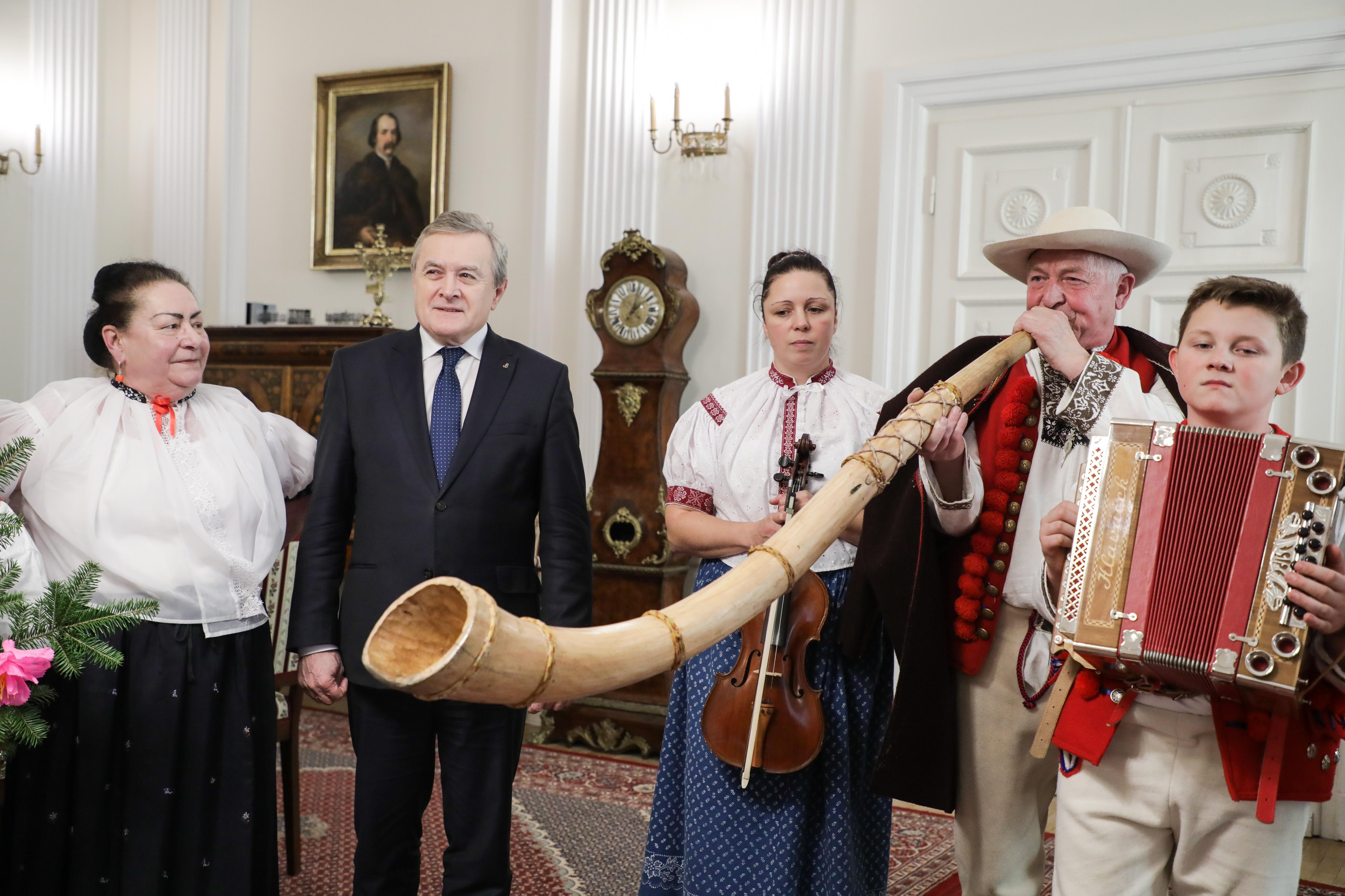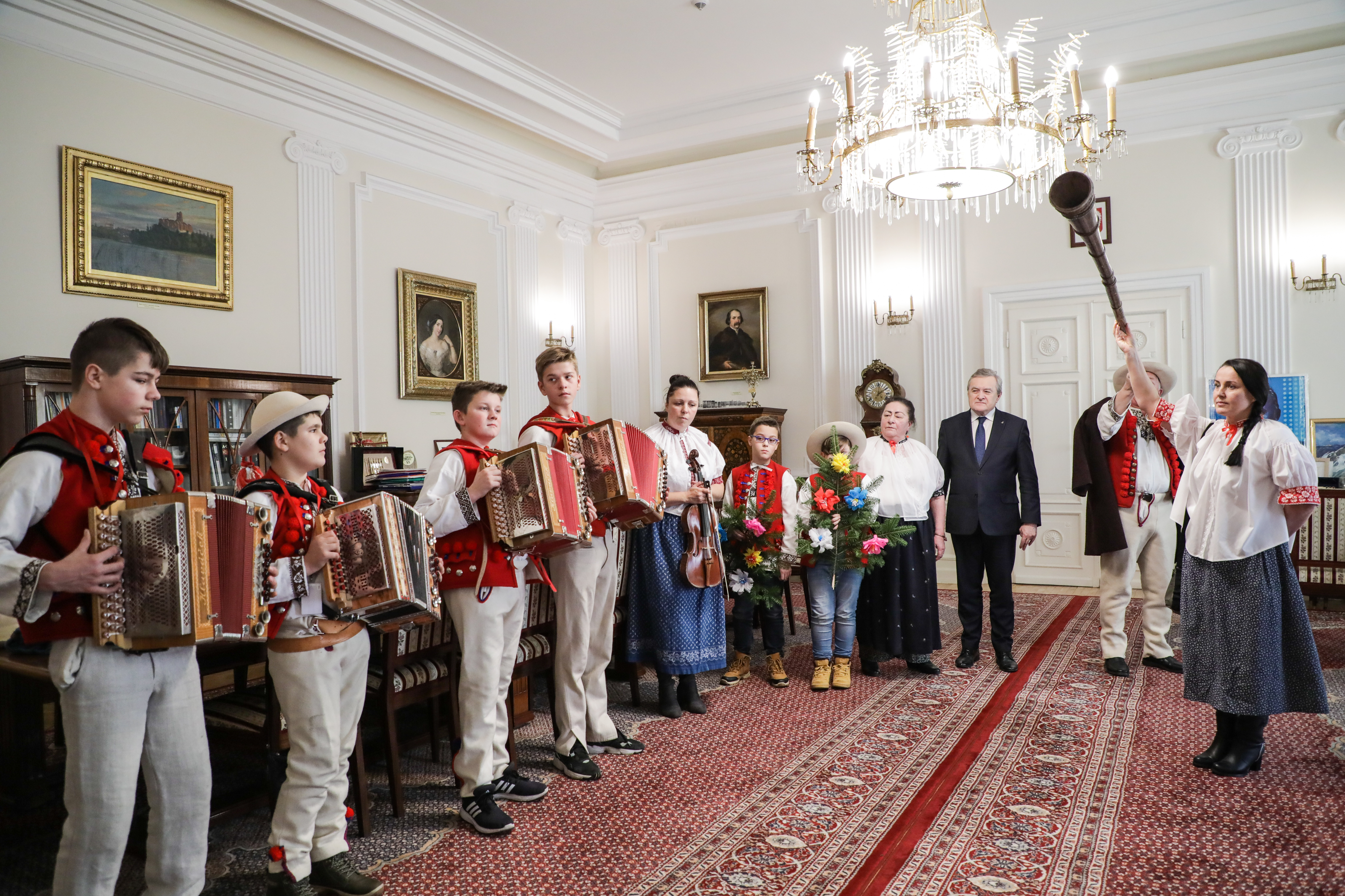 Dziś w Ministerstwie Kultury i Dziedzictwa Narodowego gościliśmy artystów ludowych z Trójwsi Beskidzkiej - Koniakowa, Istebnej i Jaworzynki, członków Regionalnego Zespołu „Koniaków” z Koniakowa. Większość z nich to młodzi muzycy kultywujący grę na tradycyjnych instrumentach pasterskich m.in. na gajdach, trombitach, fujarkach, rogach czy dzwonkach. Zespół kontynuuje wyjątkową tradycję przekazywaną z pokolenia na pokolenie w Beskidzie Śląskim. Obecność zespołu w Warszawie wiąże się z udziałem w rozpoczynającym się już 30 listopada XXXXIX Konkursie Gry na Instrumentach Pasterskich im. Kazimierza Uszyńskiego w Ciechanowcu, corocznie wspieranym przez MKiDN.