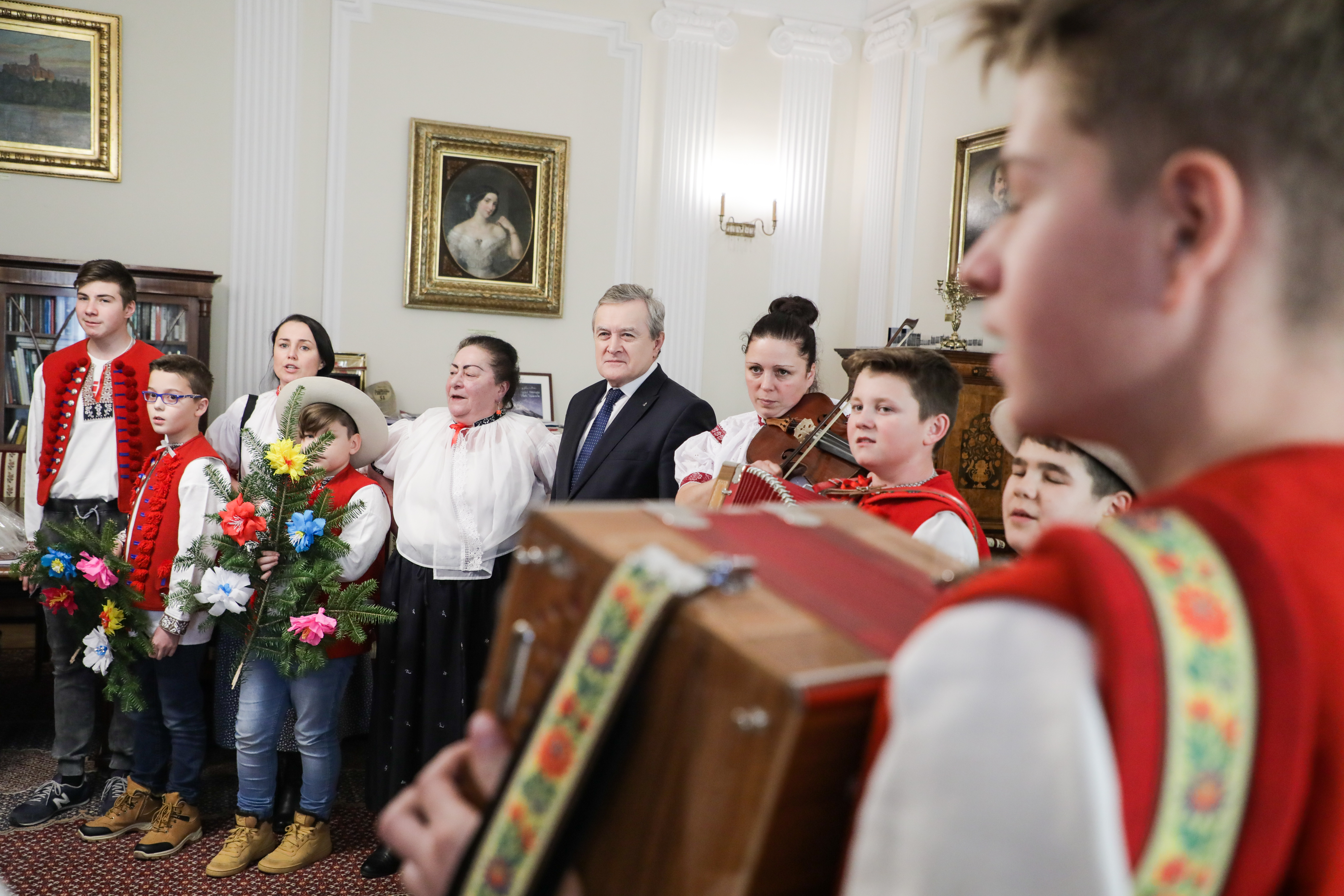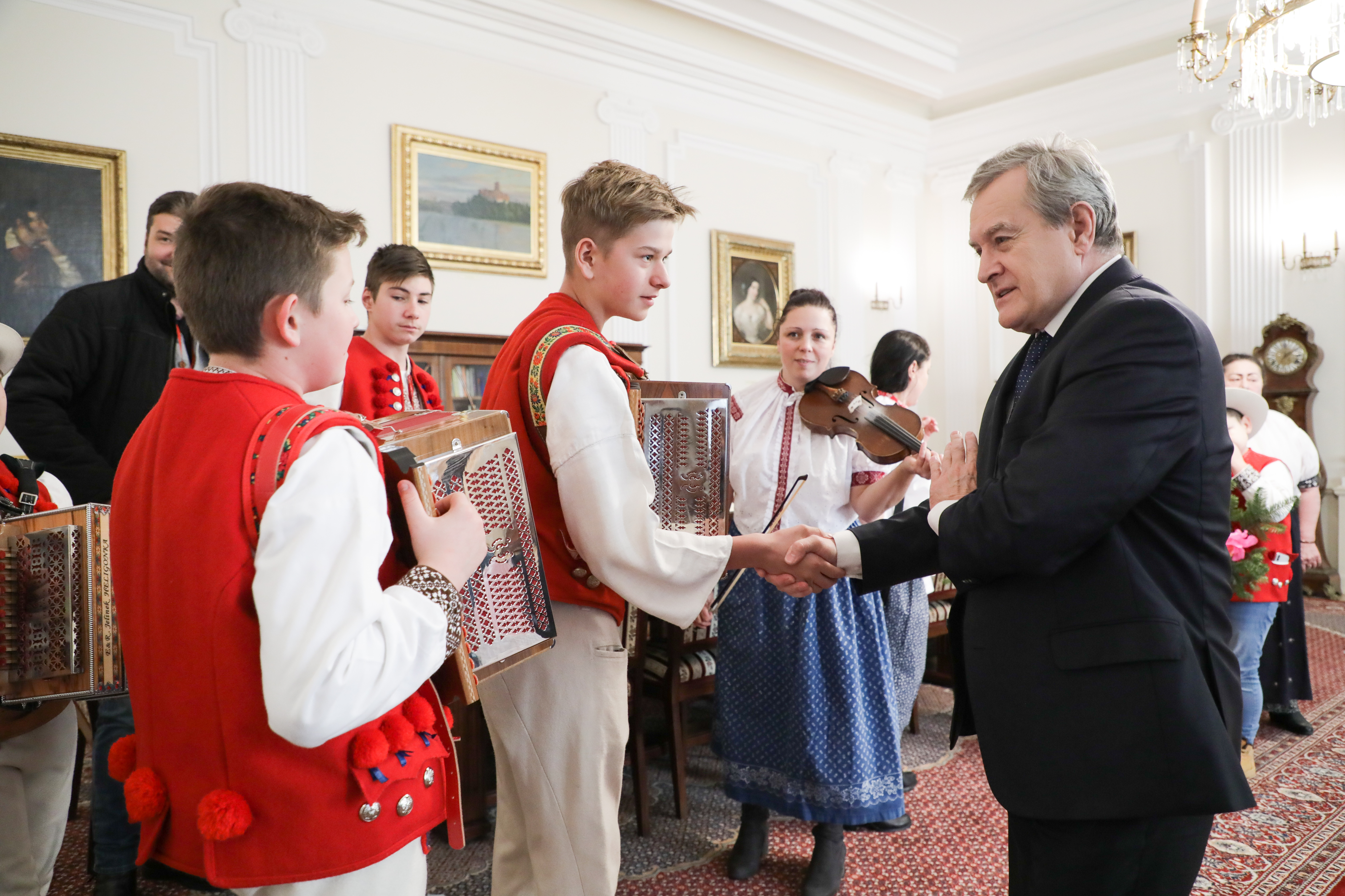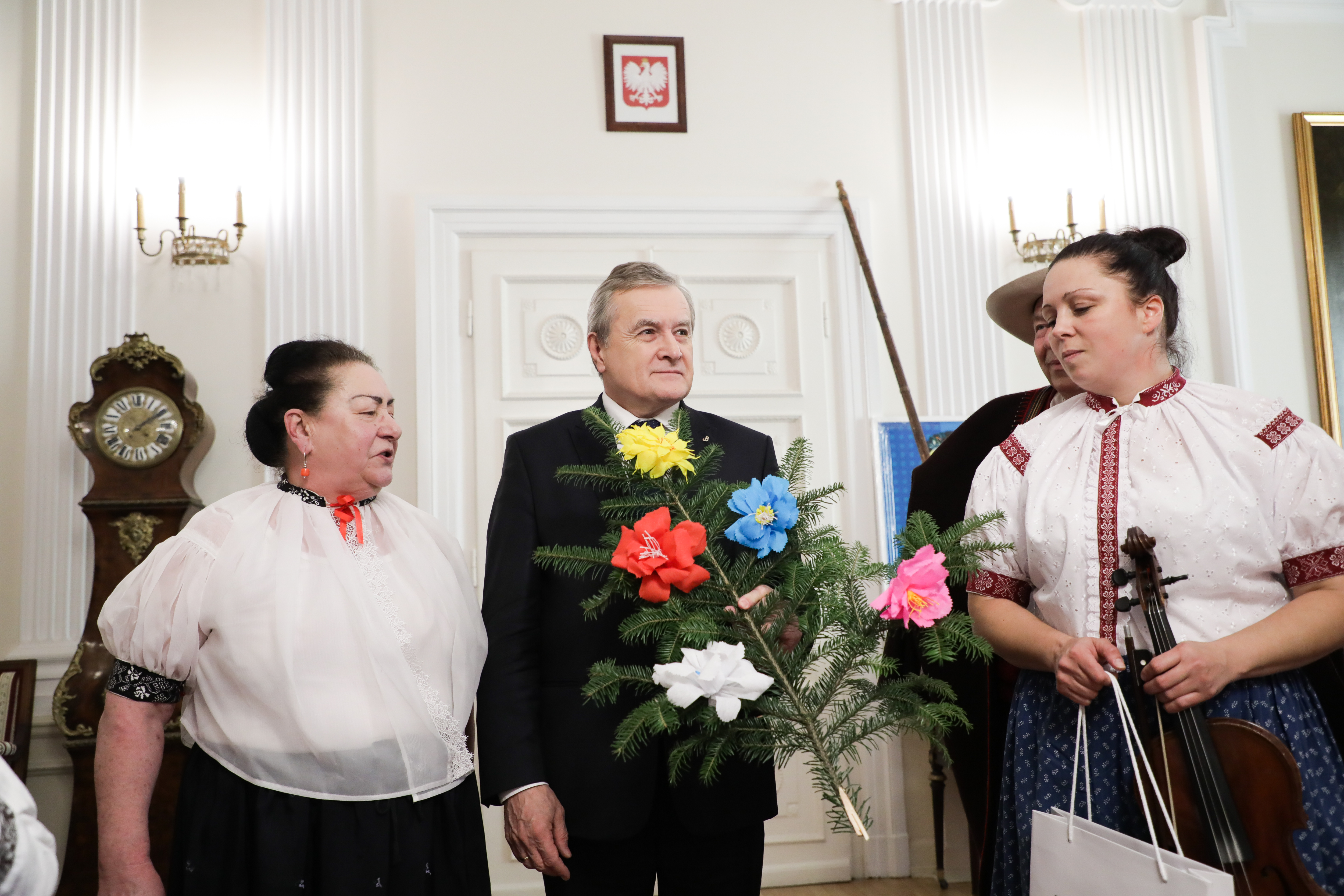 Dziś w Ministerstwie Kultury i Dziedzictwa Narodowego gościliśmy artystów ludowych z Trójwsi Beskidzkiej - Koniakowa, Istebnej i Jaworzynki, członków Regionalnego Zespołu „Koniaków” z Koniakowa. Większość z nich to młodzi muzycy kultywujący grę na tradycyjnych instrumentach pasterskich m.in. na gajdach, trombitach, fujarkach, rogach czy dzwonkach. Zespół kontynuuje wyjątkową tradycję przekazywaną z pokolenia na pokolenie w Beskidzie Śląskim. Obecność zespołu w Warszawie wiąże się z udziałem w rozpoczynającym się już 30 listopada XXXXIX Konkursie Gry na Instrumentach Pasterskich im. Kazimierza Uszyńskiego w Ciechanowcu, corocznie wspieranym przez MKiDN.