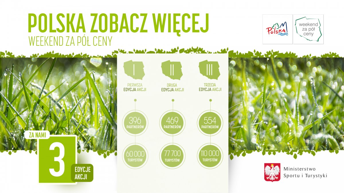 Od dziś można rezerwować oferty w ramach wiosennej edycji „POLSKA ZOBACZ WIĘCEJ – WEEKEND ZA PÓŁ CENY”, która odbędzie się między 9 a 11 marca. Obniżone ceny przygotowało 661 partnerów. To blisko o 20% więcej niż podczas ostatniej akcji – jesień 2017. Wśród ofert znajdują się między innymi obiekty hotelowe i portale rezerwacyjne, przewoźnik PLL LOT, wiele muzeów i innych atrakcji turystycznych. Wydarzenie jest wspólną inicjatywą Ministerstwa Sportu i Turystyki oraz Polskiej Organizacji Turystycznej.