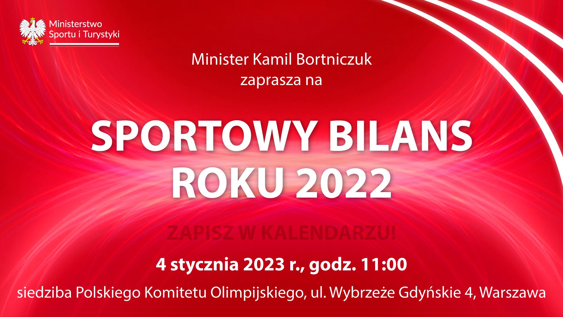 Minister Sportu i Turystyki Kamil Bortniczuk zaprasza przedstawicieli mediów na konferencję prasową pn. „Sportowy bilans roku 2022”. Konferencja odbędzie się 4 stycznia 2023 r. o godzinie 11:00 w siedzibie Polskiego Komitetu Olimpijskiego w Warszawie - ul. Wybrzeże Gdyńskie 4.