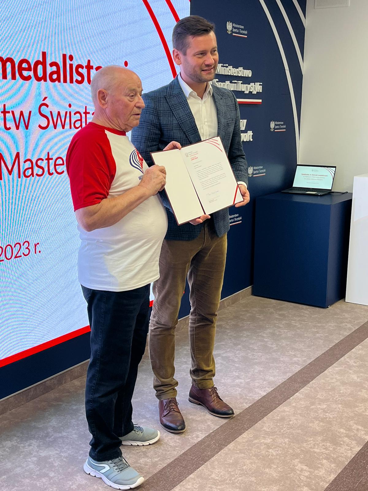 Minister Kamil Bortniczuk złożył na ręce sportowców i przedstawicieli PZLA Masters, wśród których znaleźli się m.in. Janusz Nath oraz Sławomir Krankowski i Wacław Krankowski, listy gratulacyjne.